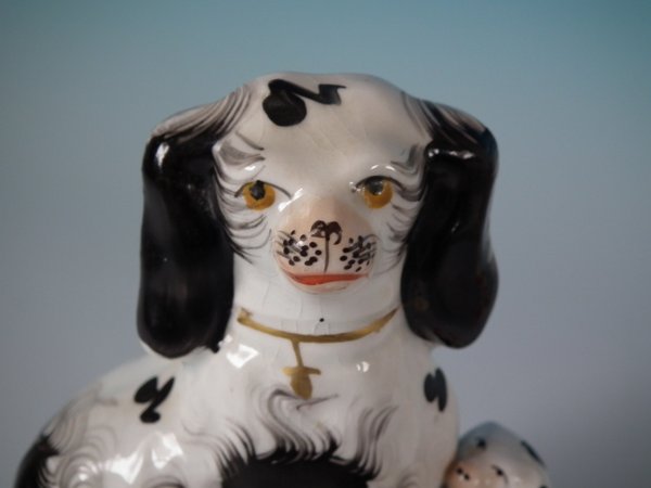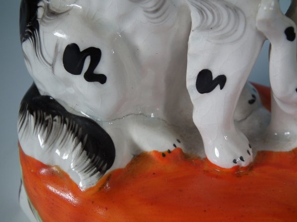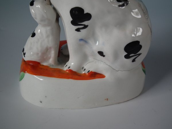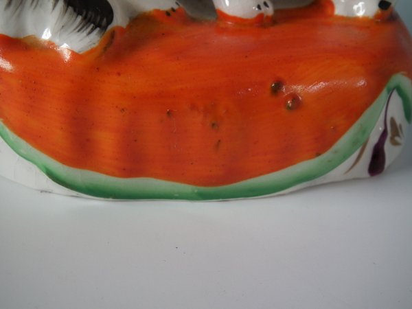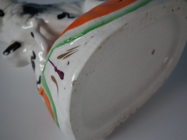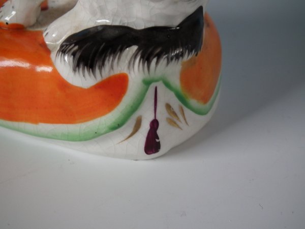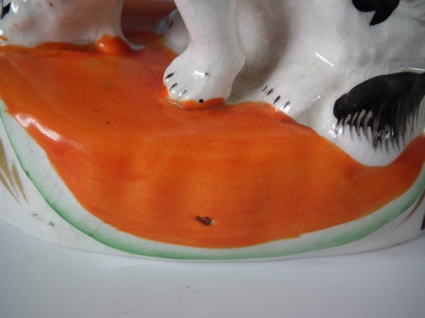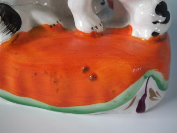 KILN EFFECTS: glaze filled shrinkage crack to the base and the bottom of the spaniel;