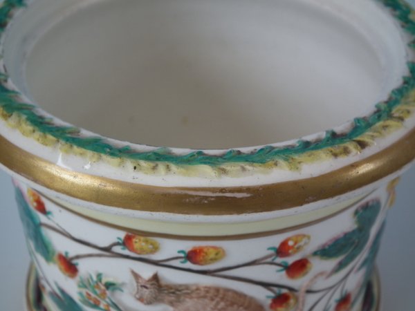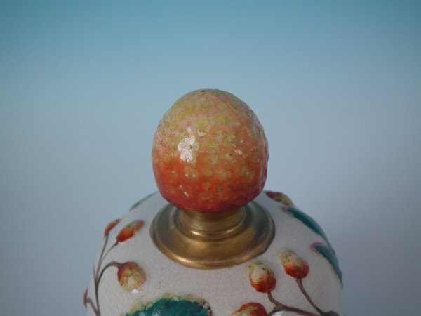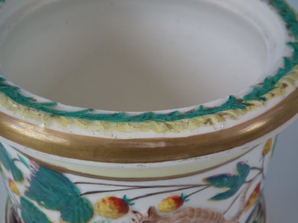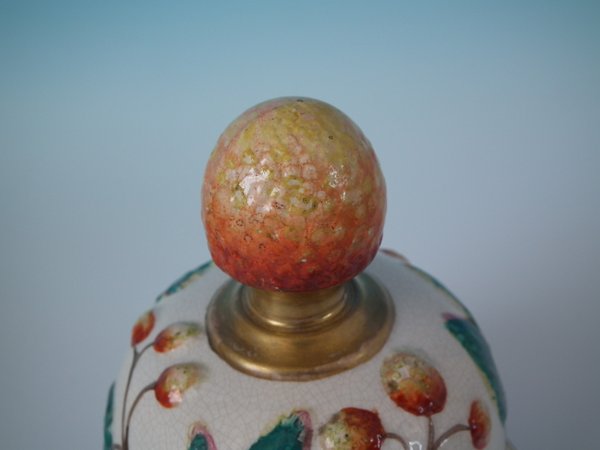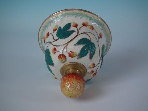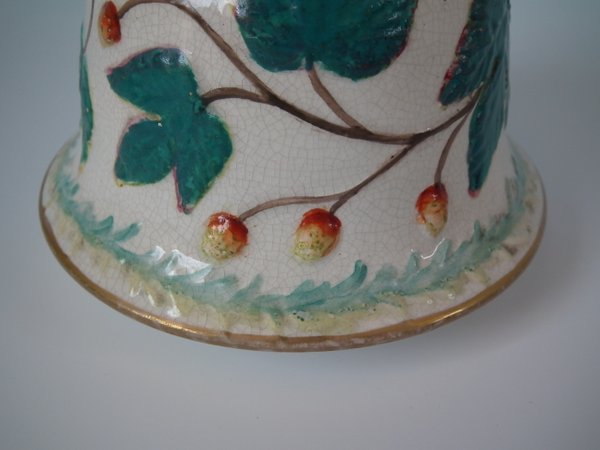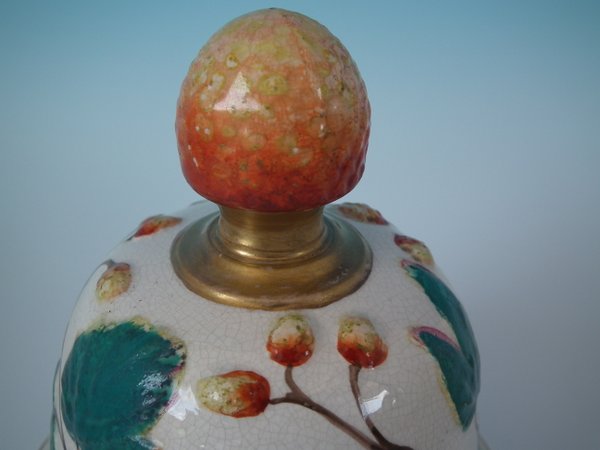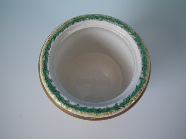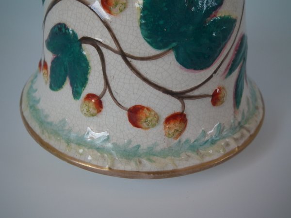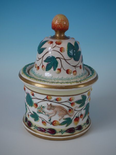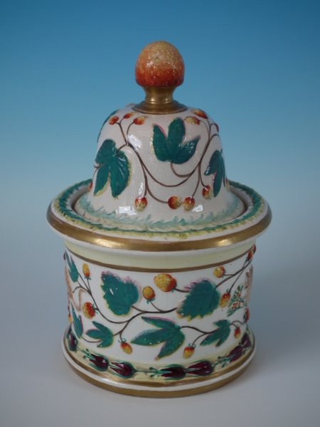 Staffordshire Pottery tobacco jar and cover which features a monkey amongst strawberries and leaves, stood directly on the ground, no base.