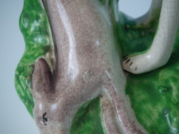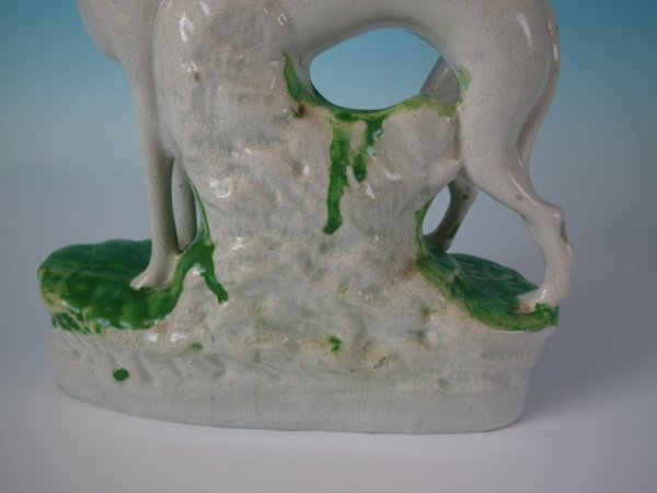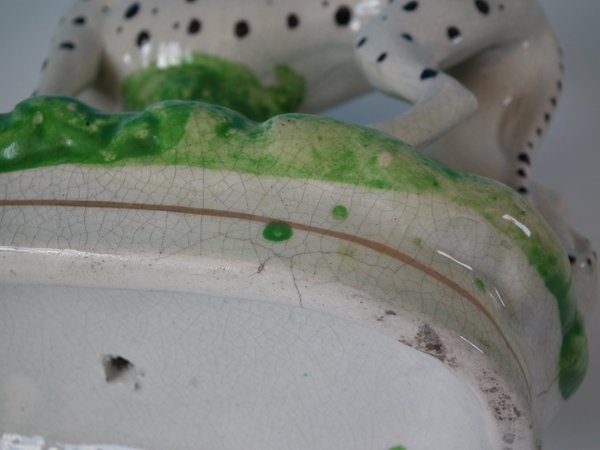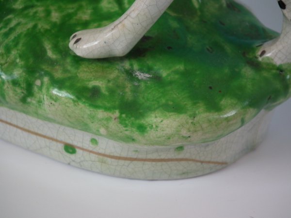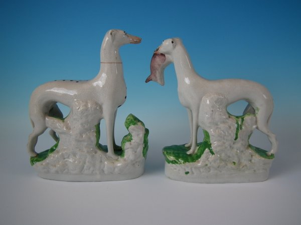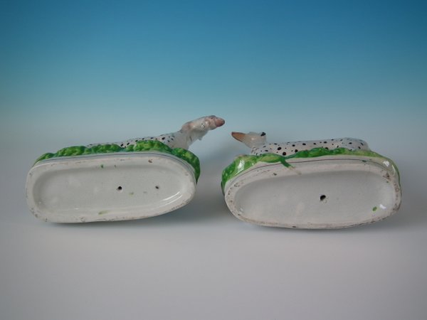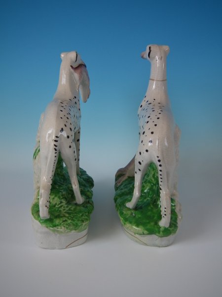 Pair of Staffordshire Pottery figures which feature spotted dalmatians (whippets decorated with spots!) with hares, stood on an oblong base.