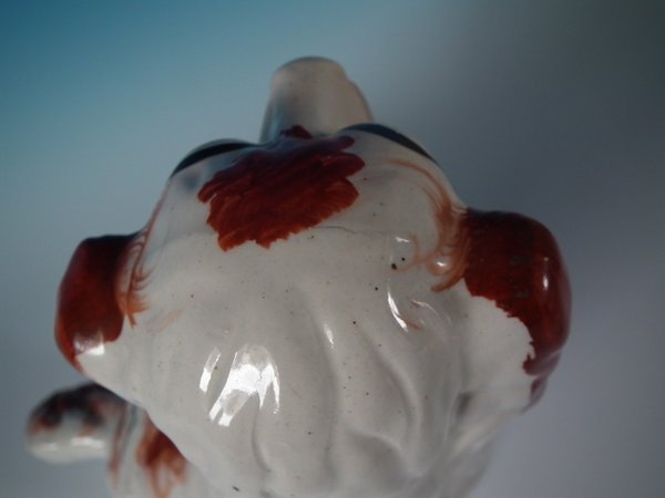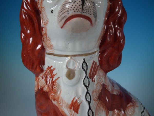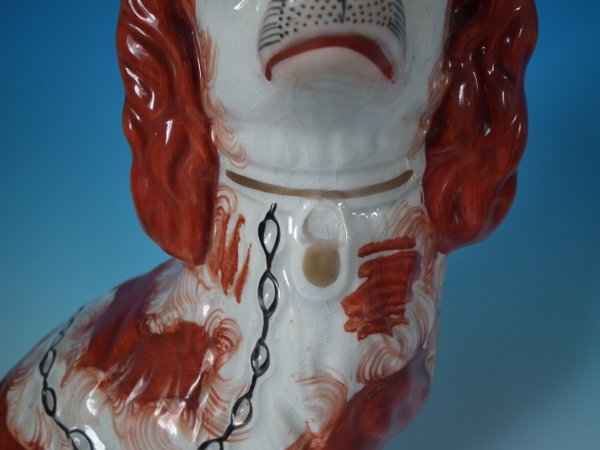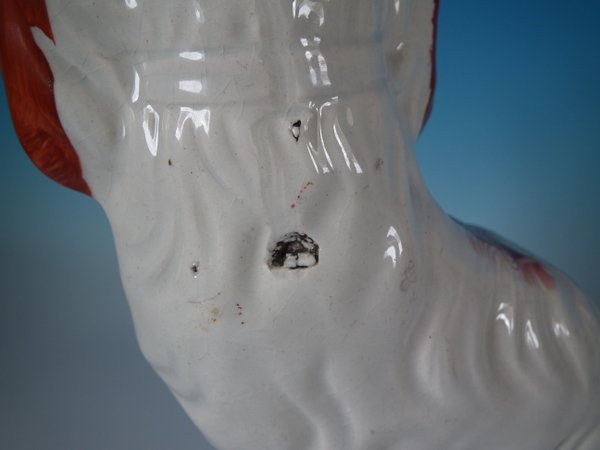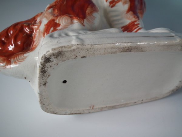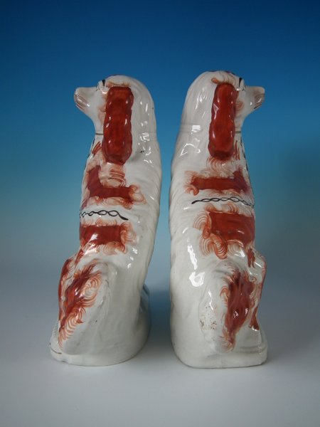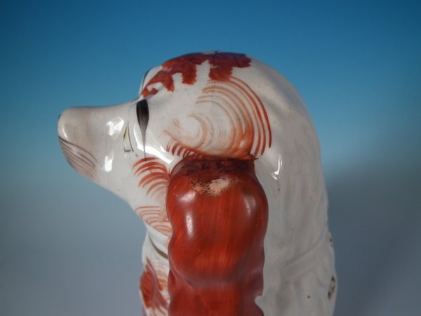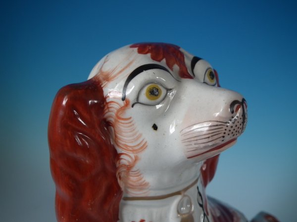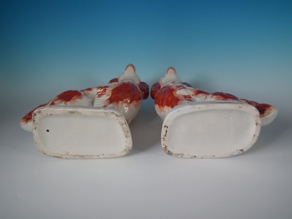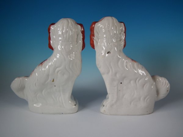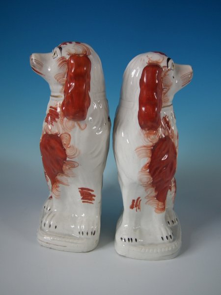 Victorian, circa 1860. Tallest is 12.2ins high, 9.8ins wide, 4.3ins depth. Pair of Staffordshire Pottery figures which feature a spaniel,