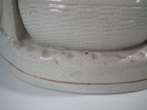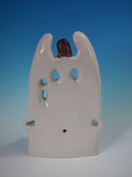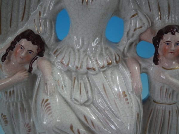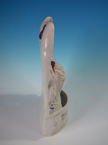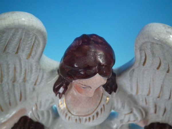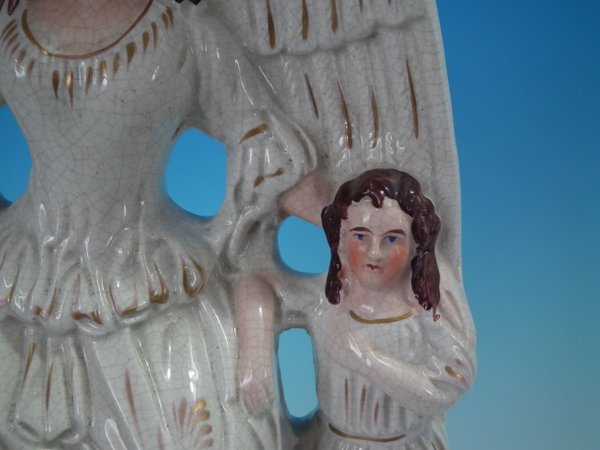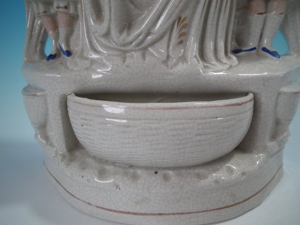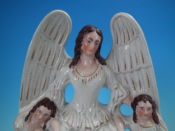 Victorian, circa 1860. 14.8ins high, 9.1ins wide, 3.9ins depth. Staffordshire Pottery holy water stoup with a religious theme which features an Angel and two children, seated on a shaped base.
