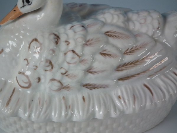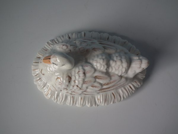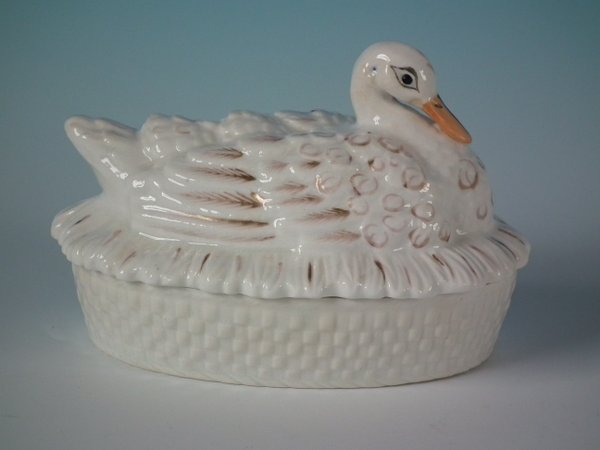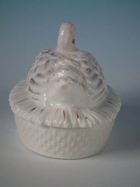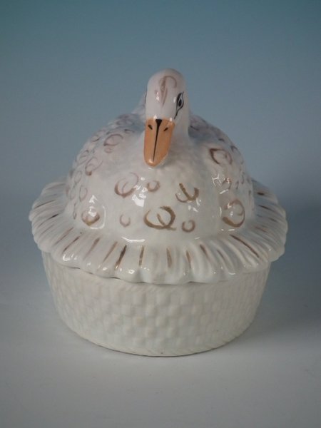 Victorian, circa 1860. 3.7ins high, 5.9ins wide, 3.9ins depth. Staffordshire Pottery tureen with cover which features a duck,