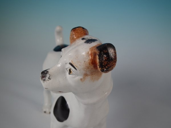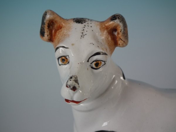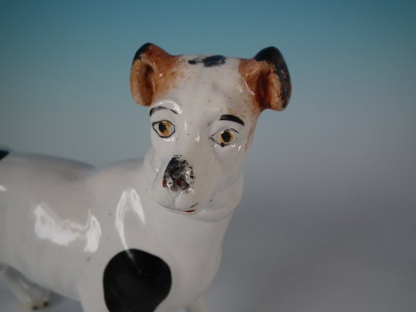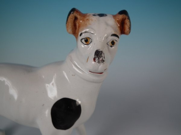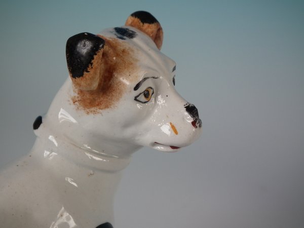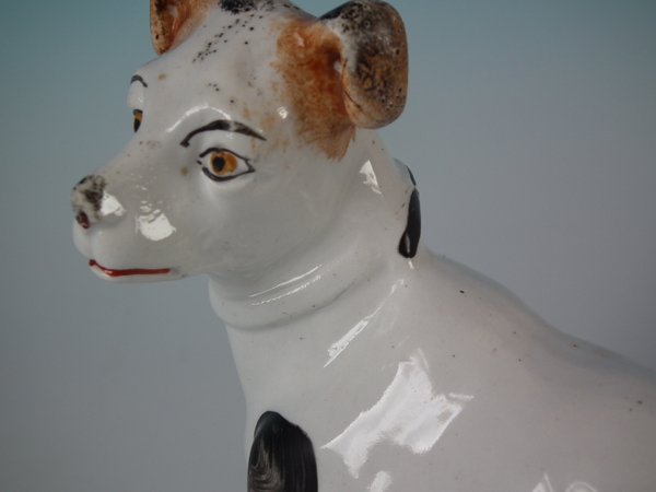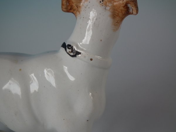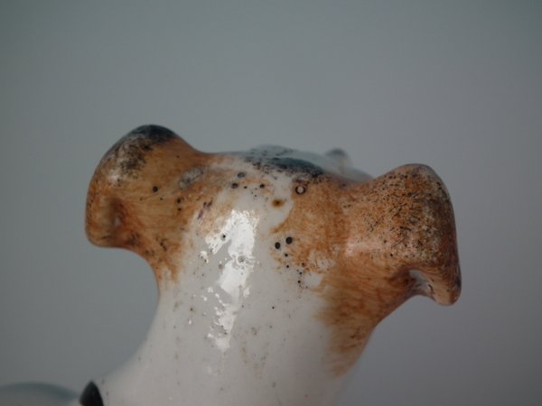 KILN EFFECTS: kiln soot caught in the glaze to dog's head and hind leg;