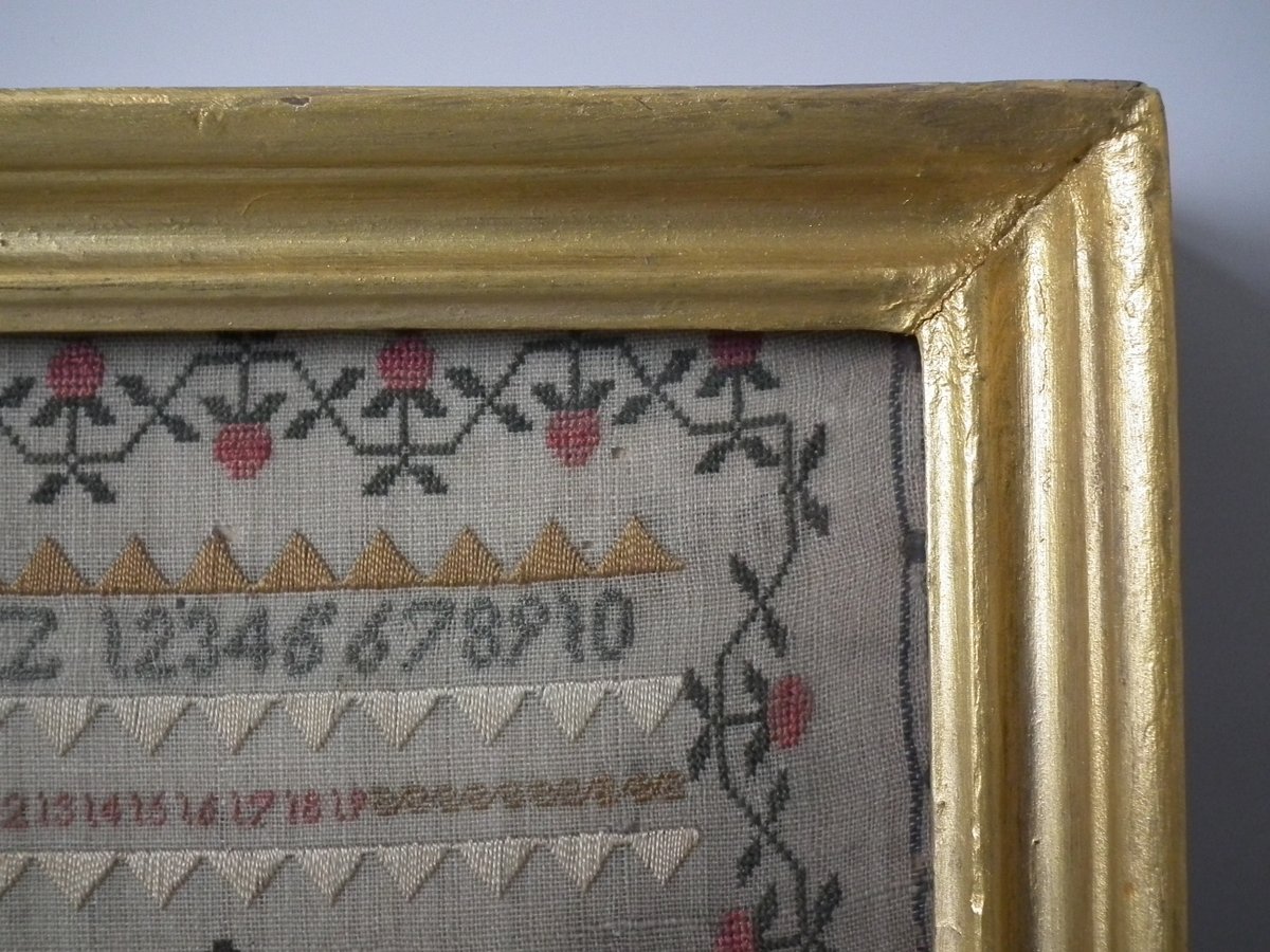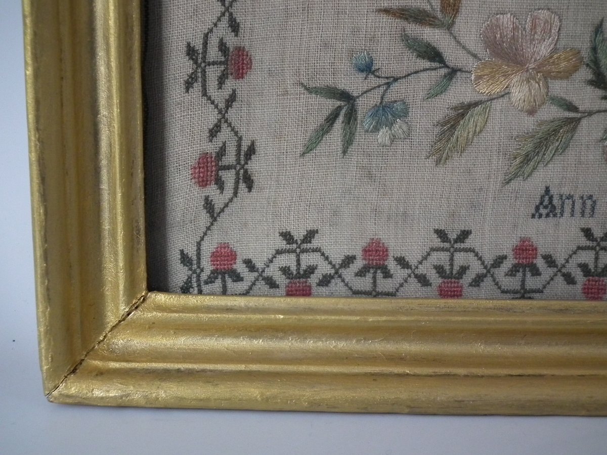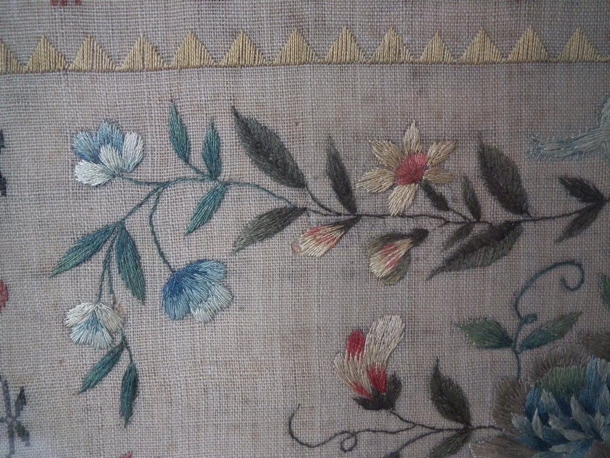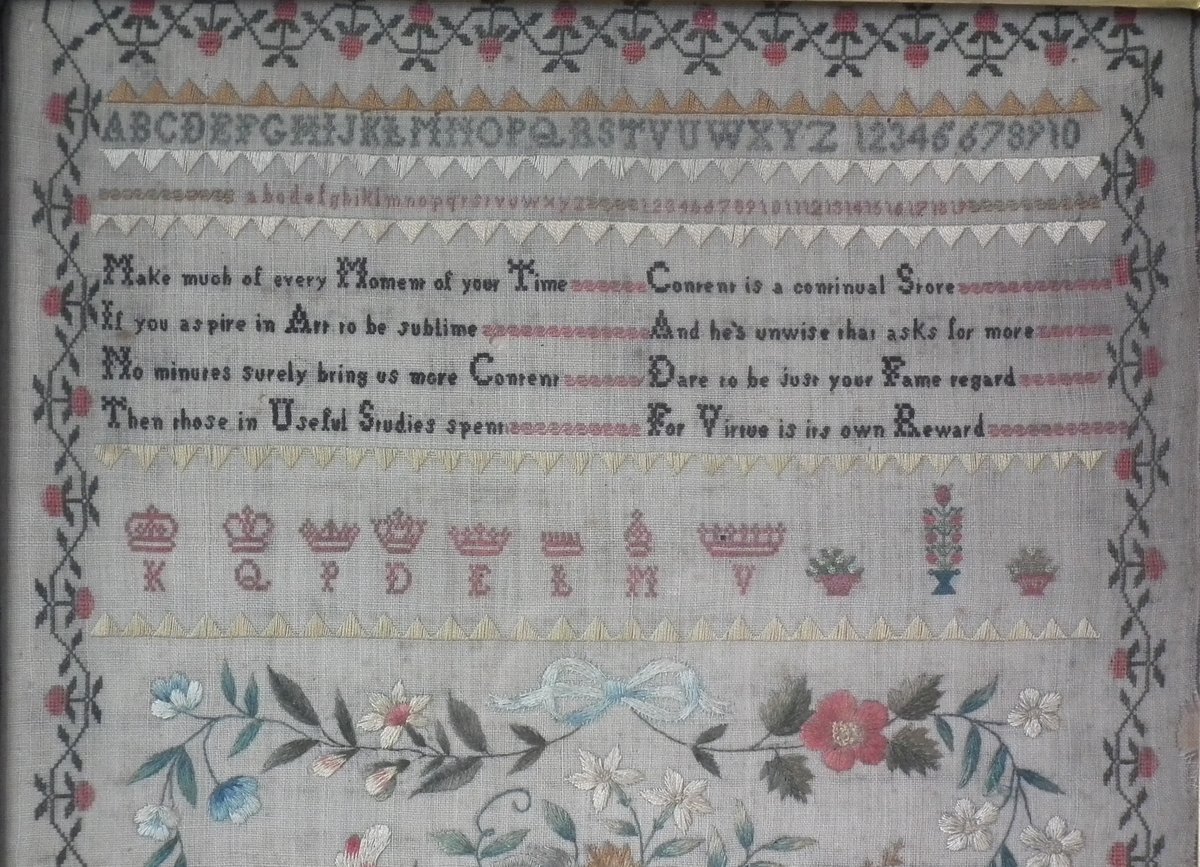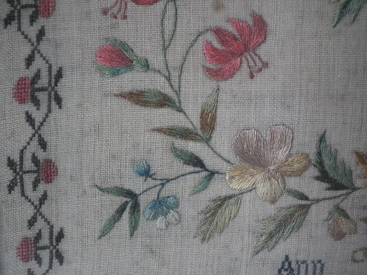 The sampler is worked in silk on linen ground, in a variety of stitches.