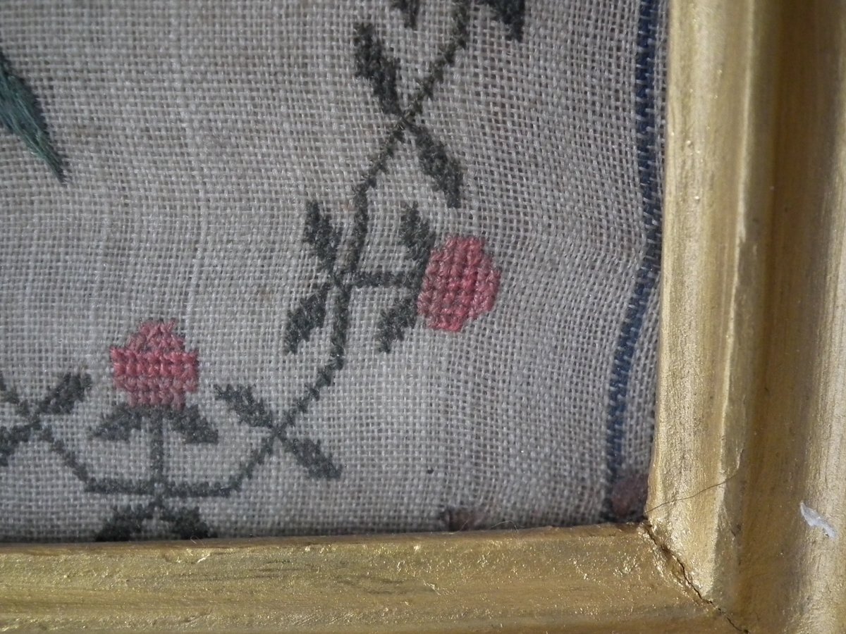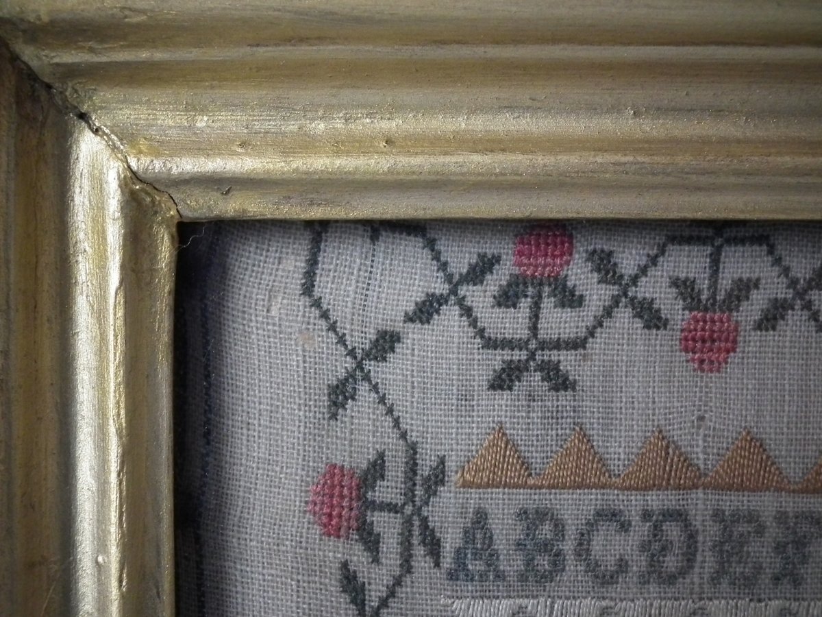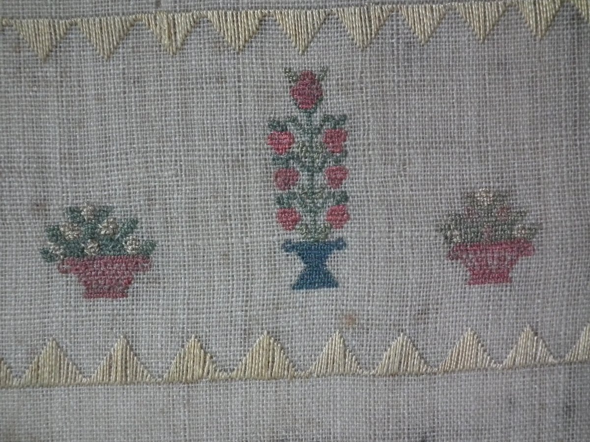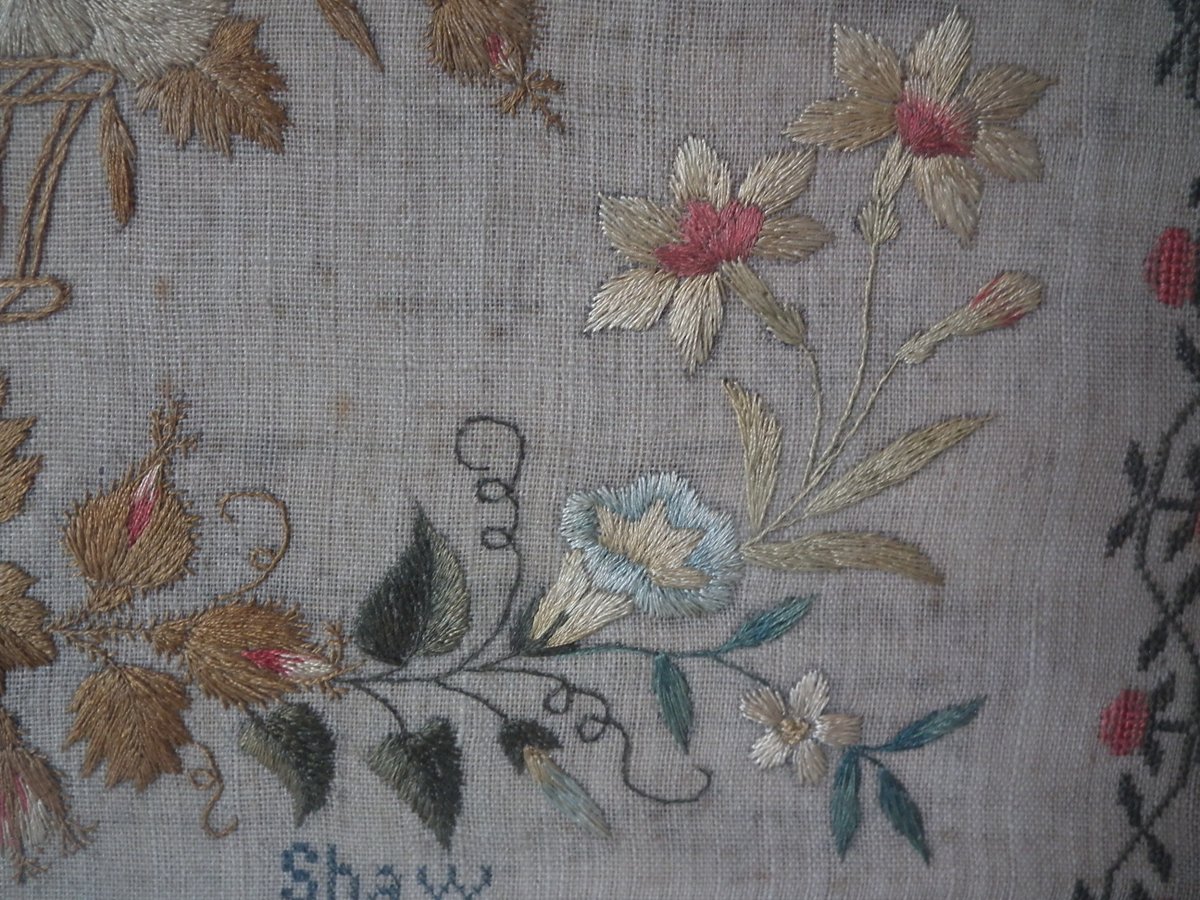 The sampler is worked in silk on linen ground, in a variety of stitches.
