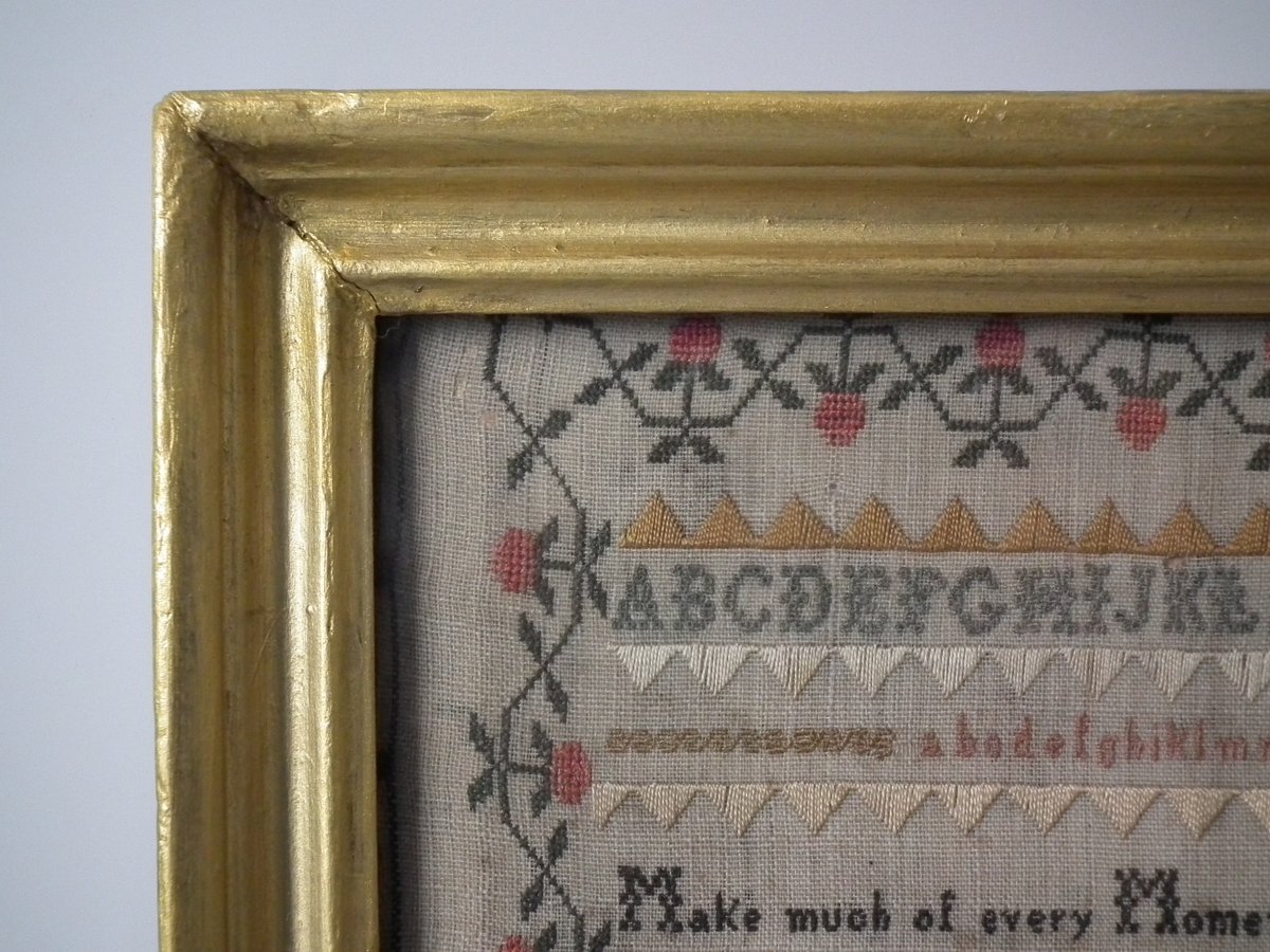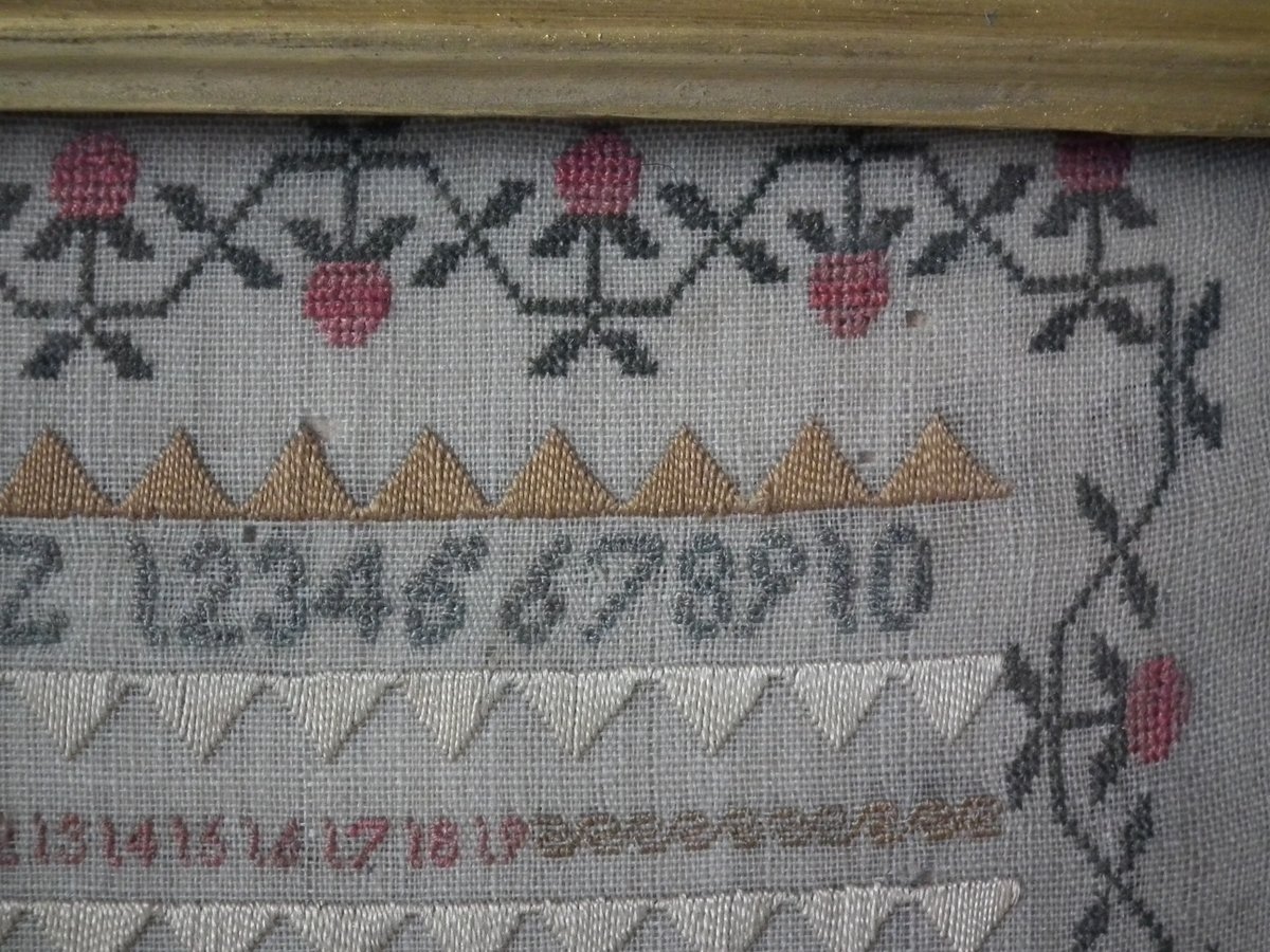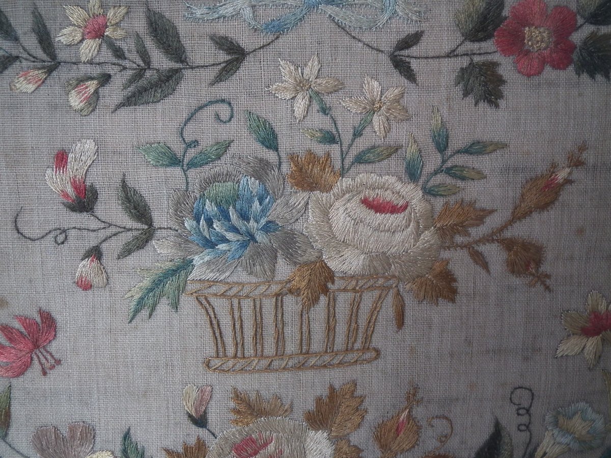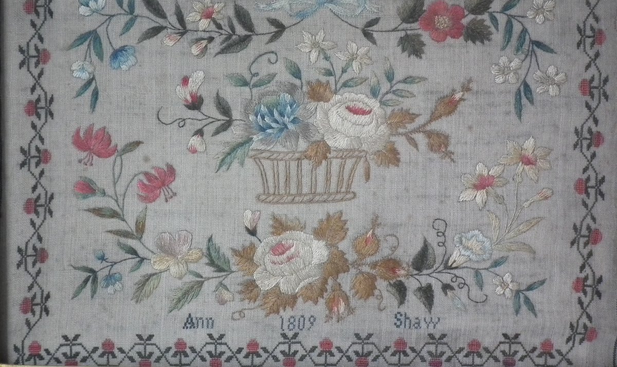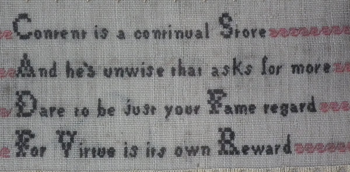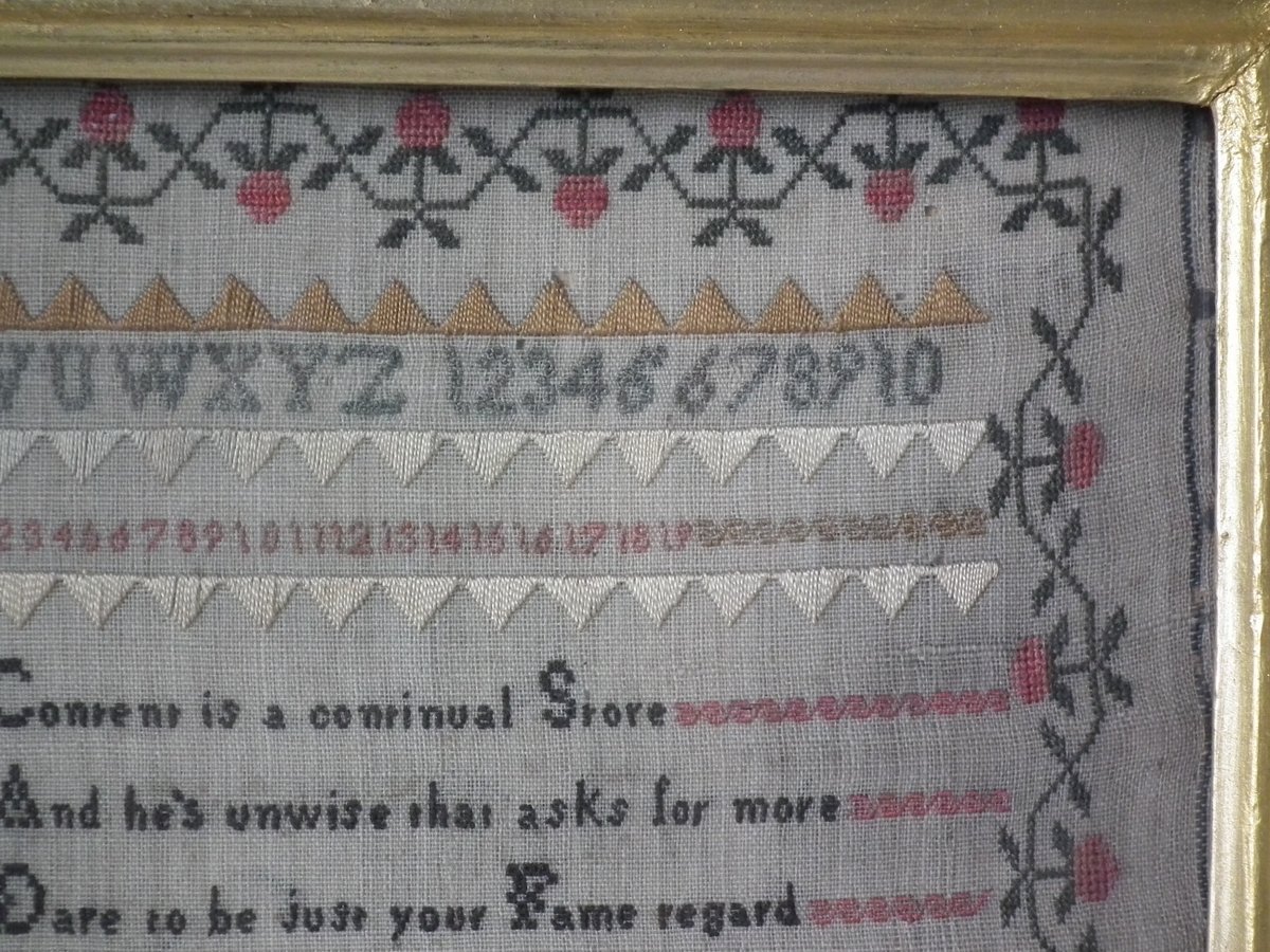 The sampler is worked in silk on linen ground, in a variety of stitches.