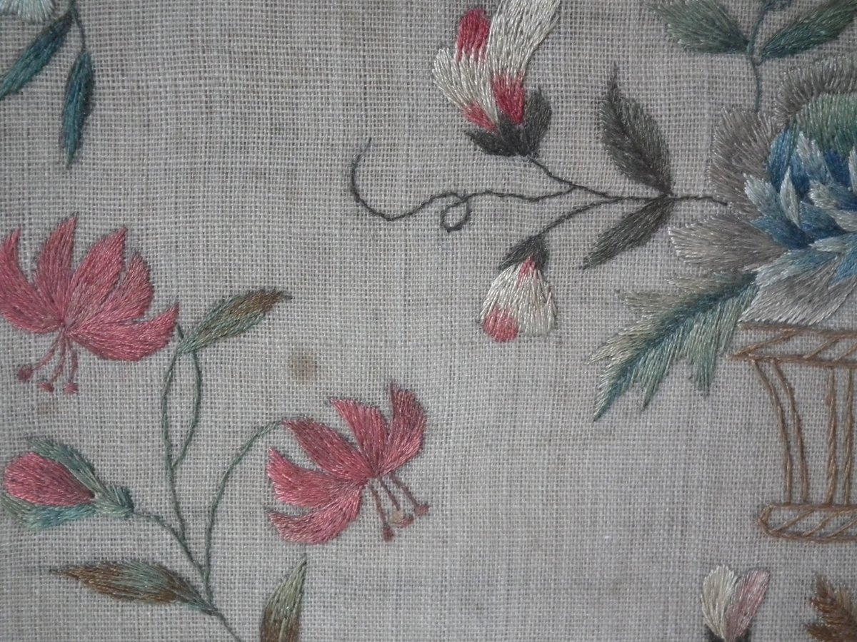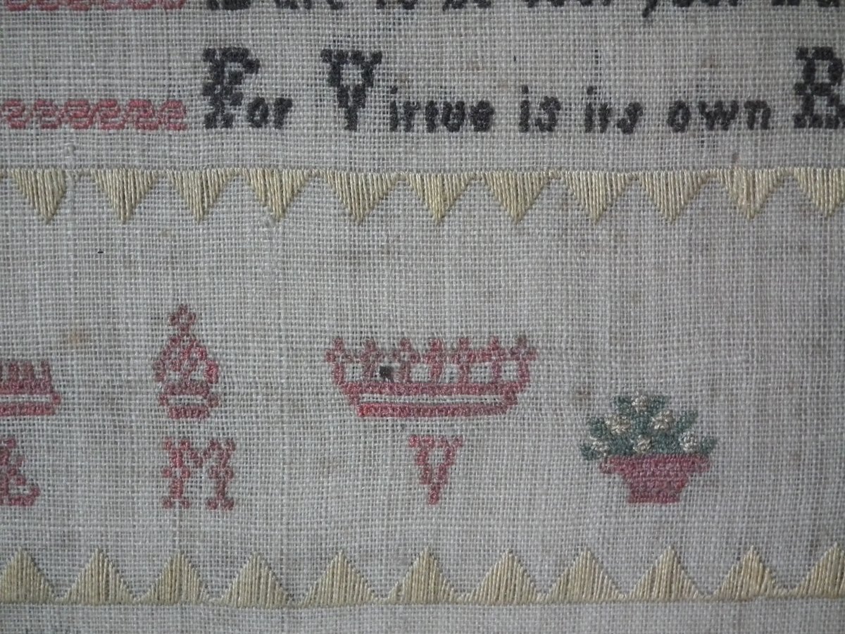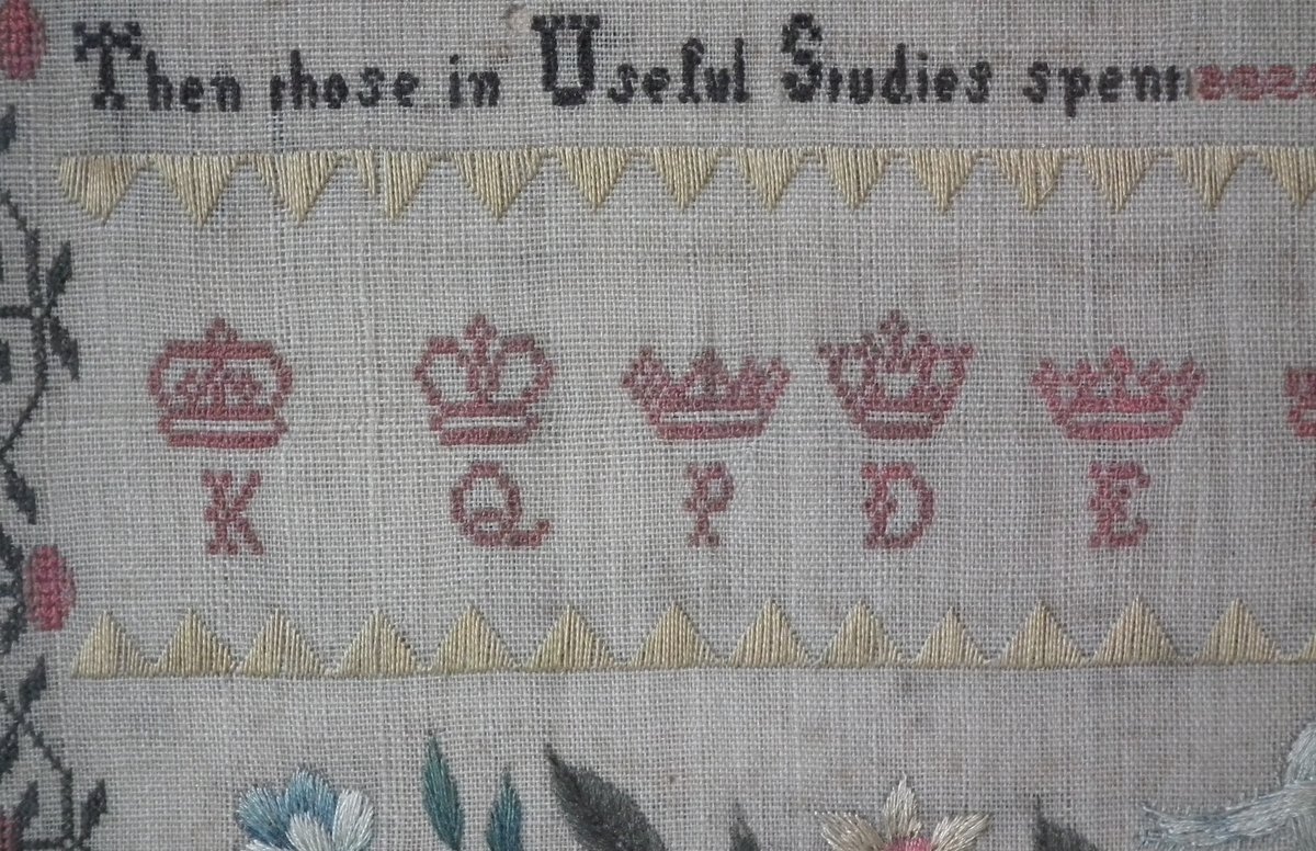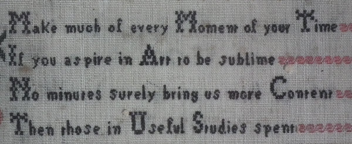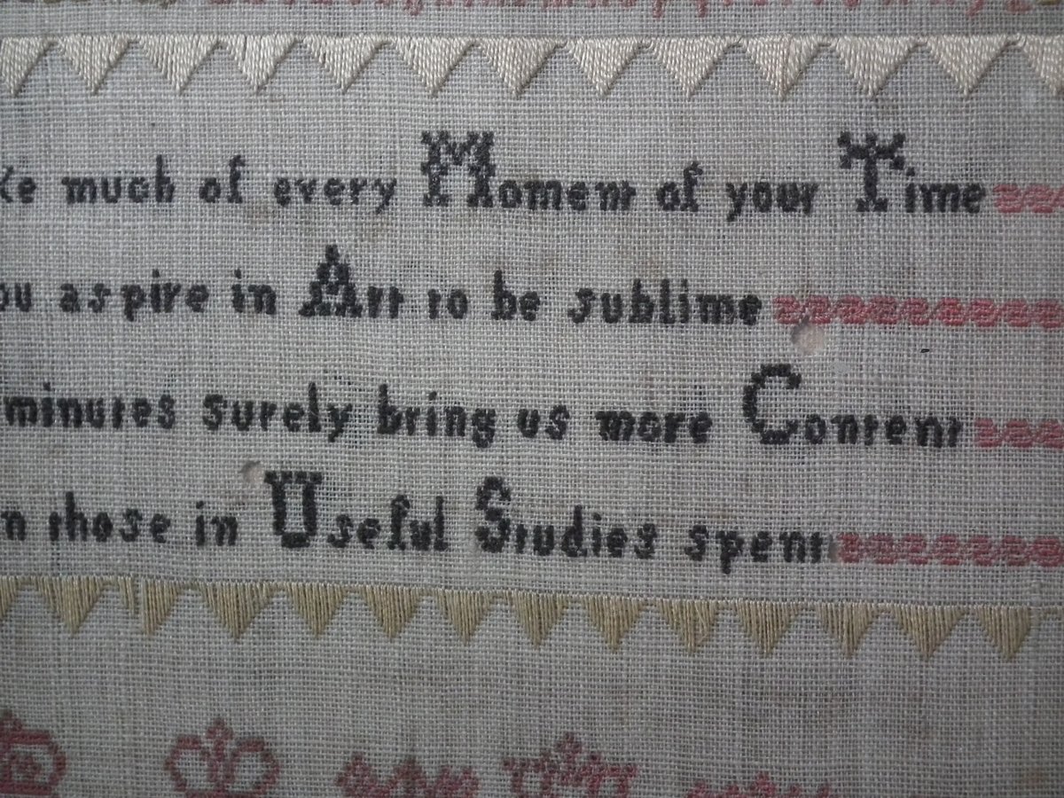 The sampler is worked in silk on linen ground, in a variety of stitches.