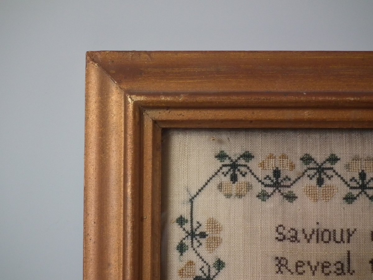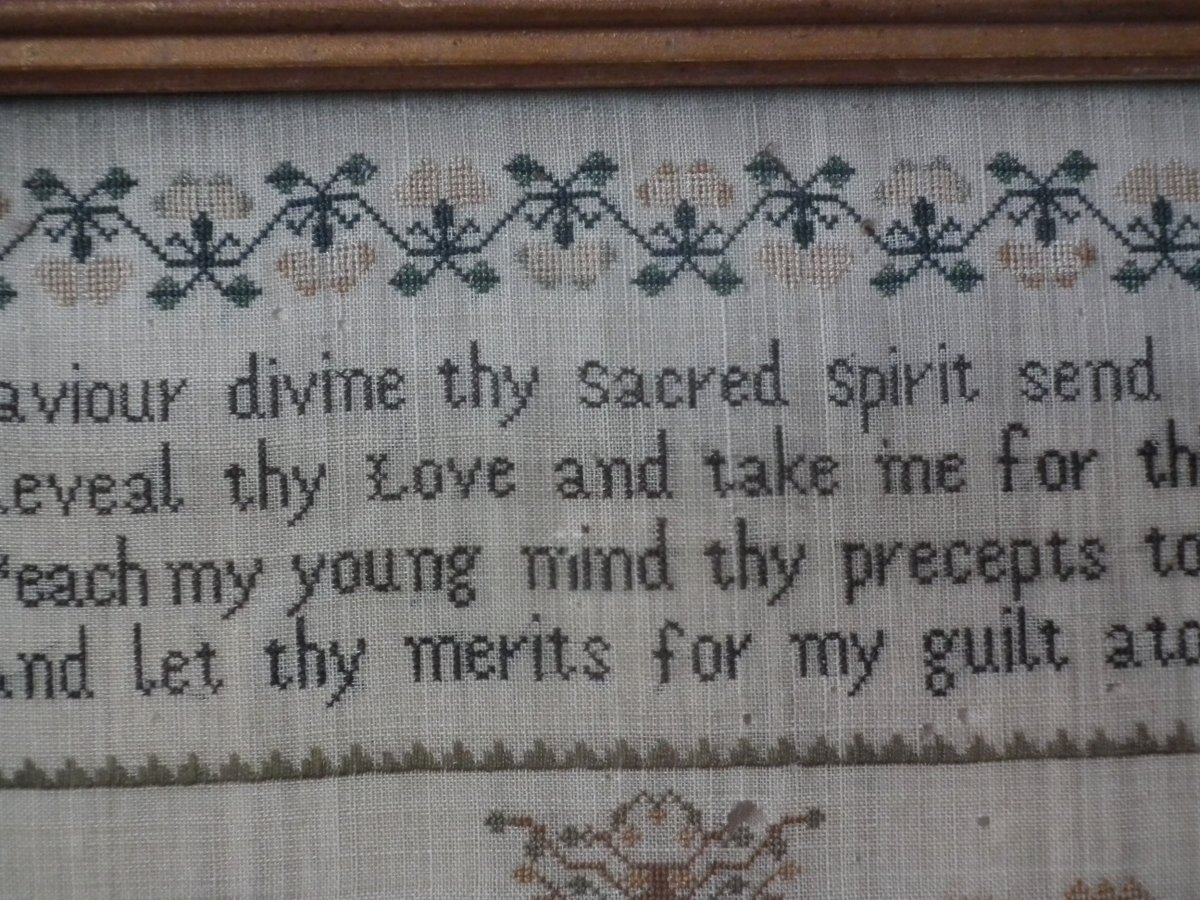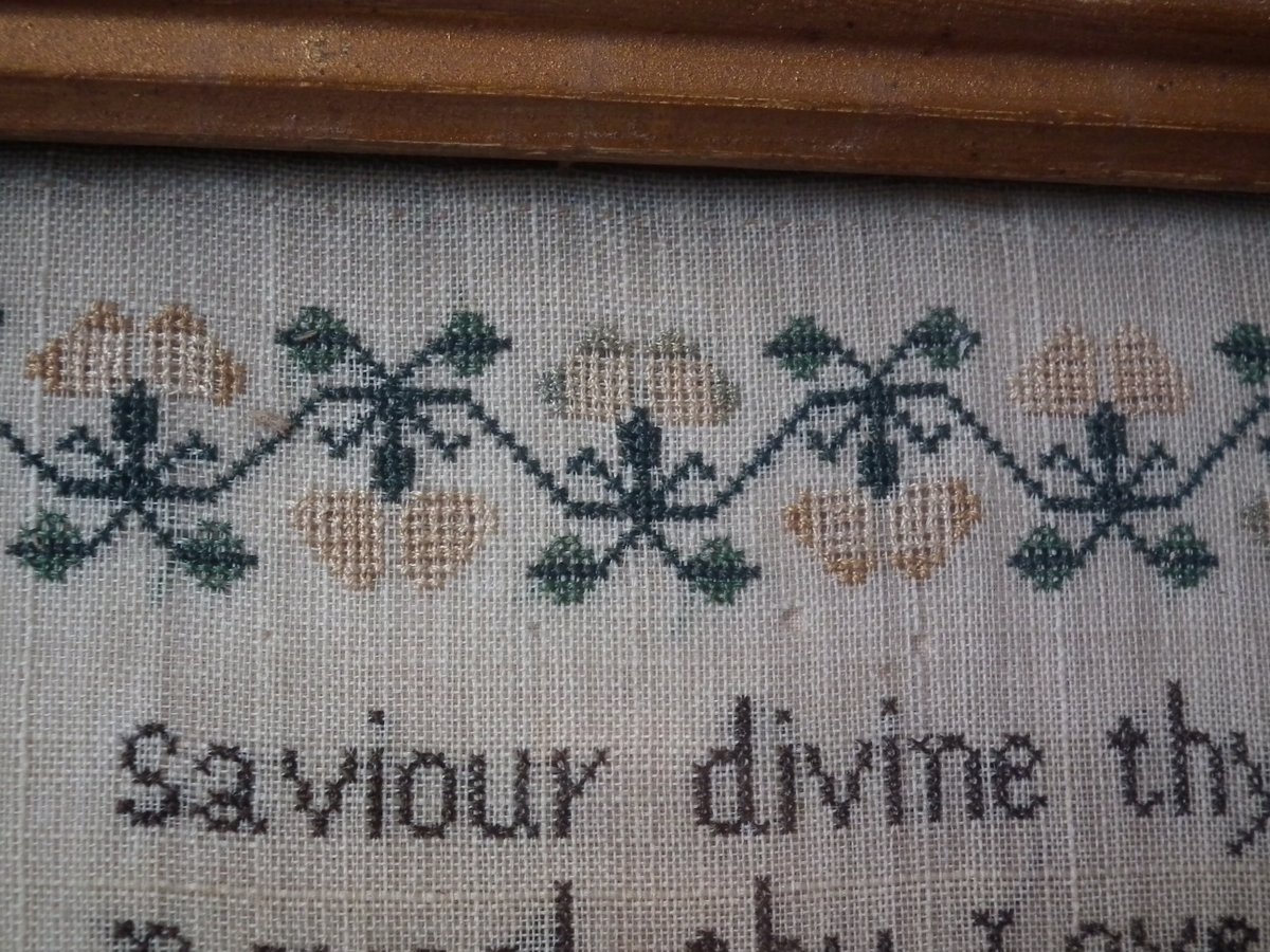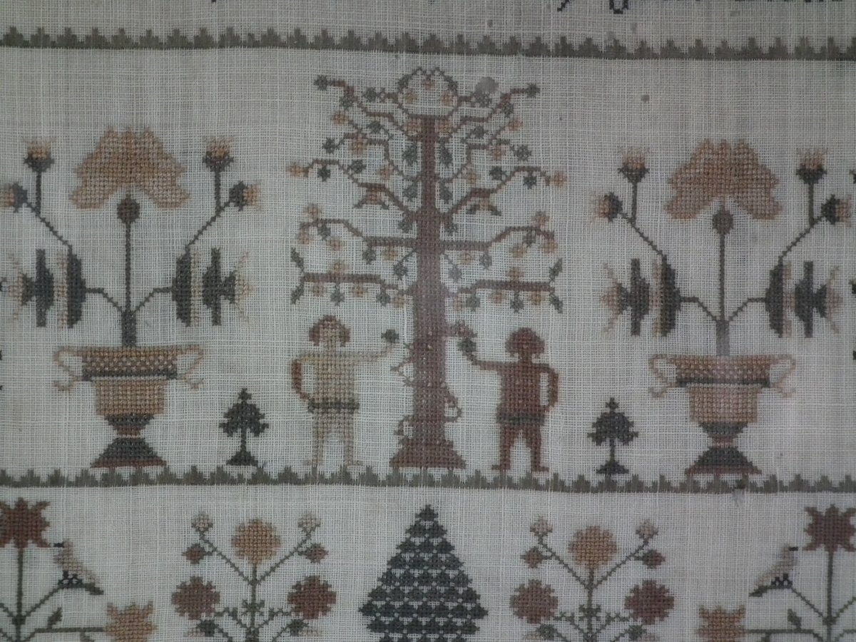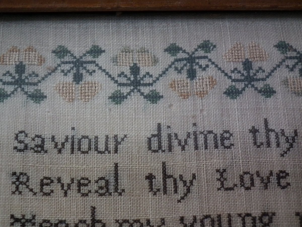 The sampler is worked in silk on linen ground, in cross stitch throughout.