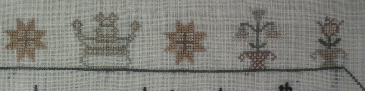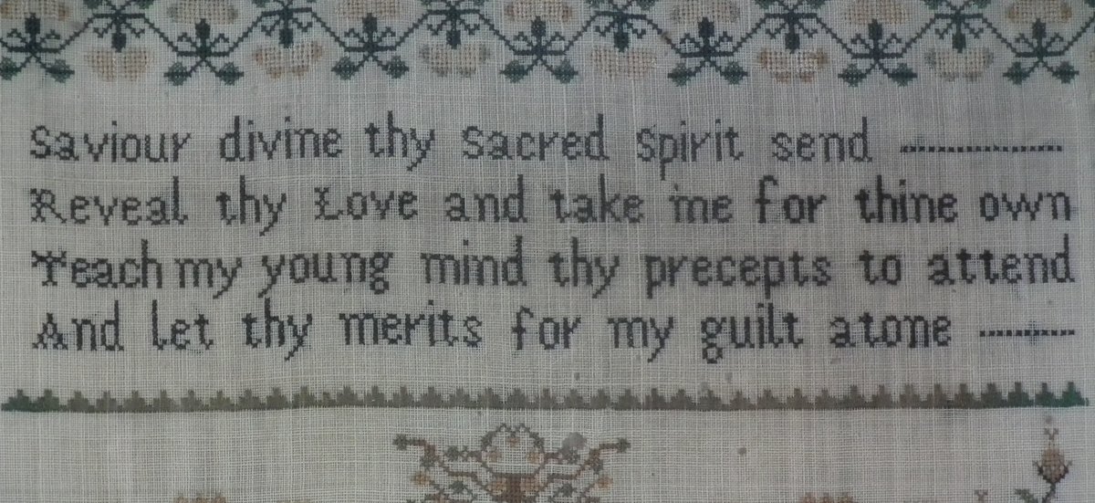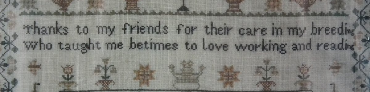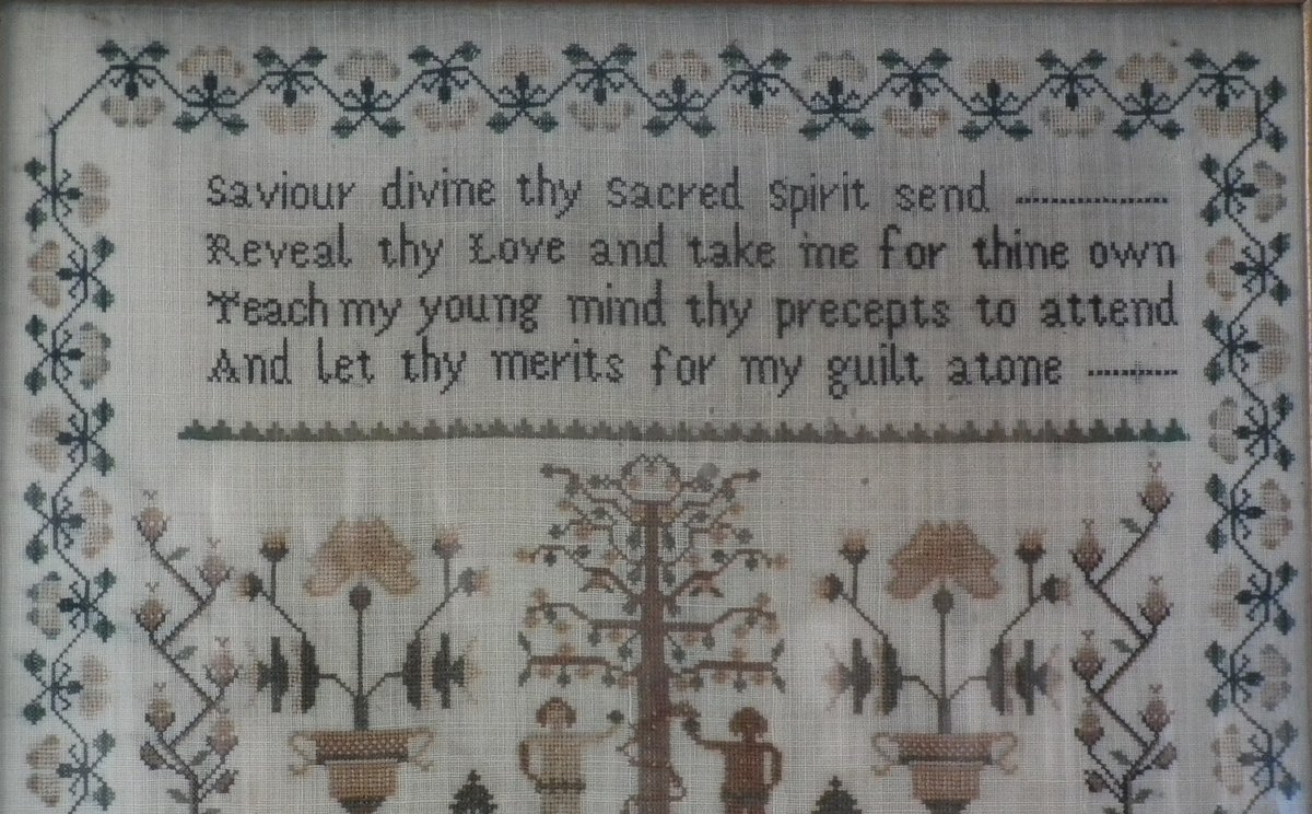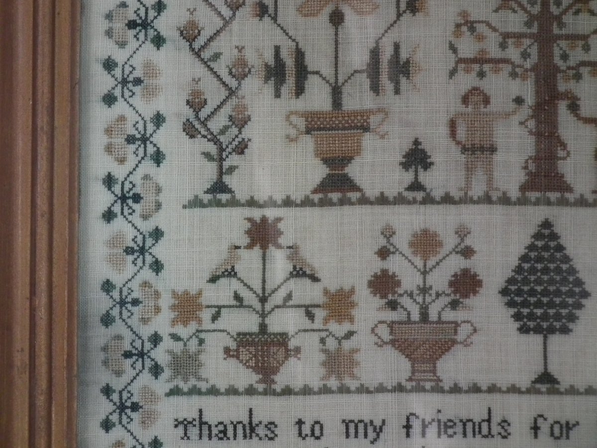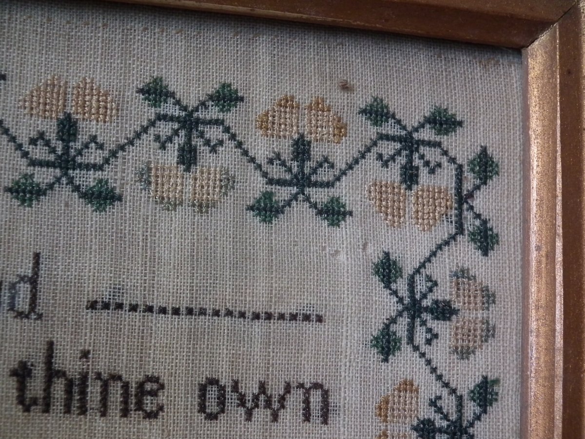The sampler is worked in silk on linen ground, in cross stitch throughout.