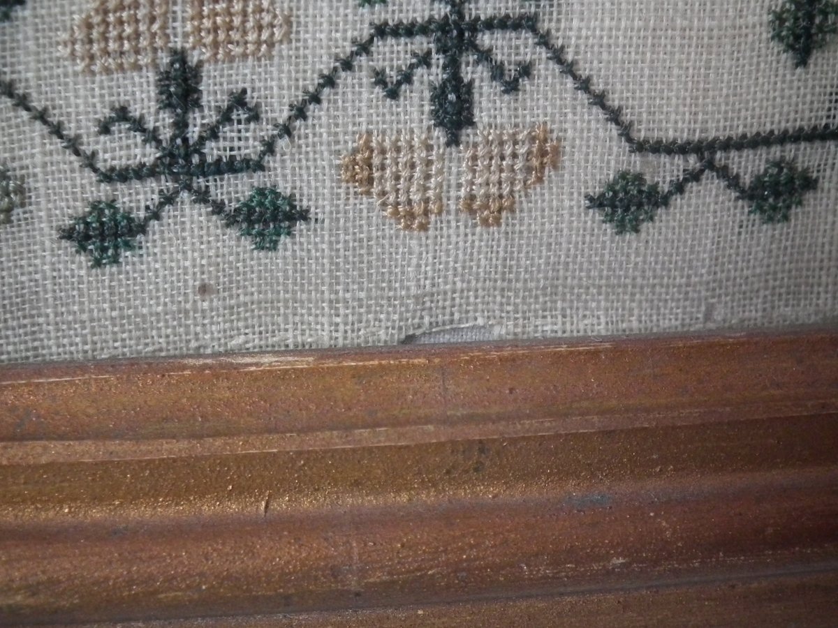 No stitch losses other than to the holed areas. Colours are slightly faded, but still well defined. Neatly and evenly stretched. Frame in good condition, ready to hang.