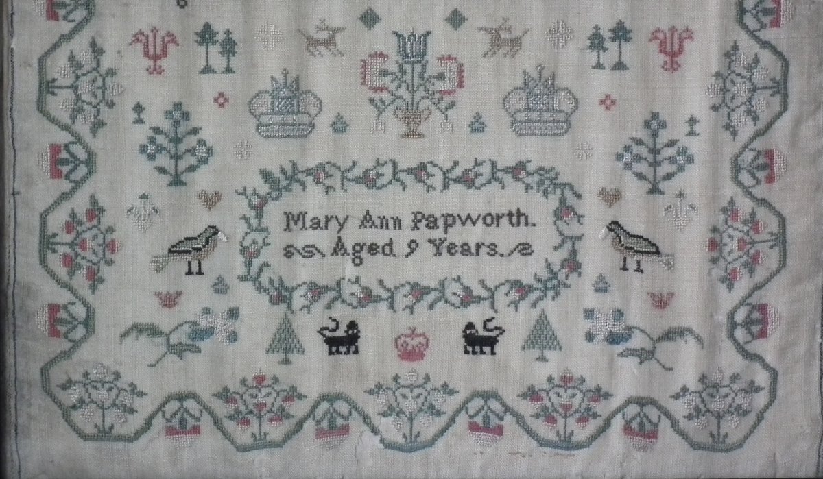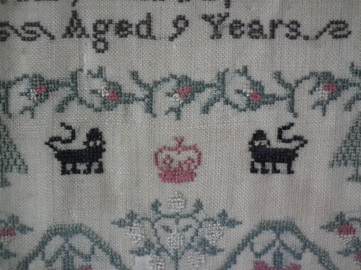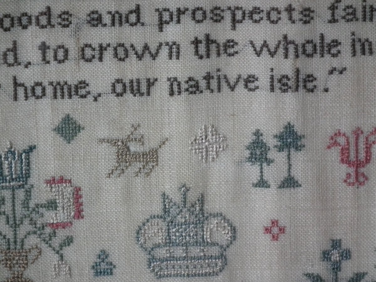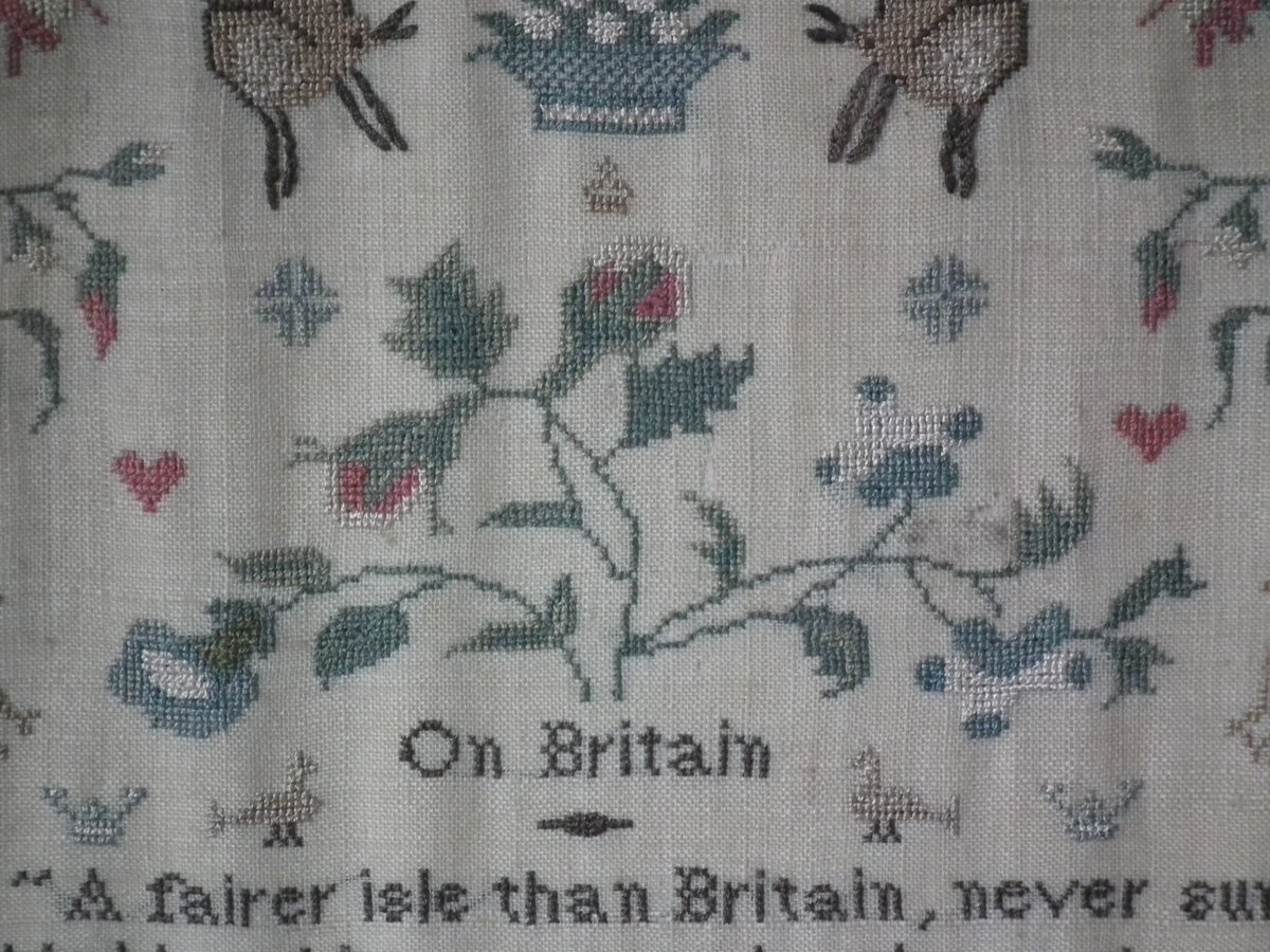 George IV, dated 1822. 17ins high by 13ins wide. Circa 1830 Mary Ann Papworth Sampler.