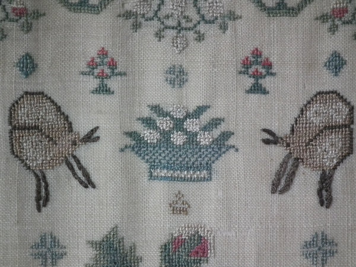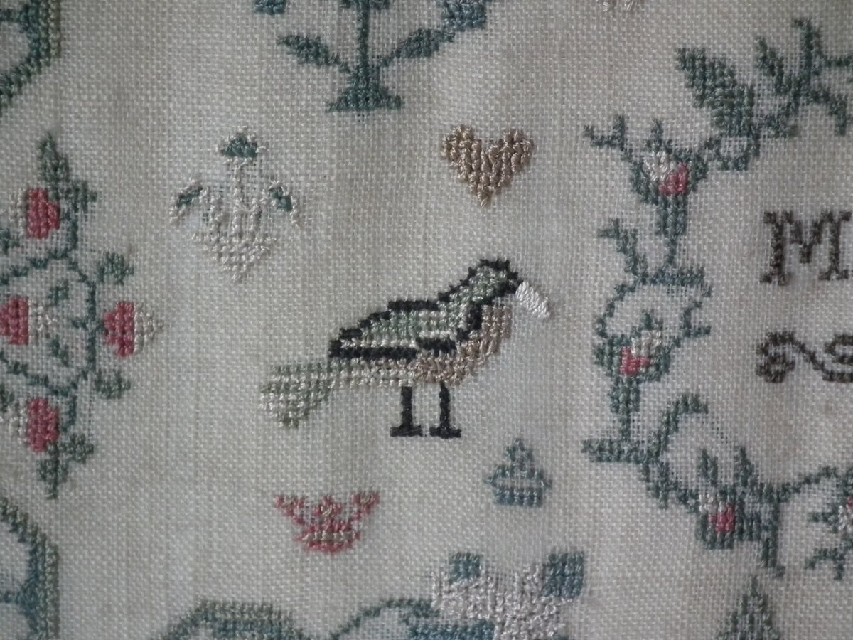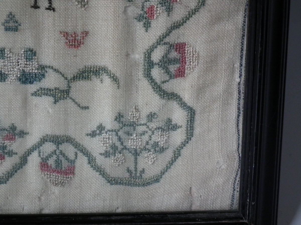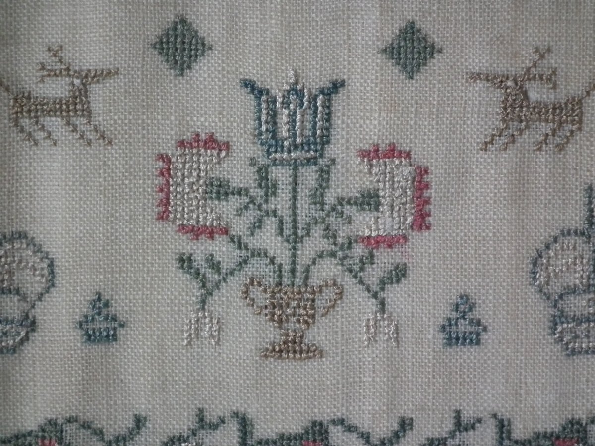 The sampler is worked in silk on linen ground, in cross stitch throughout.