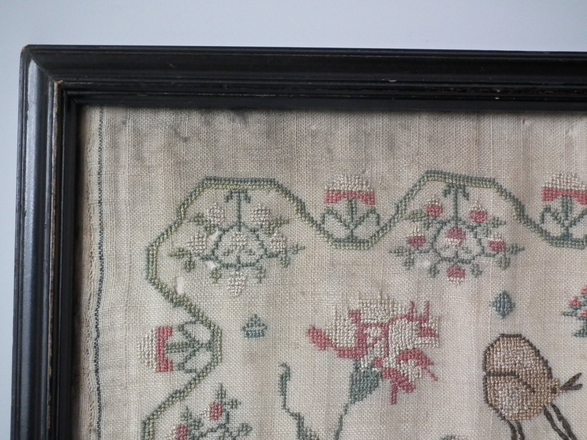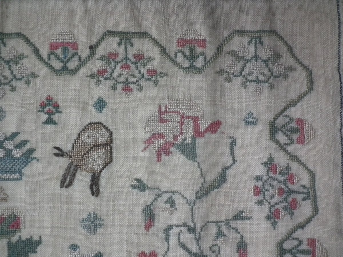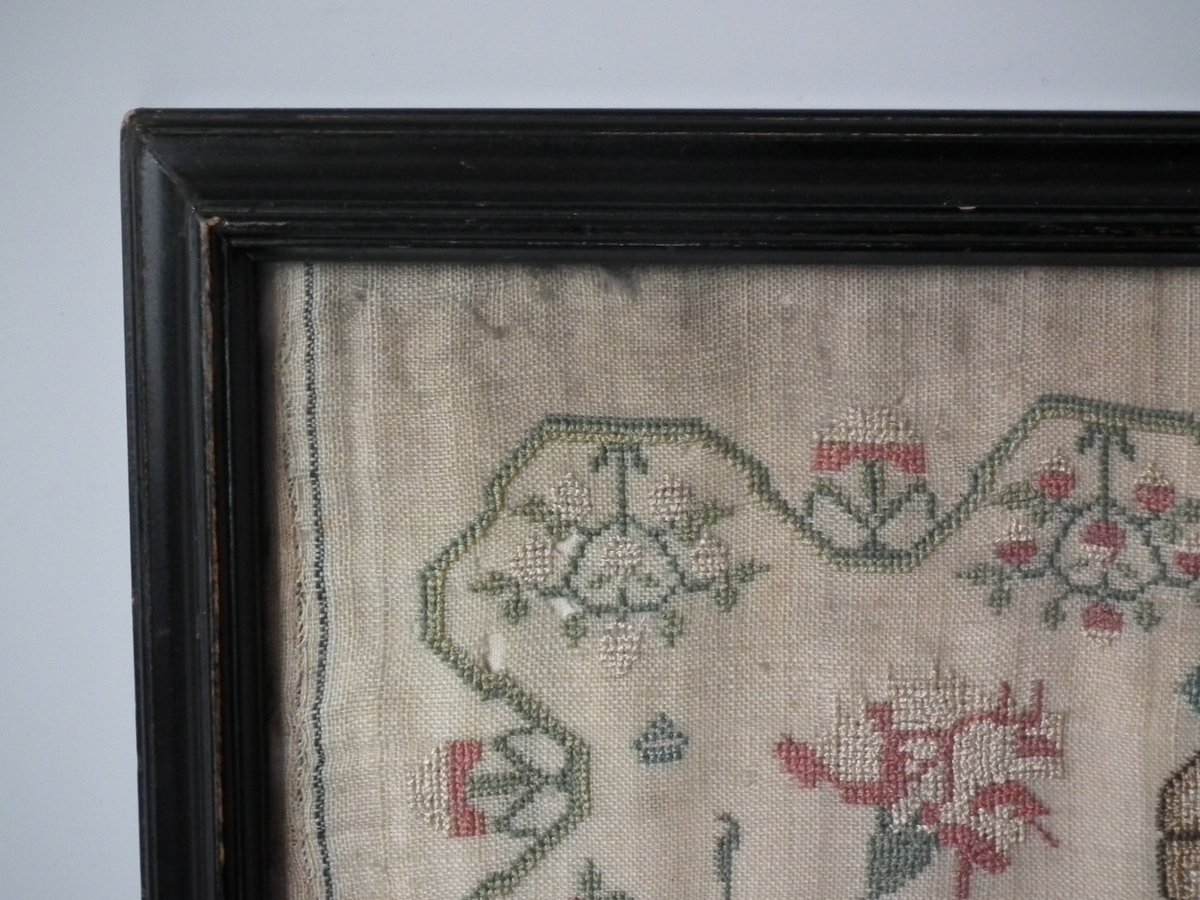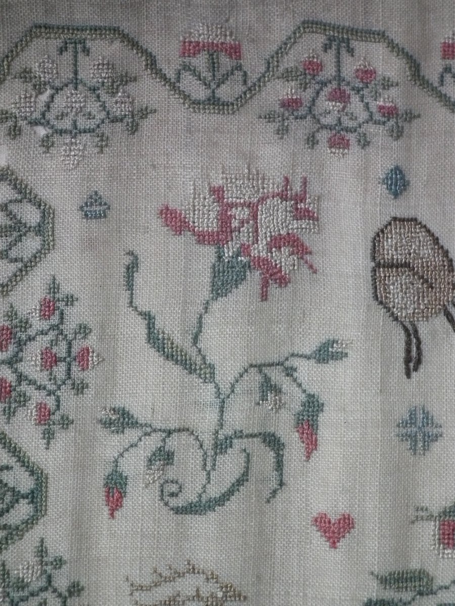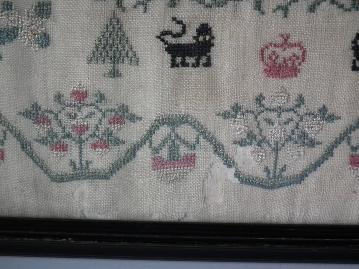 The sampler is worked in silk on linen ground, in cross stitch throughout.