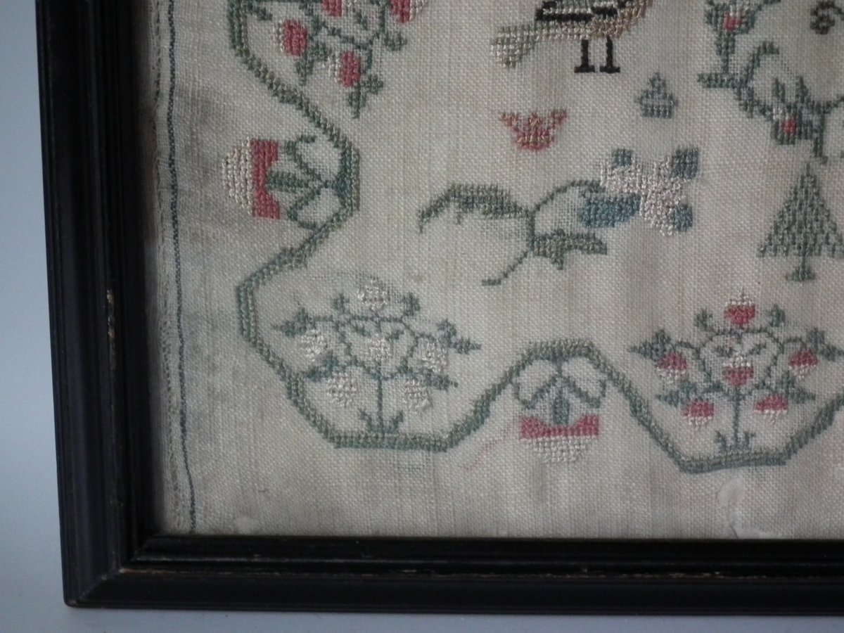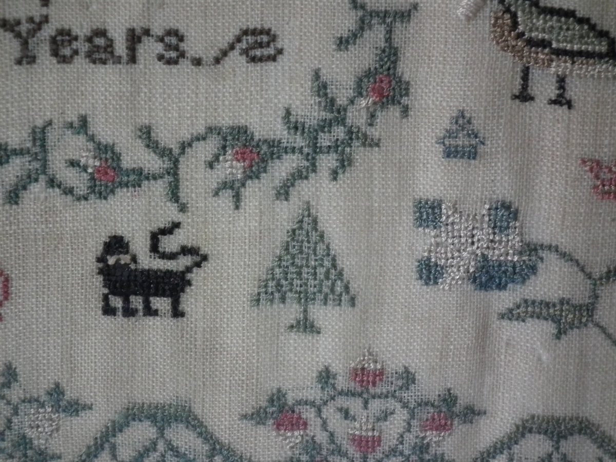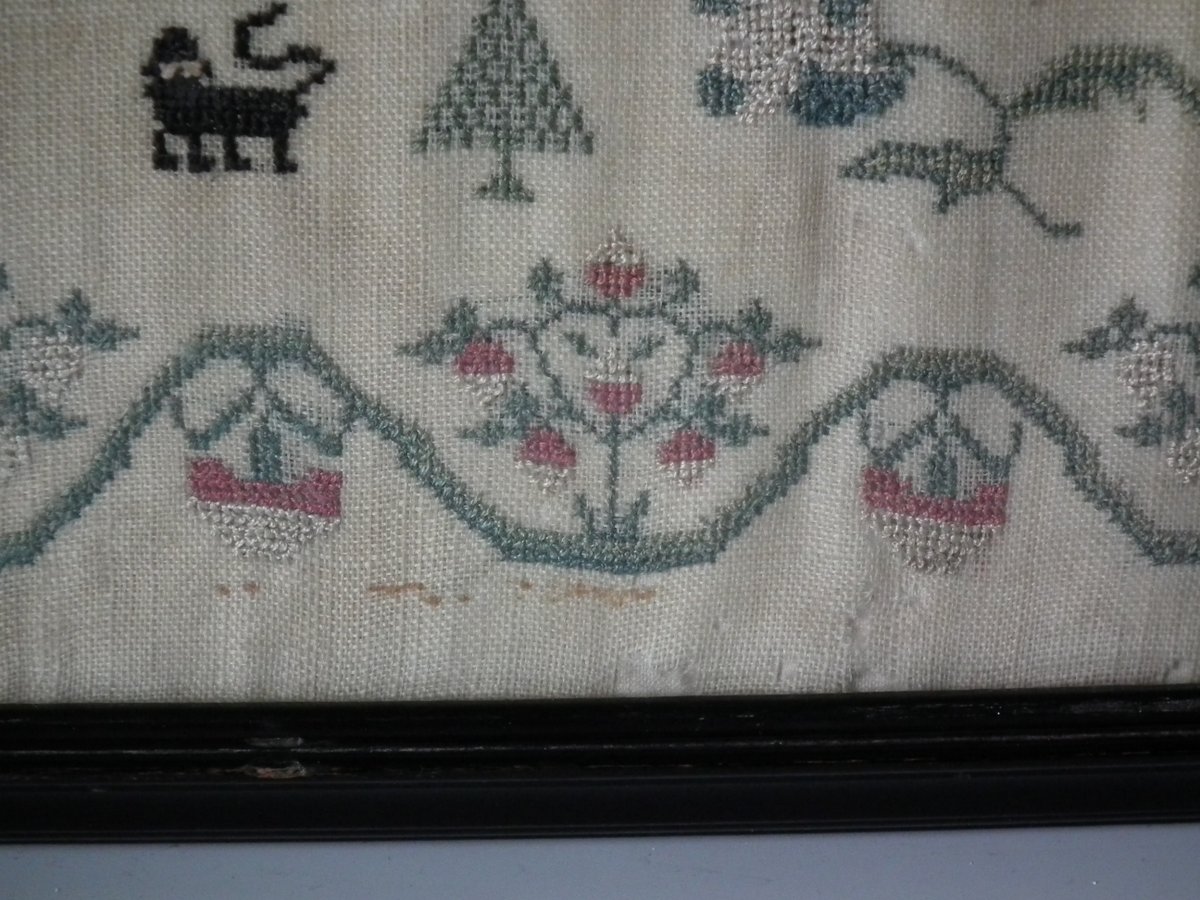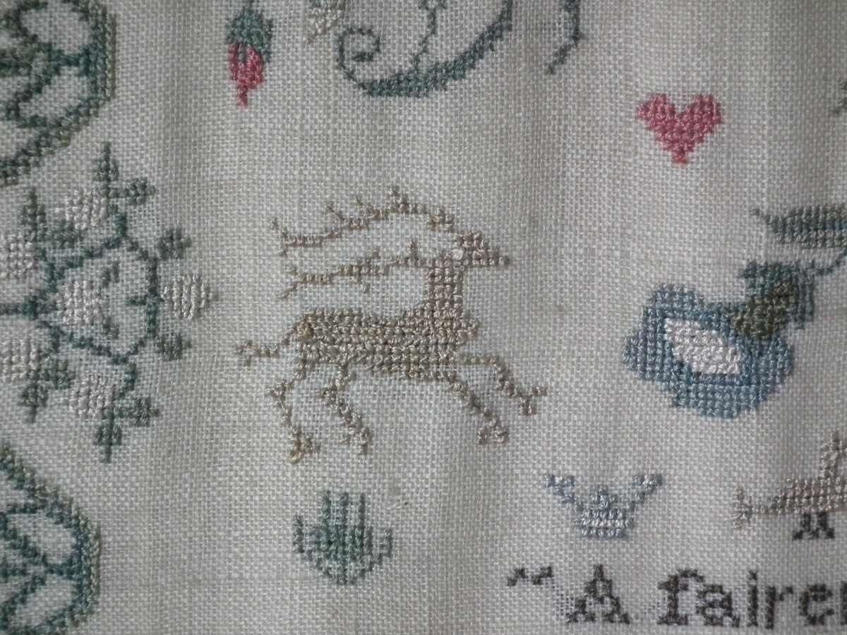 The sampler is worked in silk on linen ground, in cross stitch throughout.