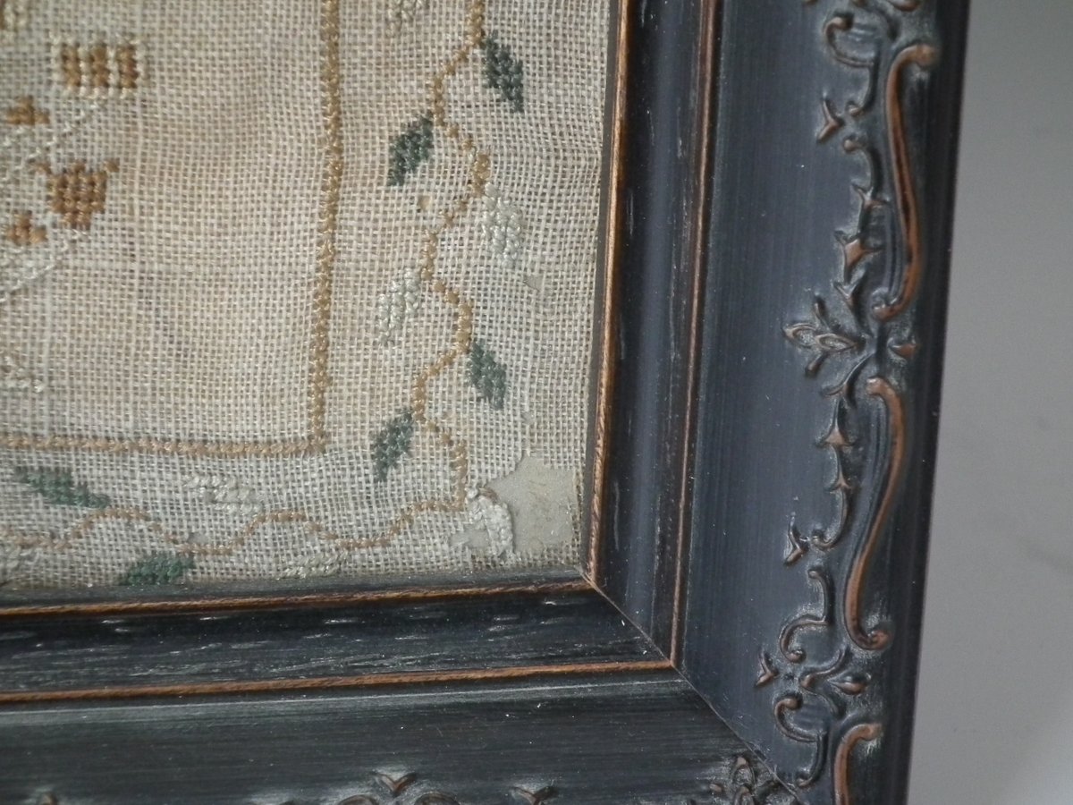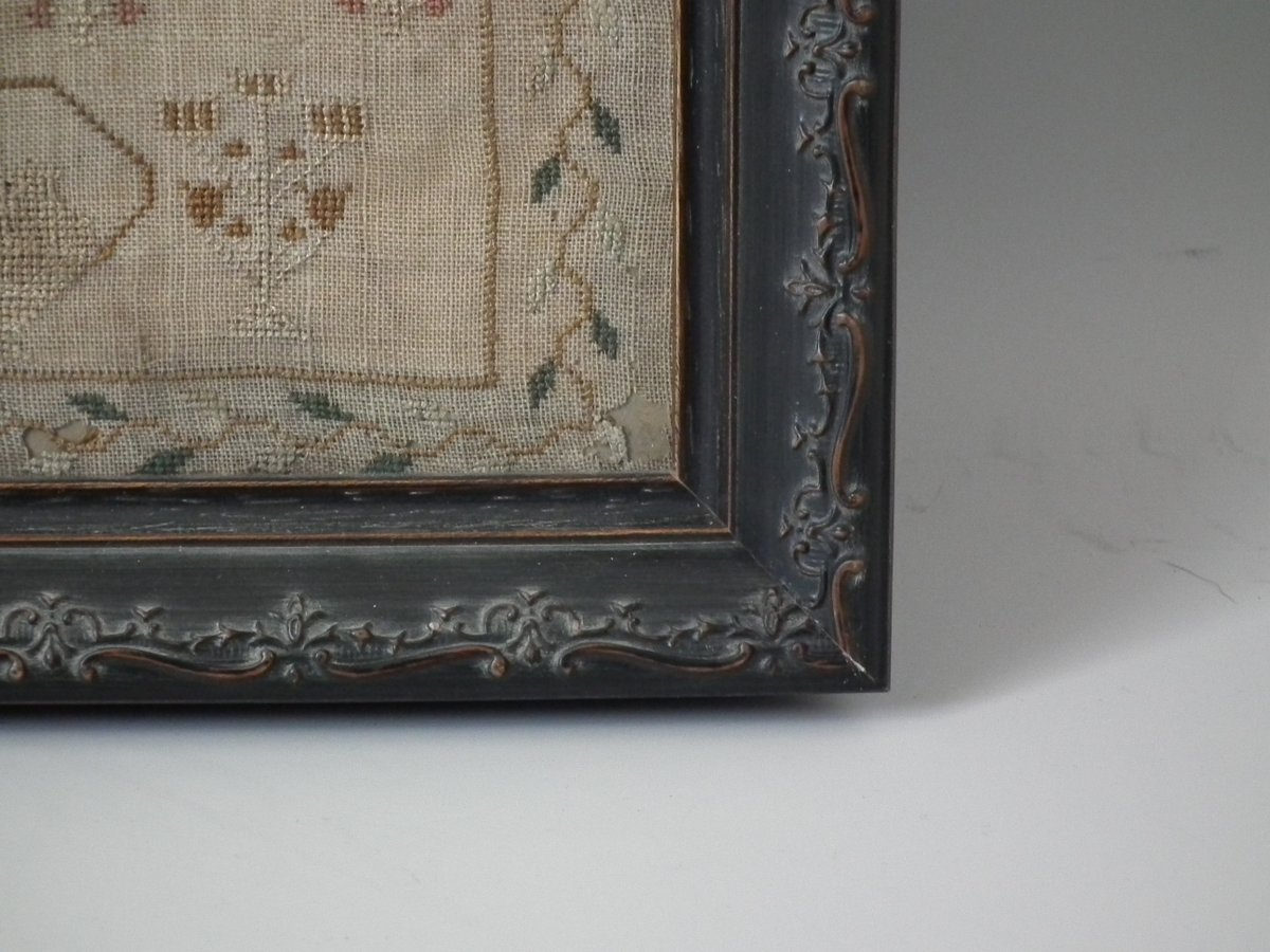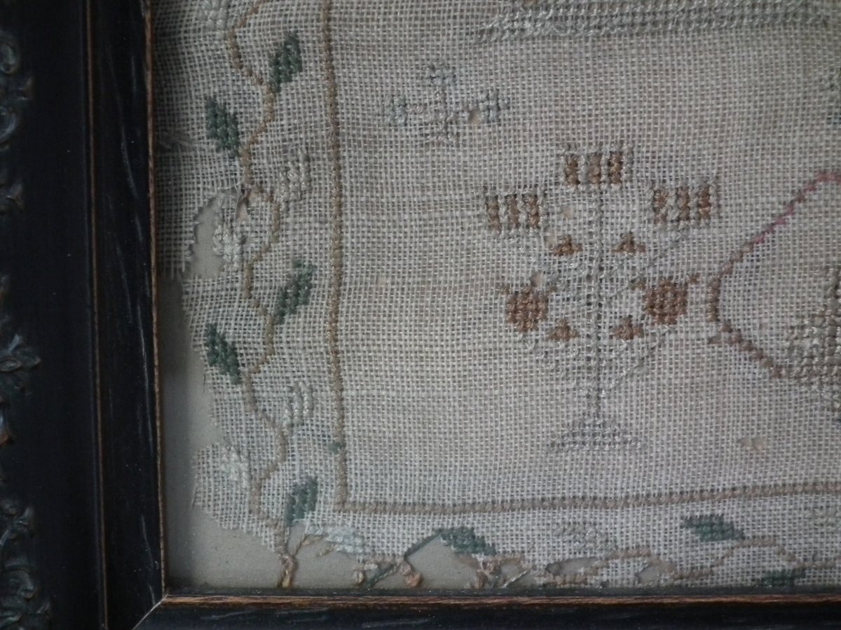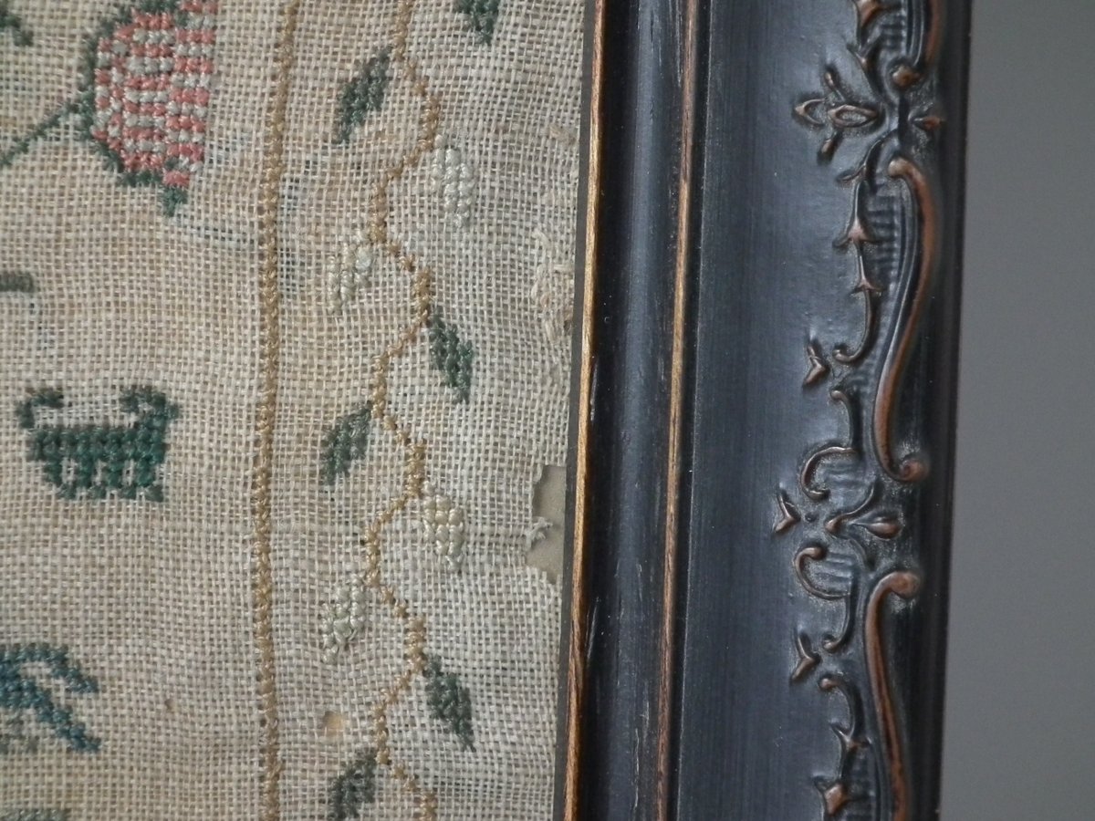 The sampler is worked in silk on linen ground, in cross stitch throughout.