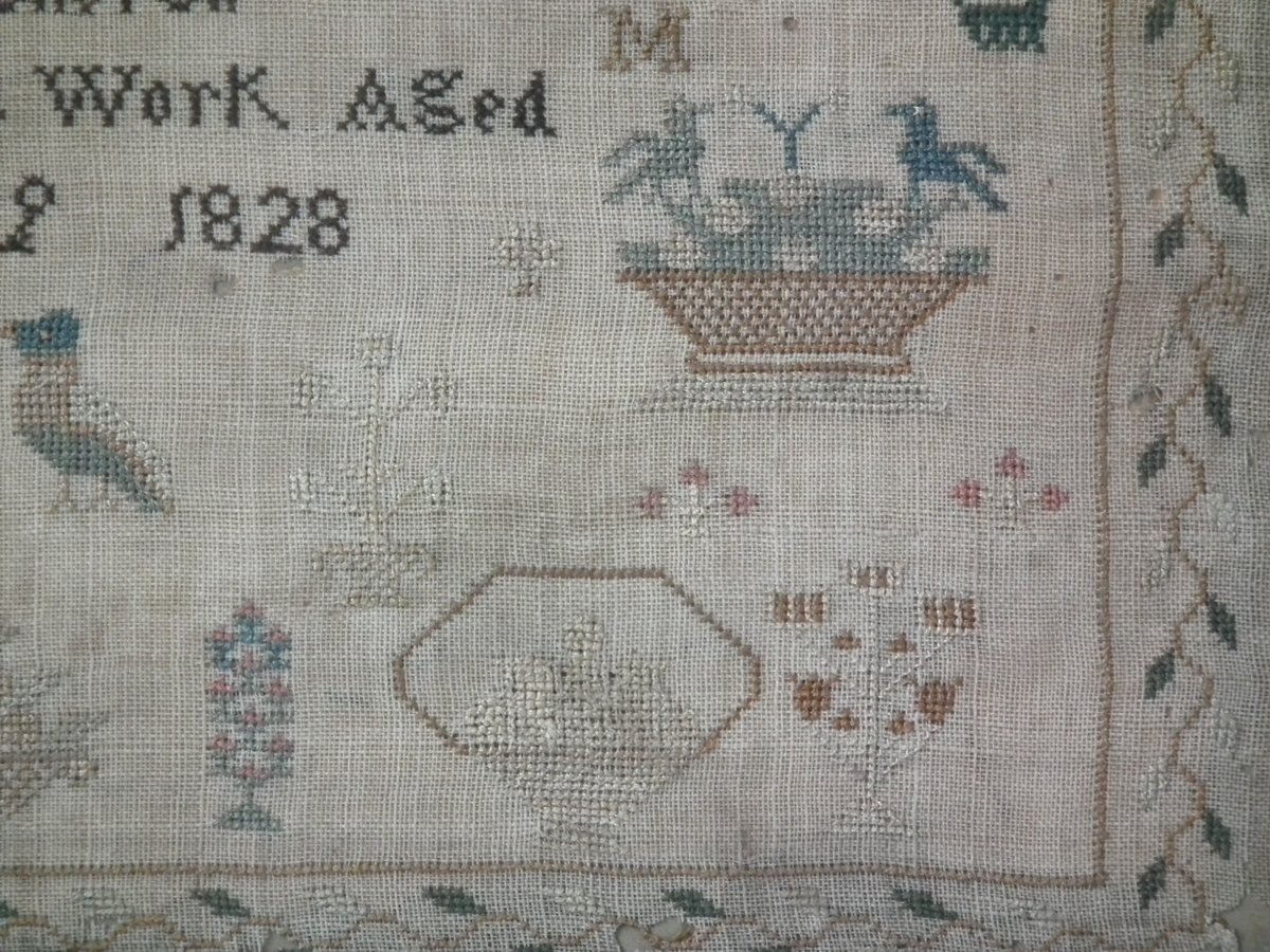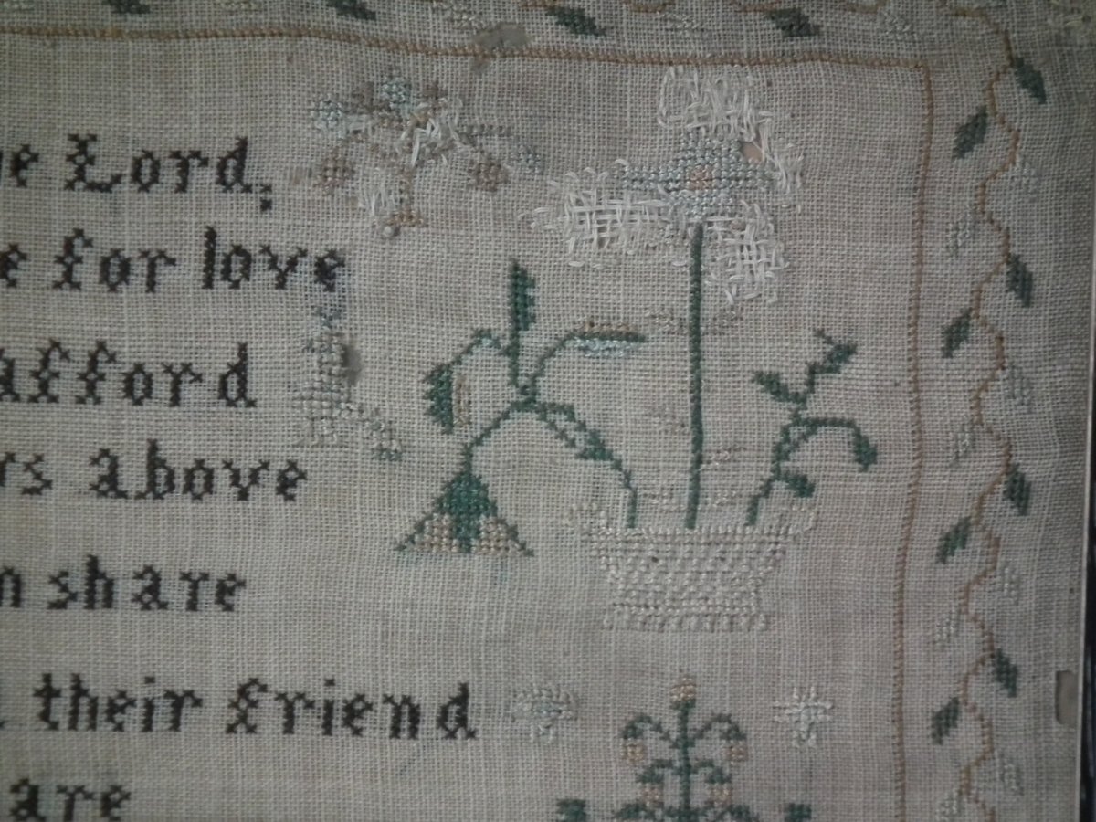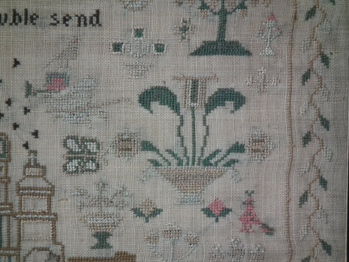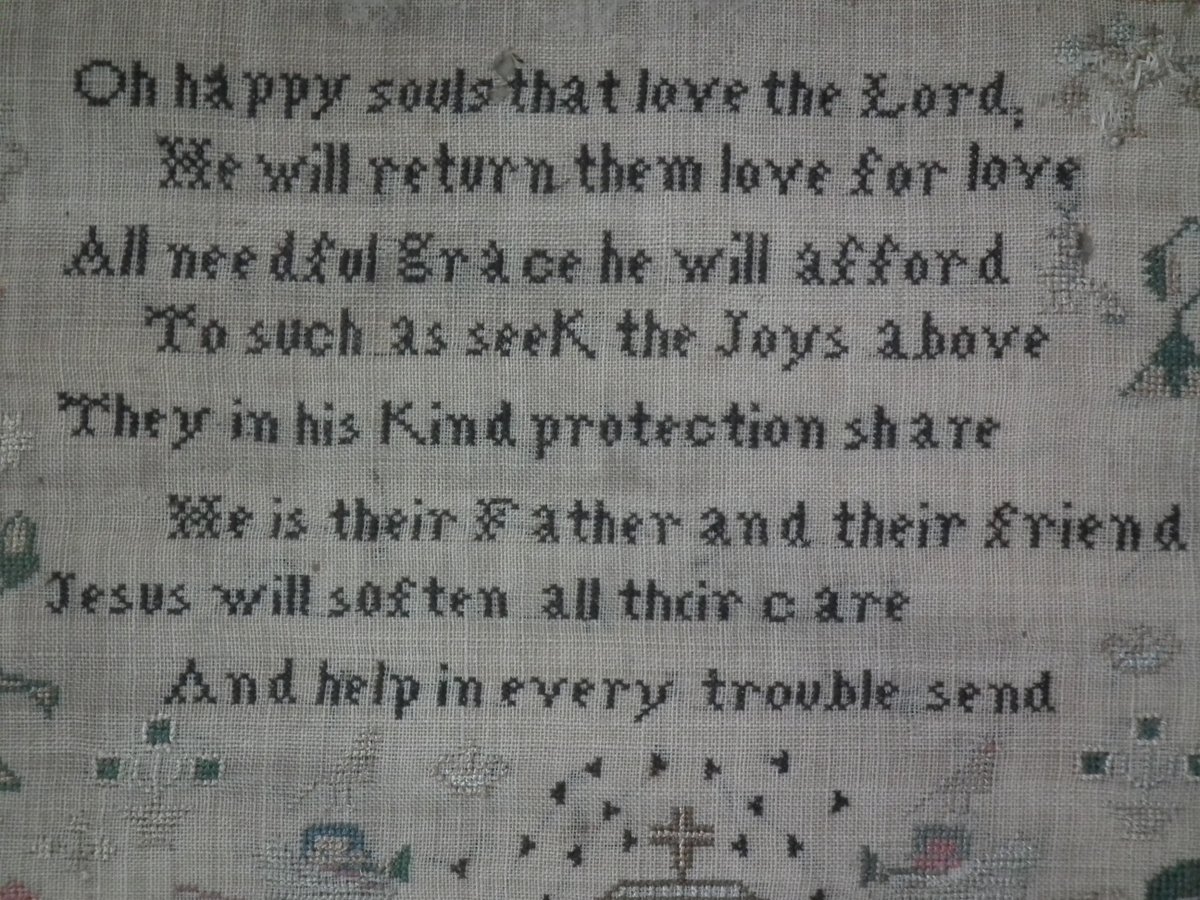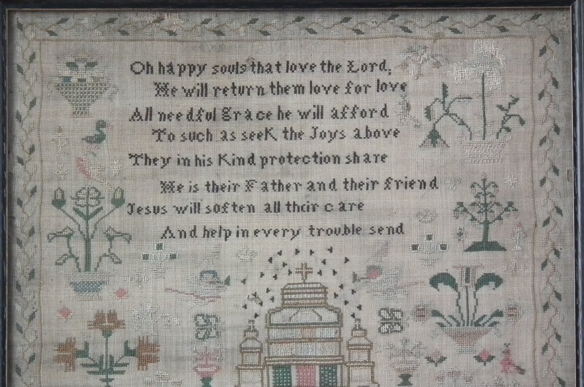 The sampler is worked in silk on linen ground, in cross stitch throughout.