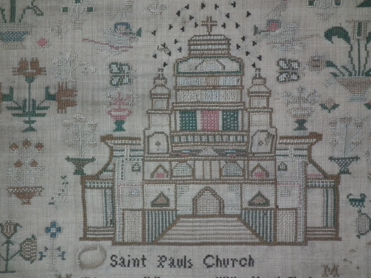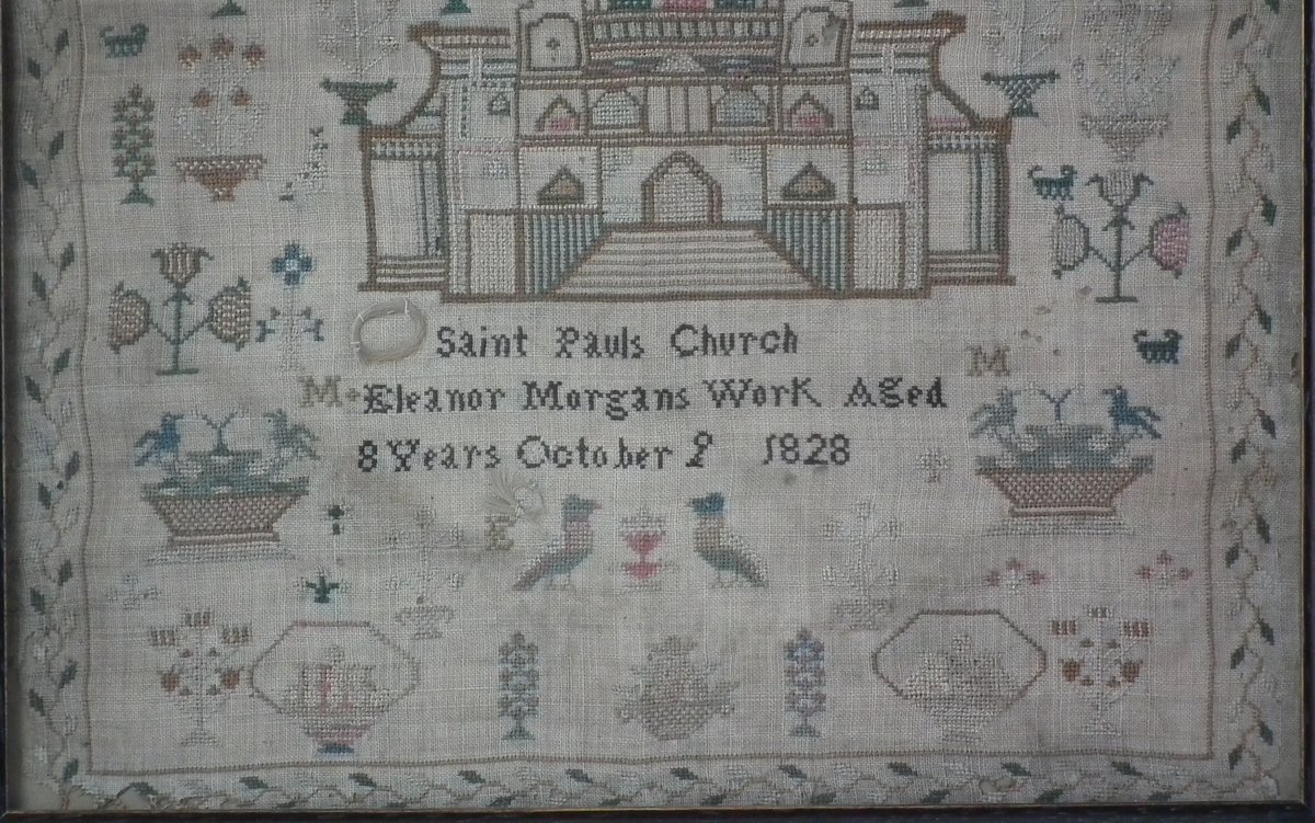 George IV, dated 1828. 16ins by 12.5ins wide. 1828 Saint Paul's Church Sampler Eleanor Morgan. Framed in an old wood frame with glass. Fixed to board.