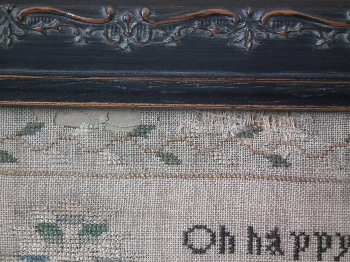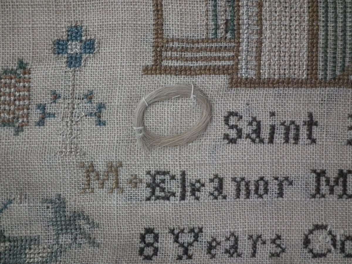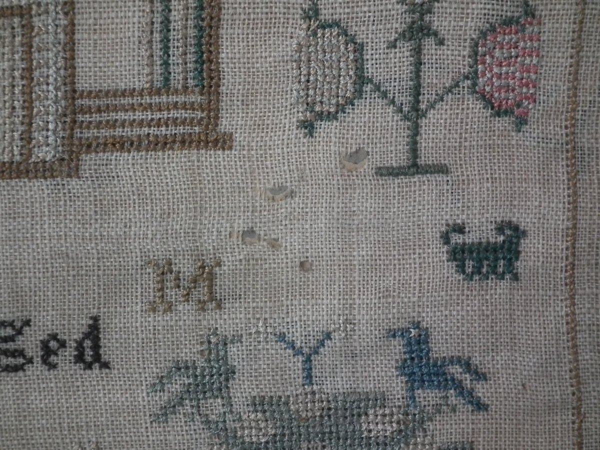No stains other than uniform age darkening of the ground. No stitch losses other than to the holed areas. Colours are slightly faded, but still well defined. Stretching is slightly uneven.