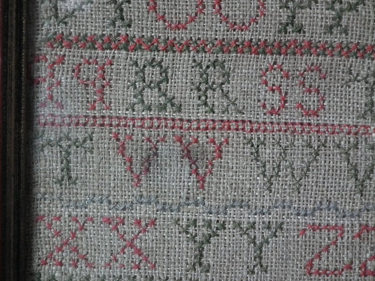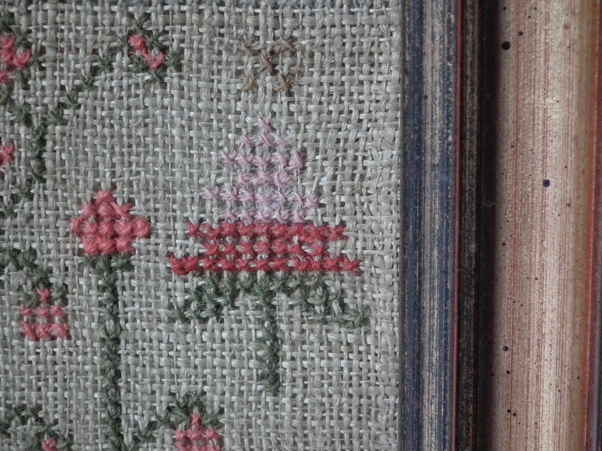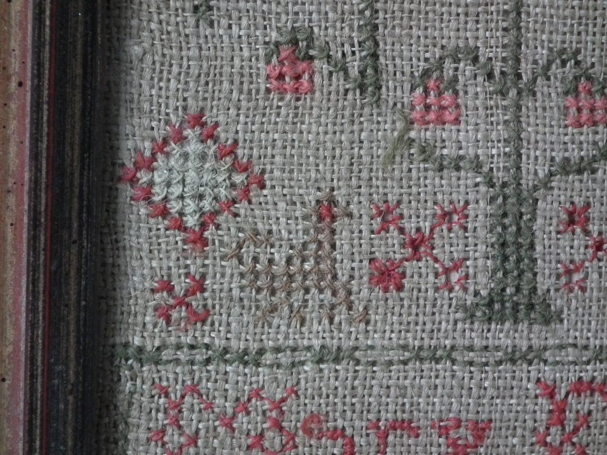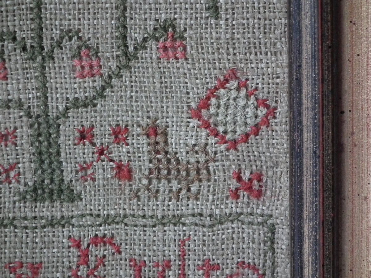 The sampler is worked in wool on linen ground, in cross stitch and Algerian eye.