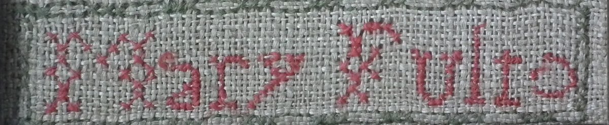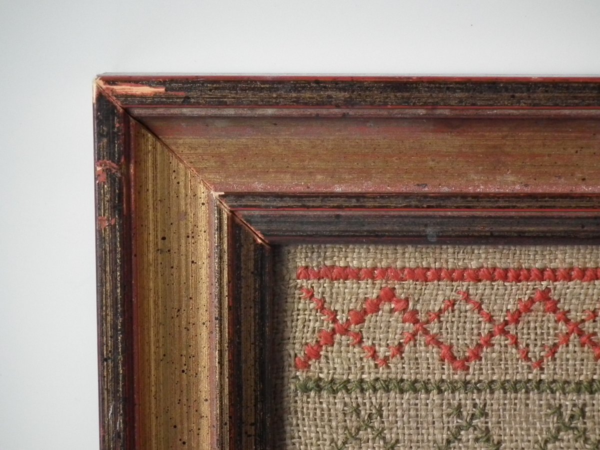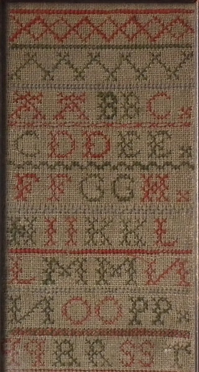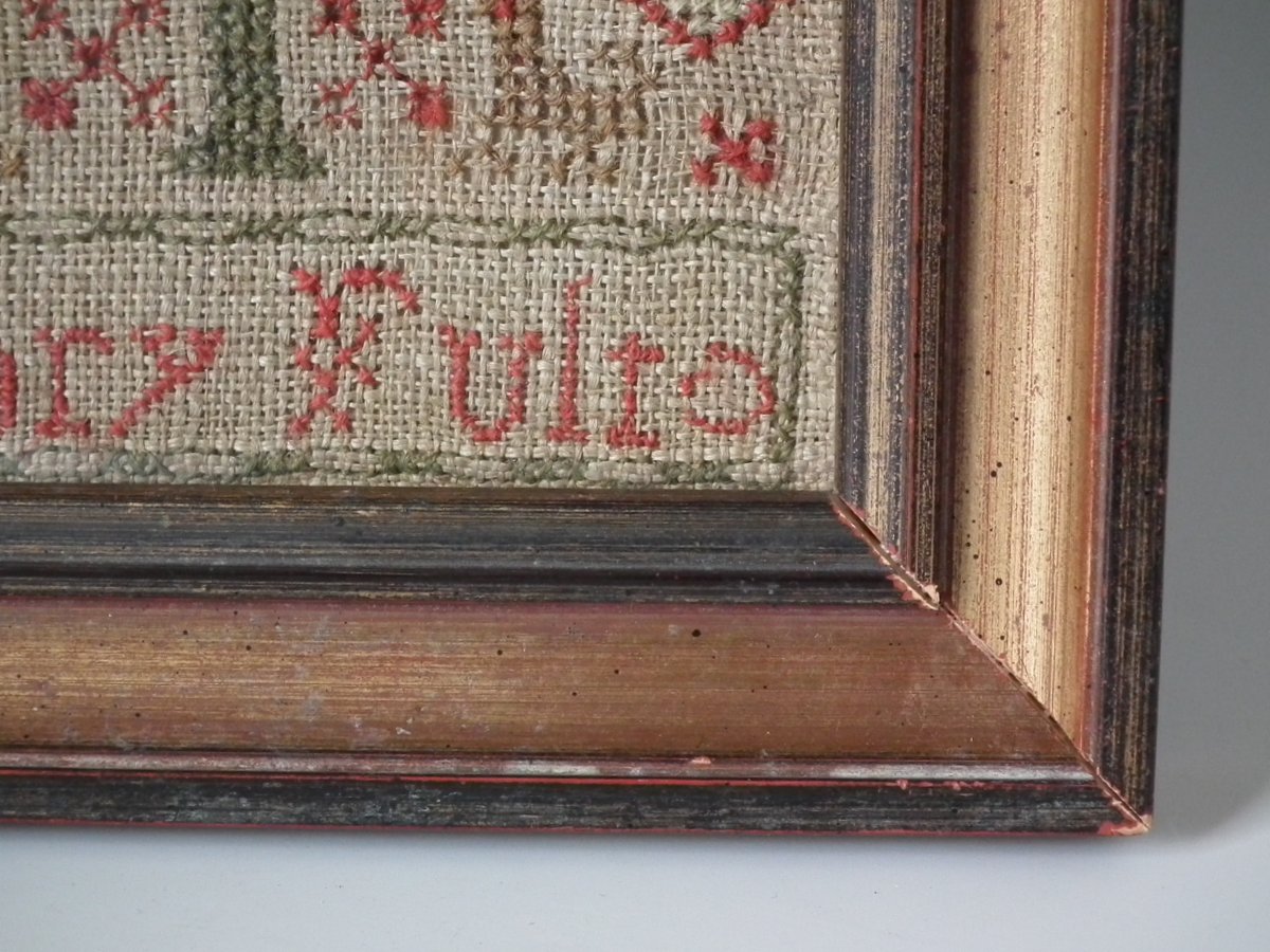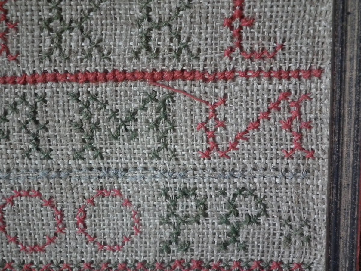 The sampler is worked in wool on linen ground, in cross stitch and Algerian eye.