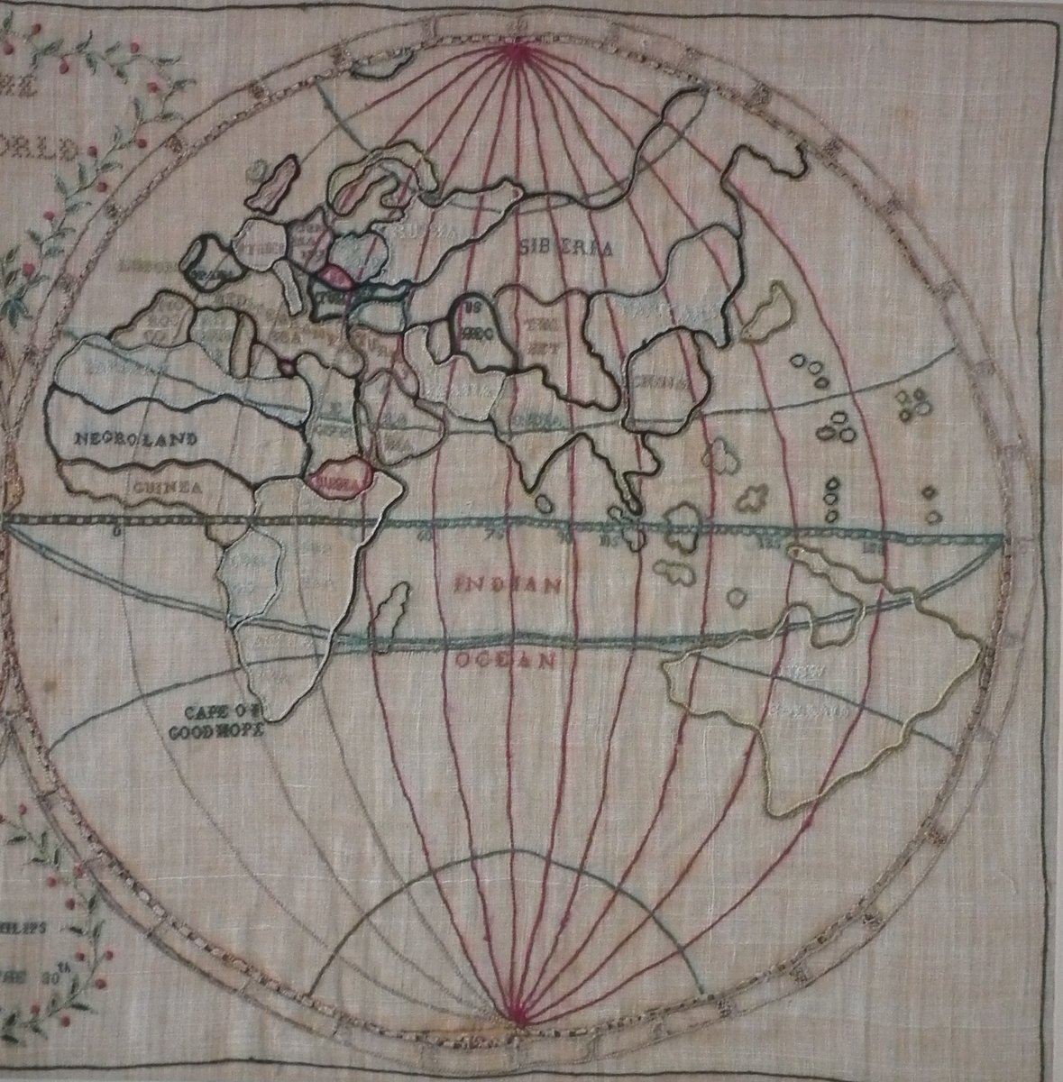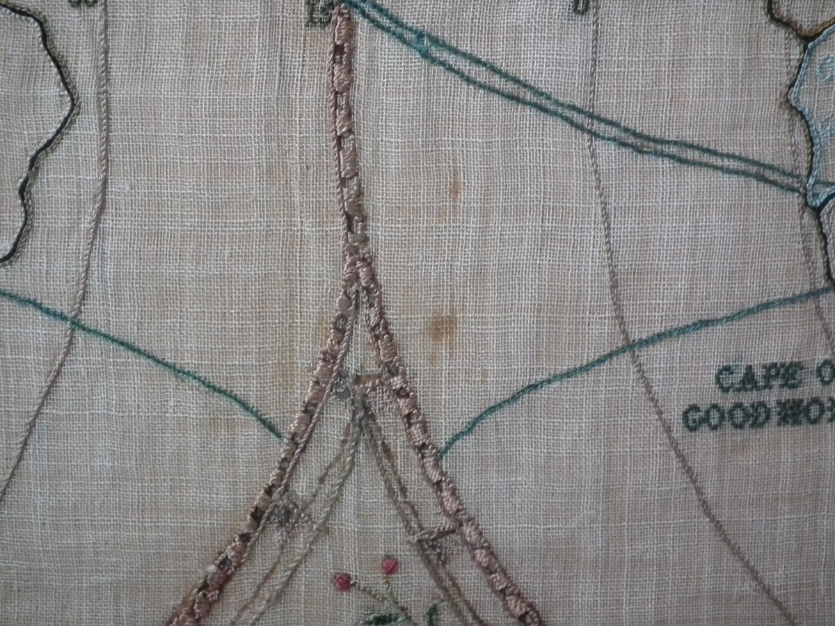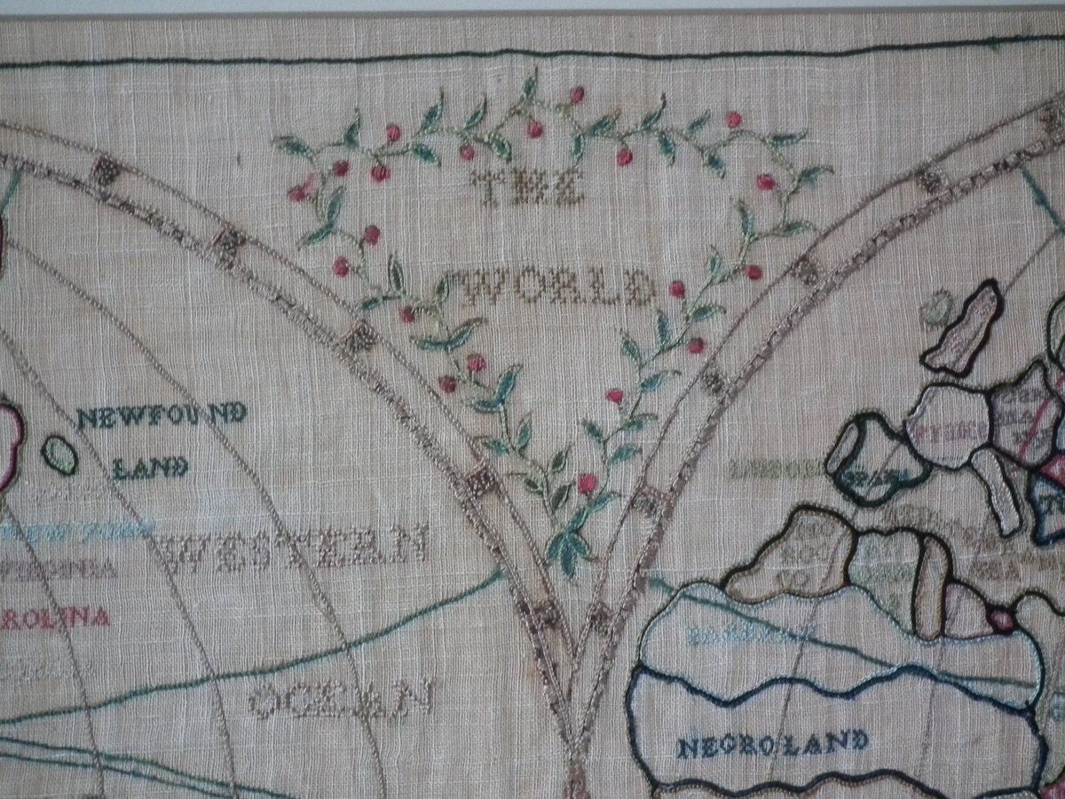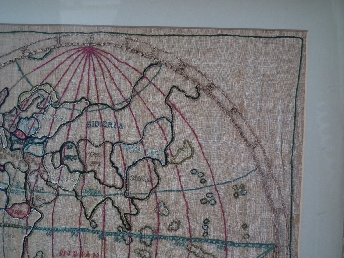 Colours blue, cream, red, copper, black, green and pink. Sampler depicts a map of the world, presented in two circles.