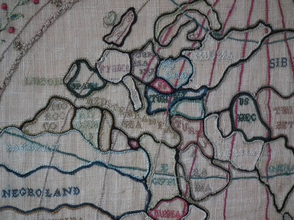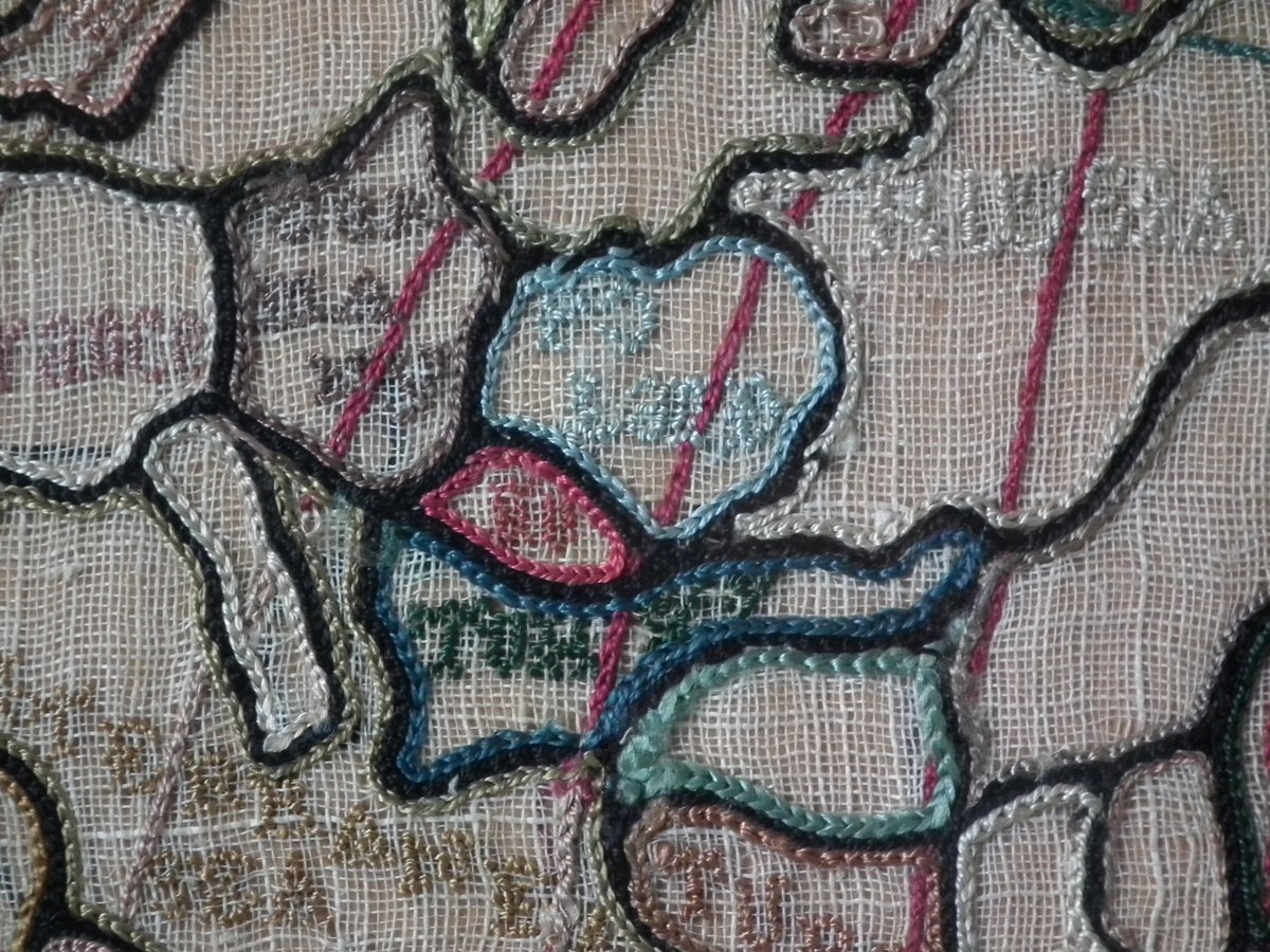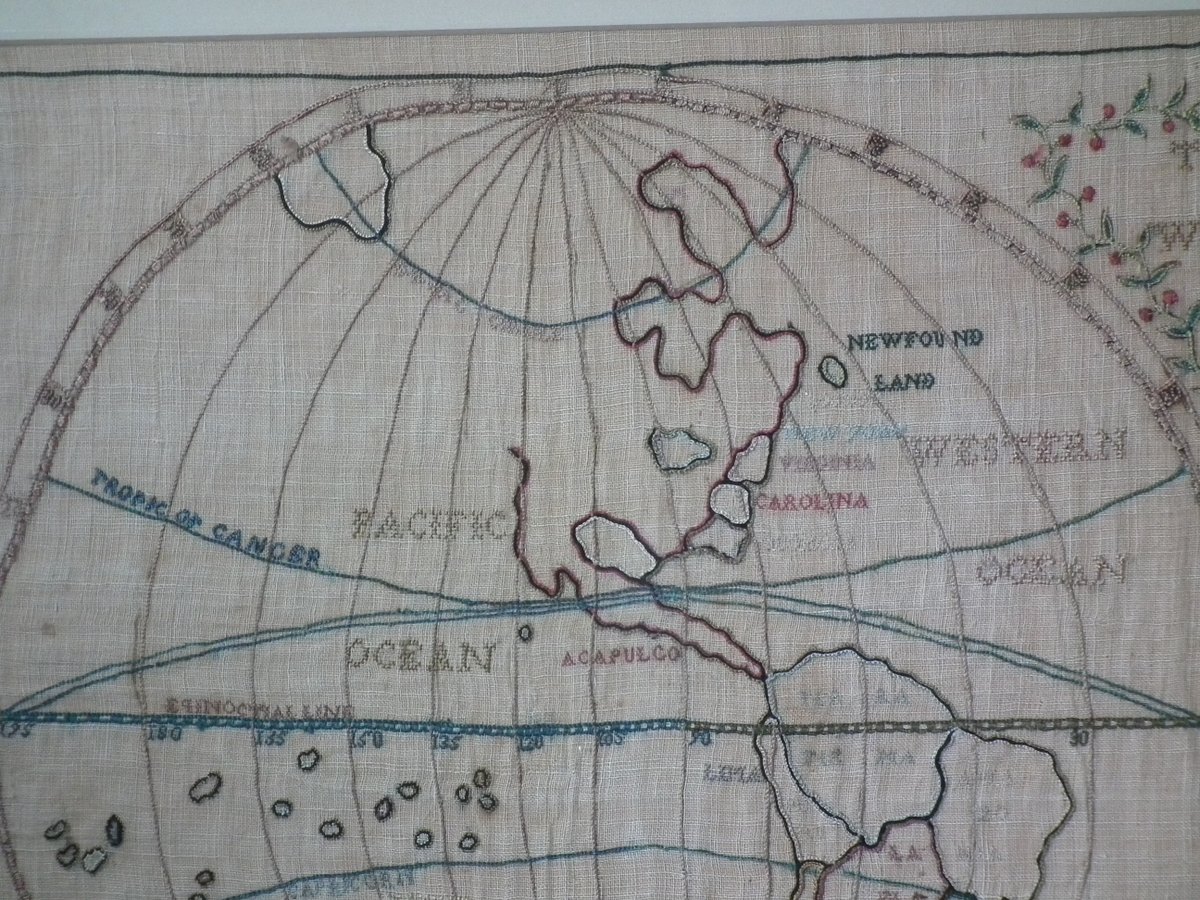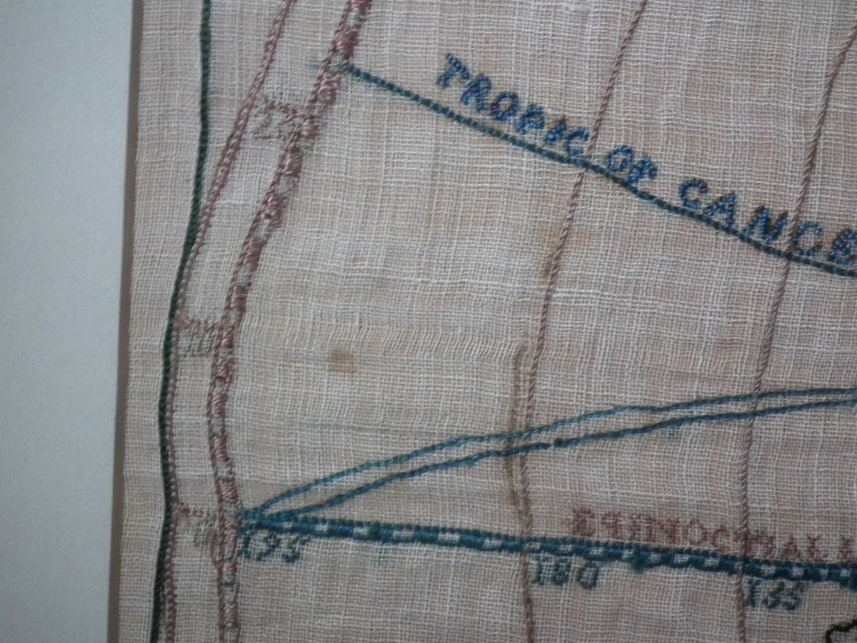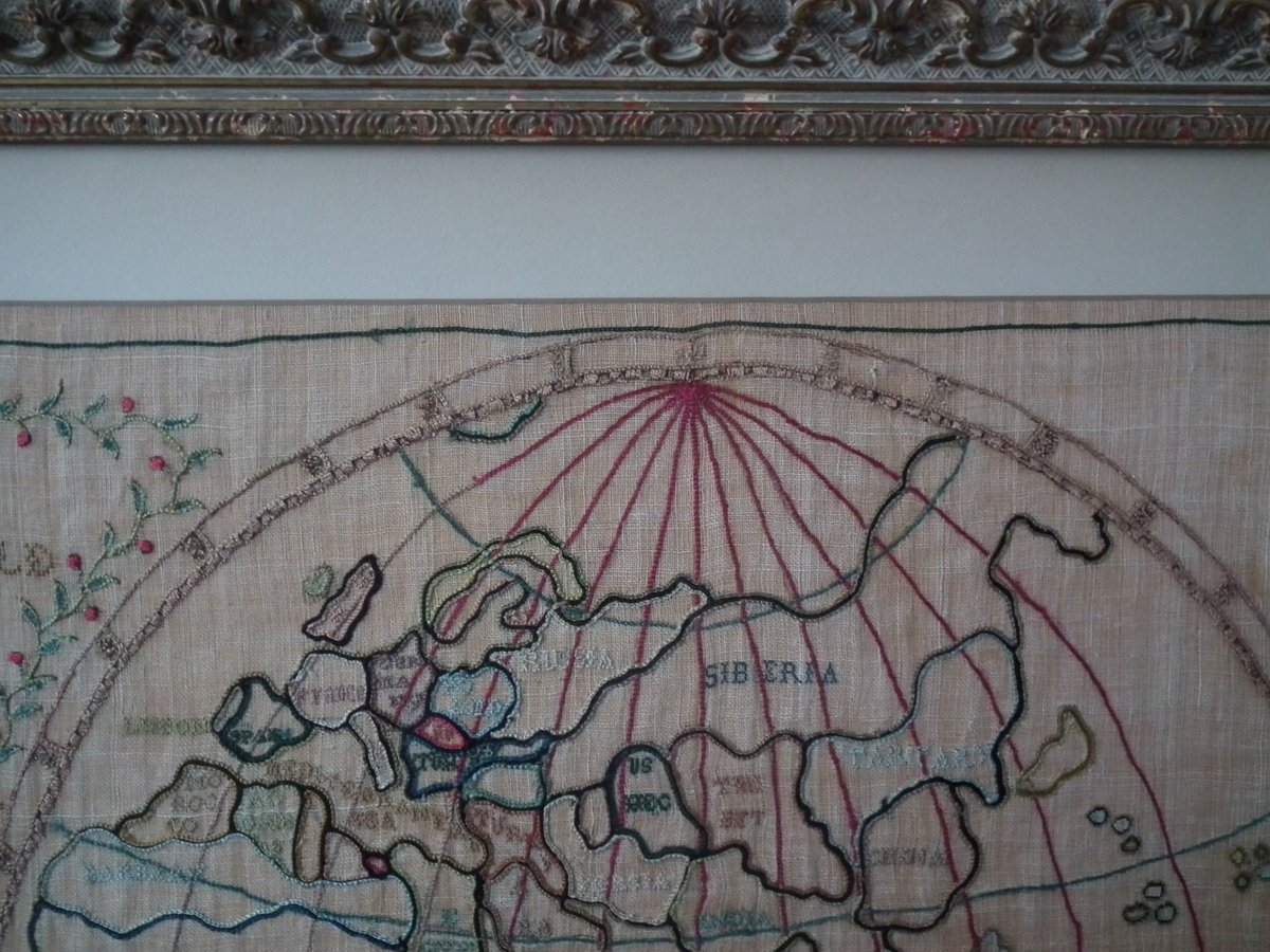 Colours blue, cream, red, copper, black, green and pink. Sampler depicts a map of the world, presented in two circles.