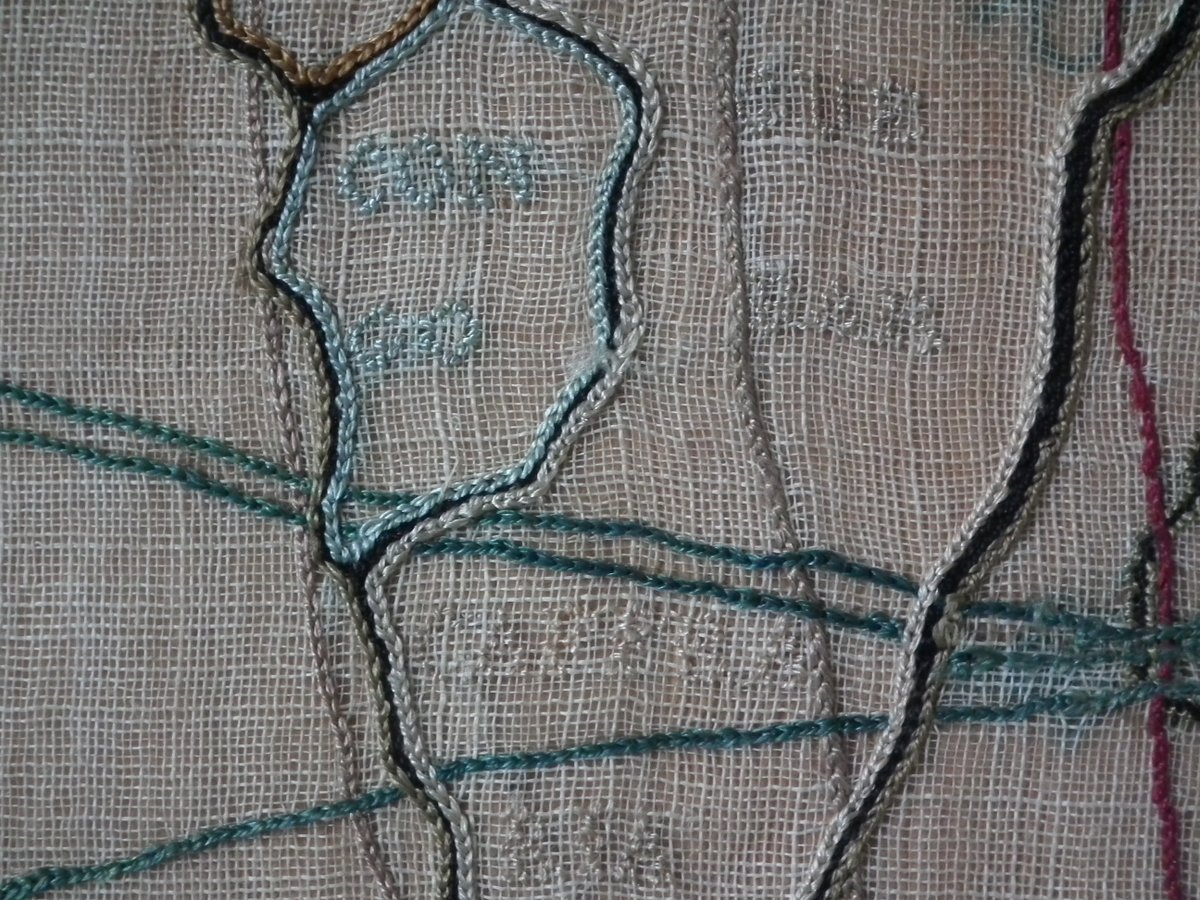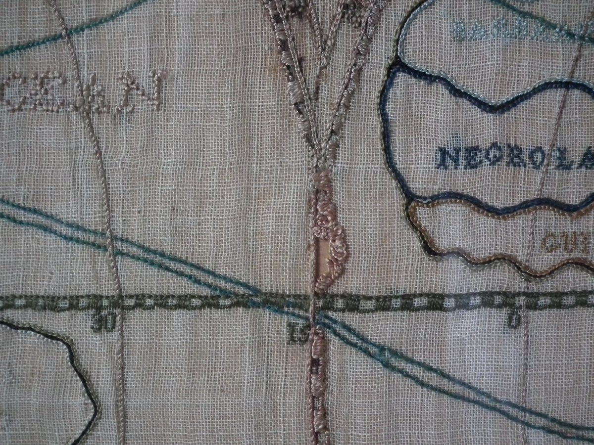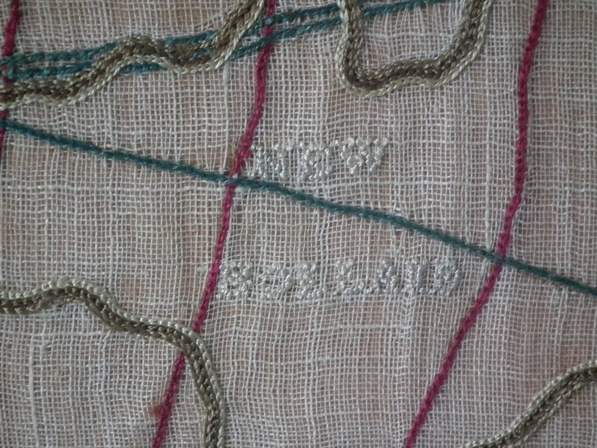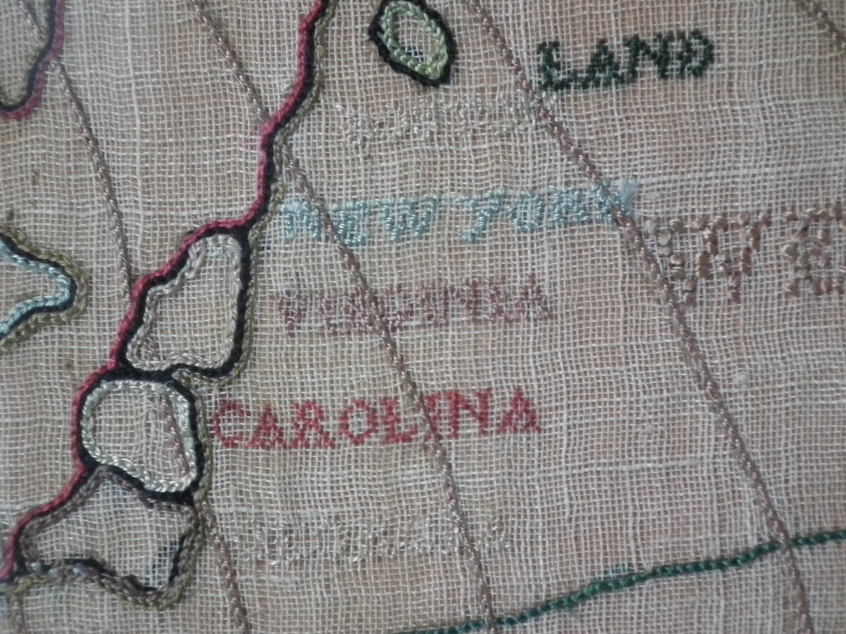 Colours blue, cream, red, copper, black, green and pink. Sampler depicts a map of the world, presented in two circles.