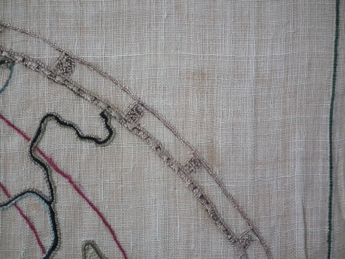A few pale stains.No stitch losses other than to the holed areas.
