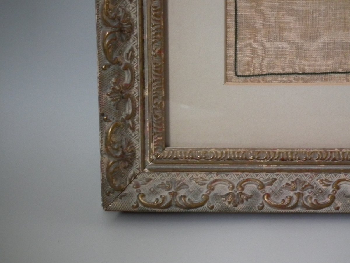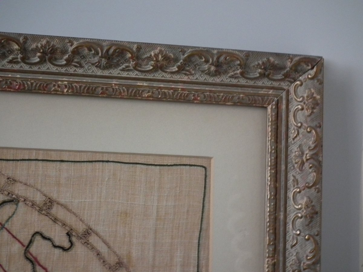 George III, dated 1779. 15ins by 28.5ins wide. 1779 World Map Sampler by Ann Philips. Framed in an old, gilded, gesso frame with rippled, old glass.
