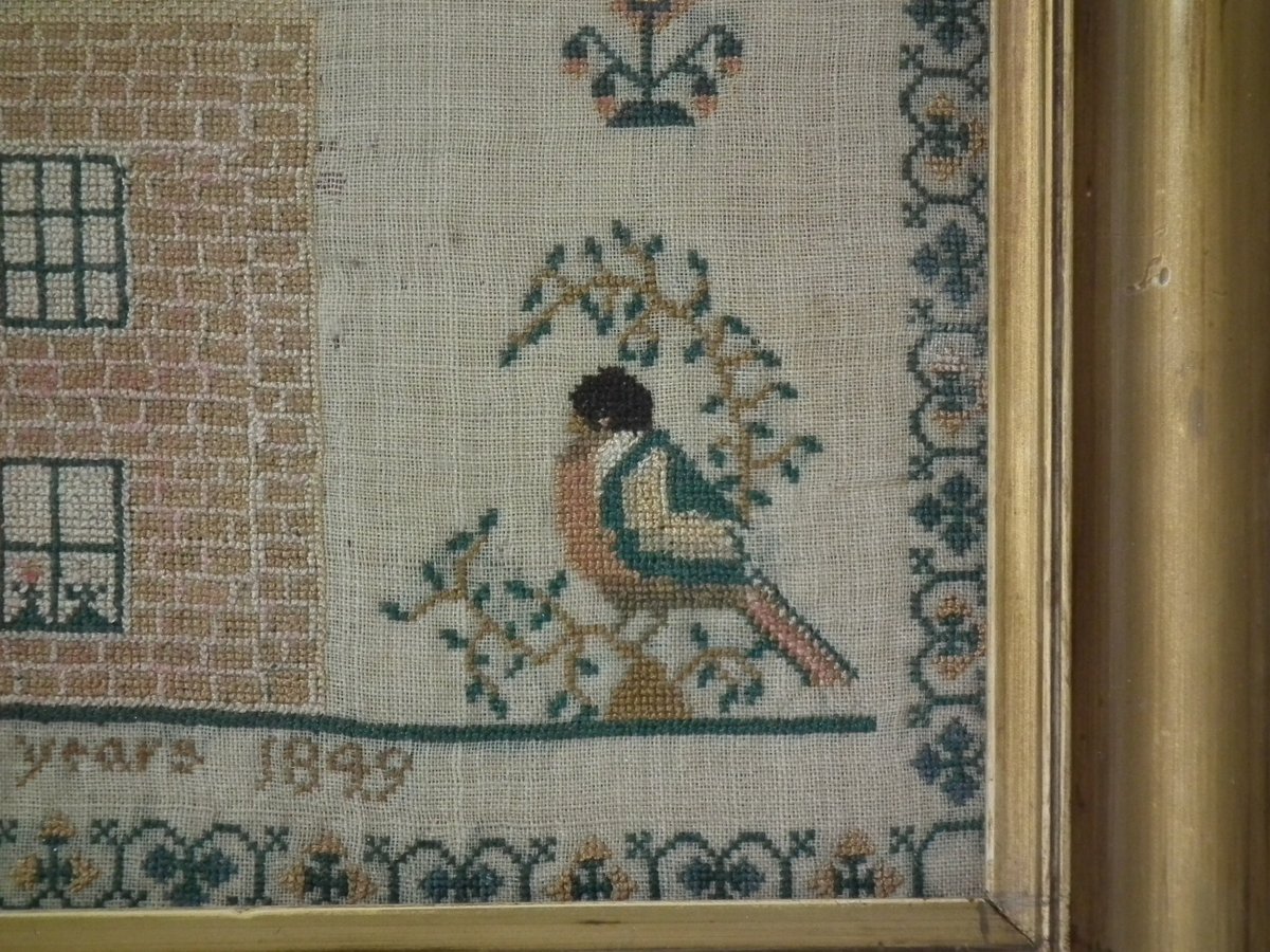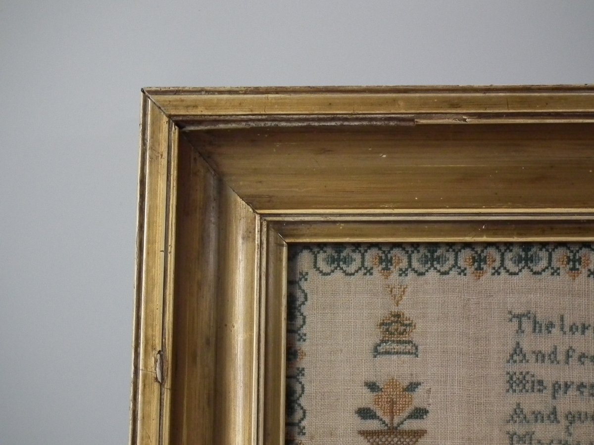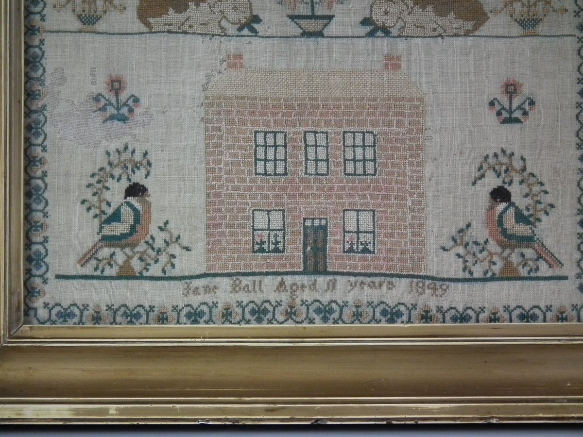 Victorian, dated 1849. 12.25 ins high by 11.25ins wide. 1849 House Sampler by Jane Ball. Framed in an old, possibly original, gilt over wood, frame with glass.