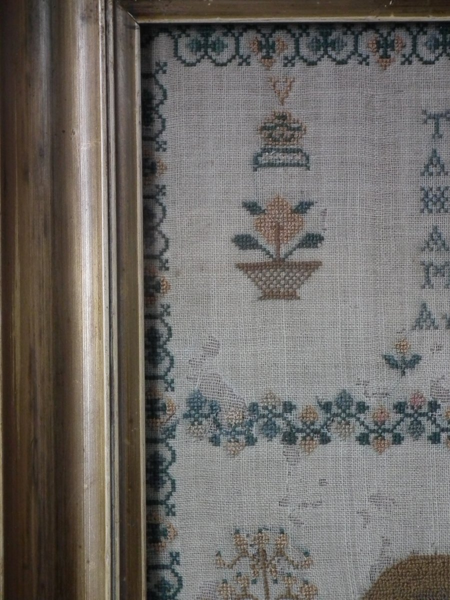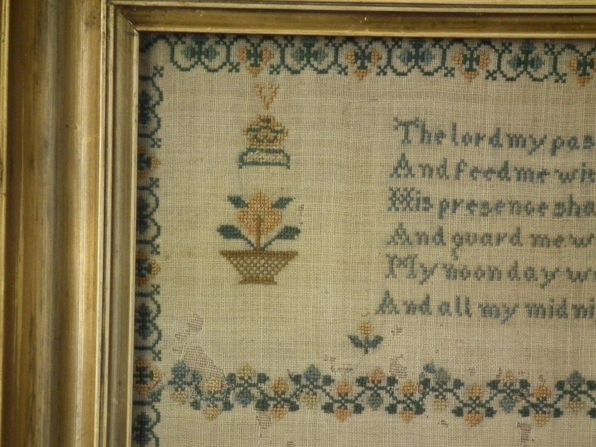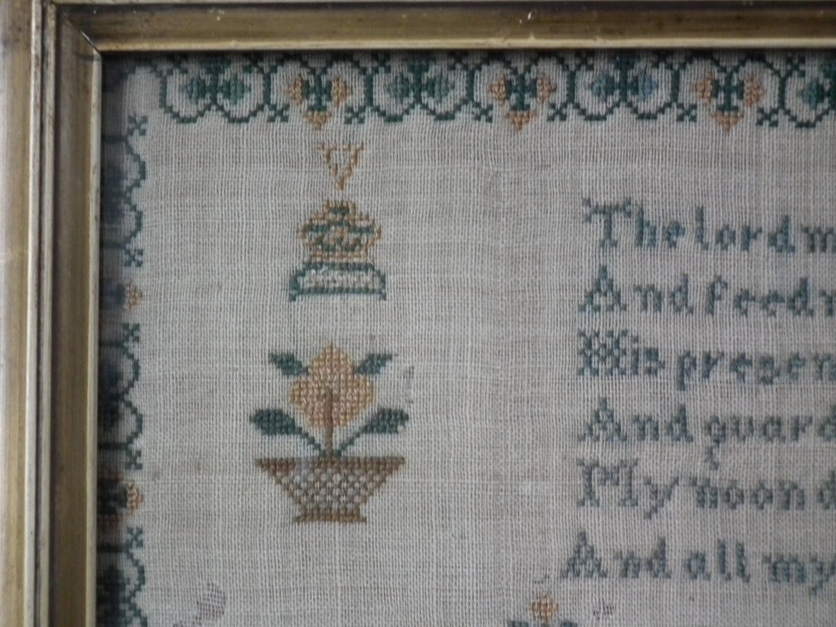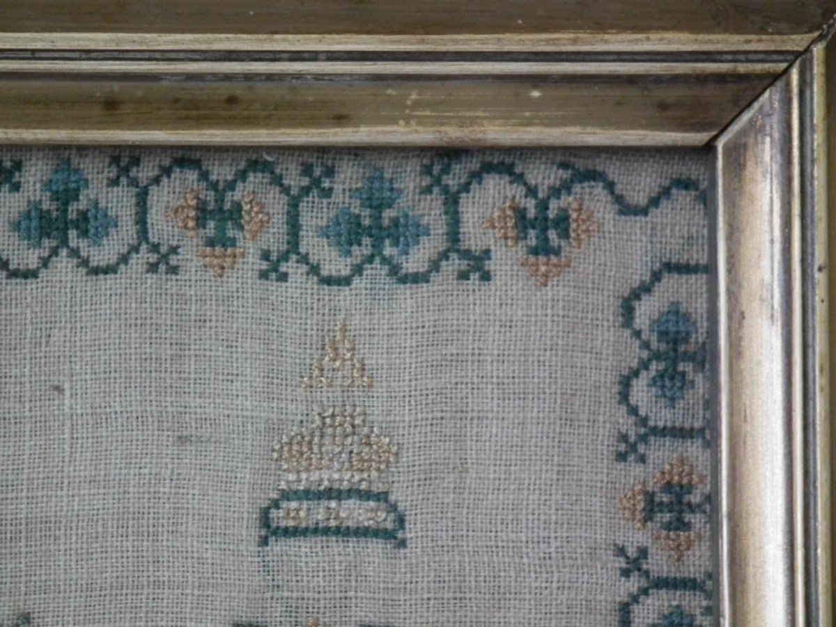 The sampler is finely worked in silk on linen ground, in a variety of stitches.
