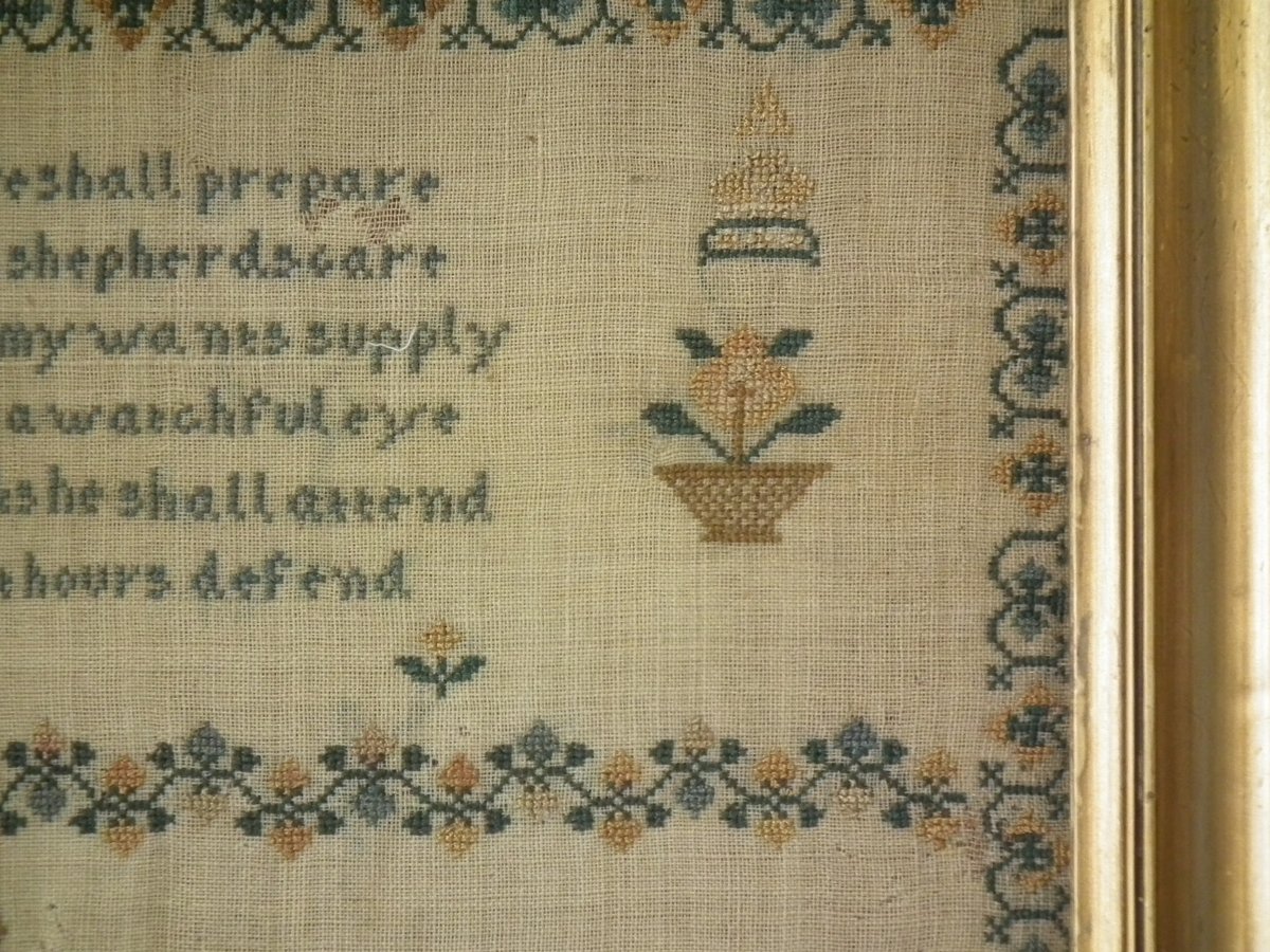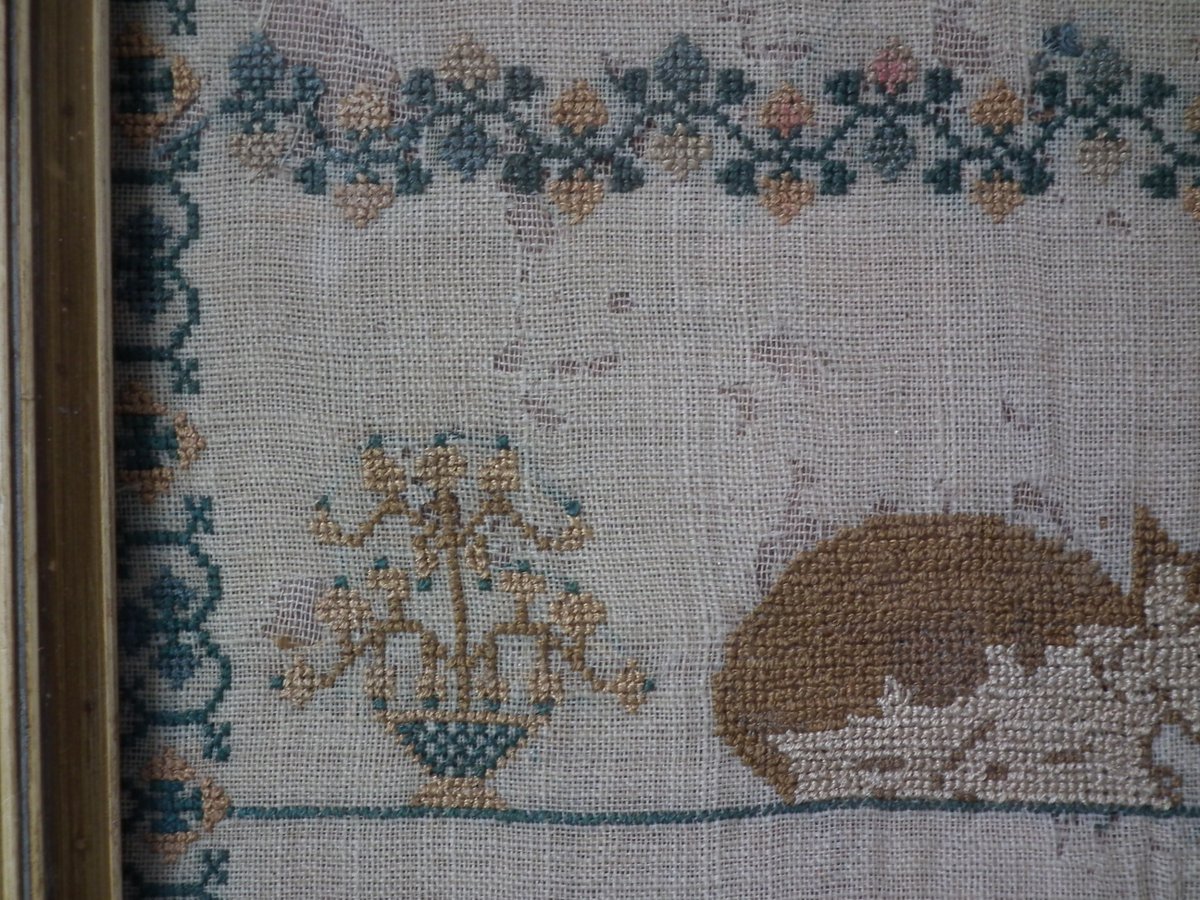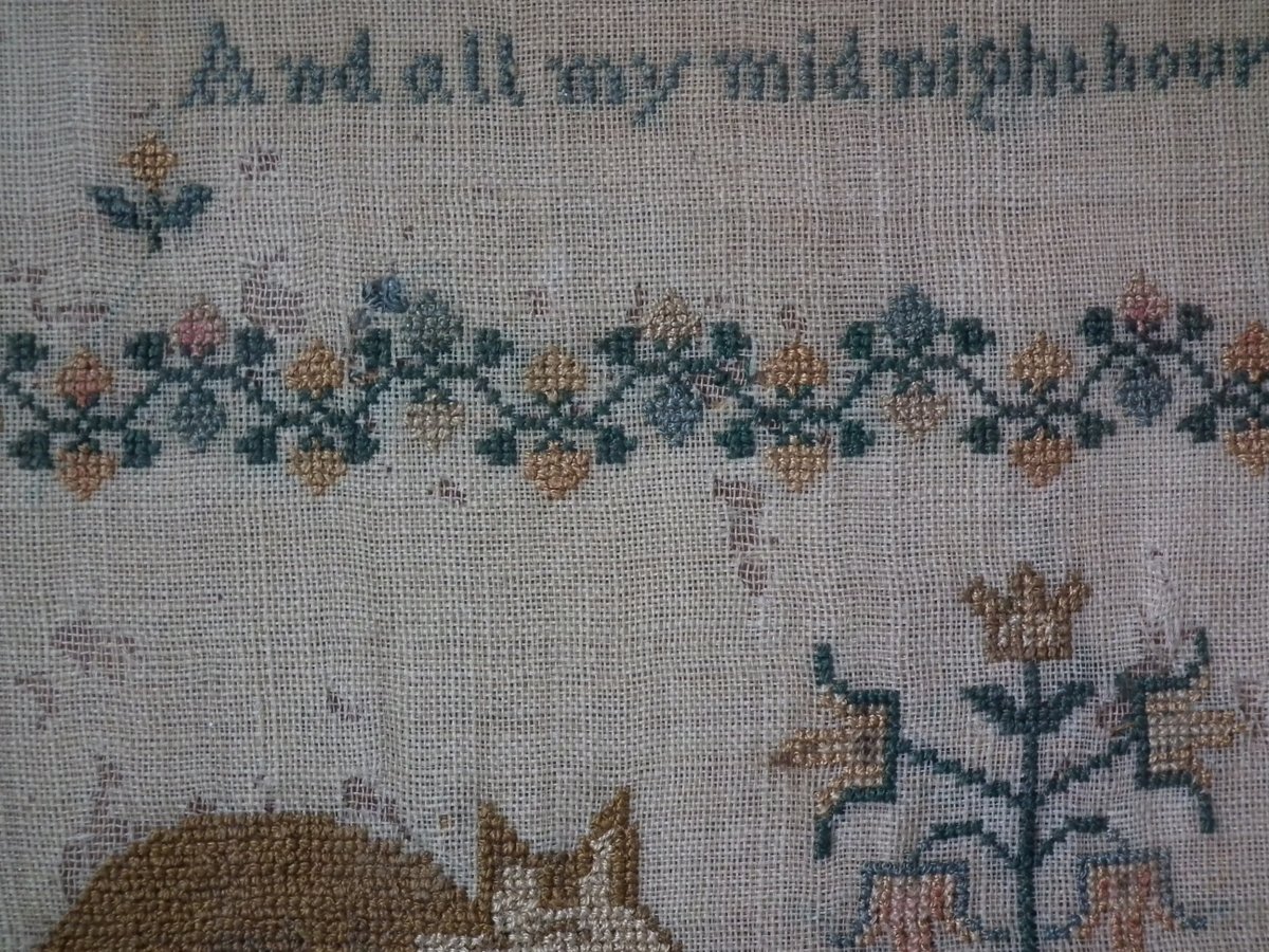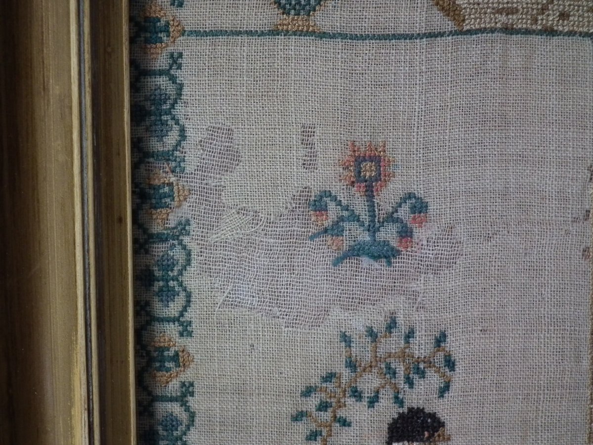 The sampler is finely worked in silk on linen ground, in a variety of stitches.