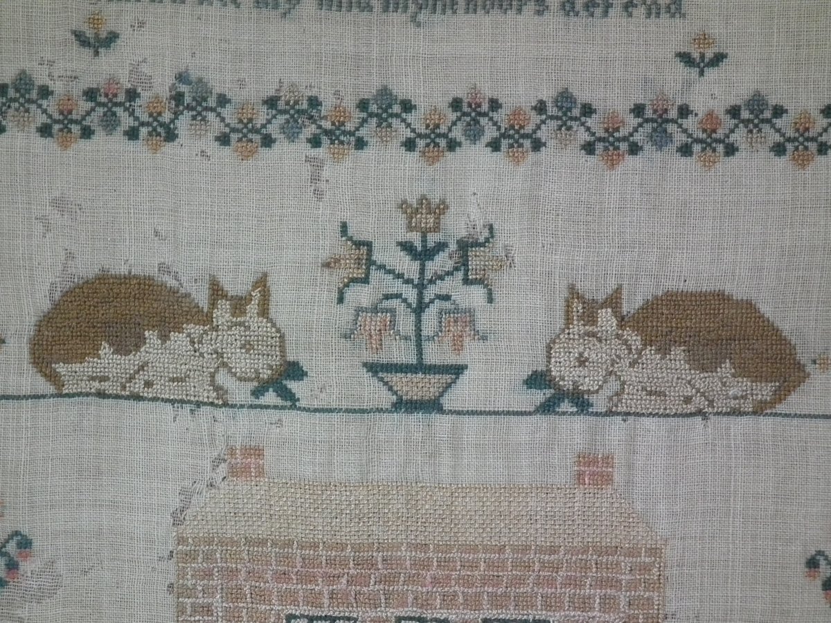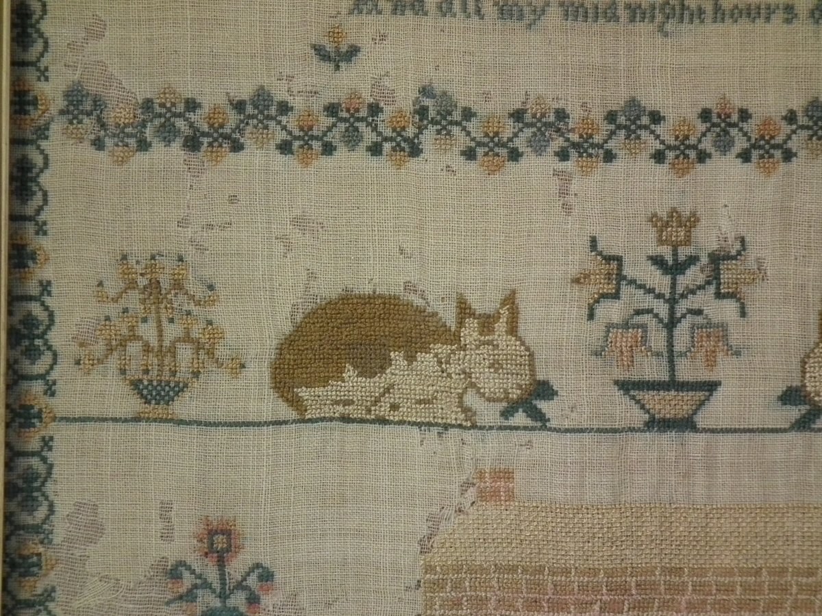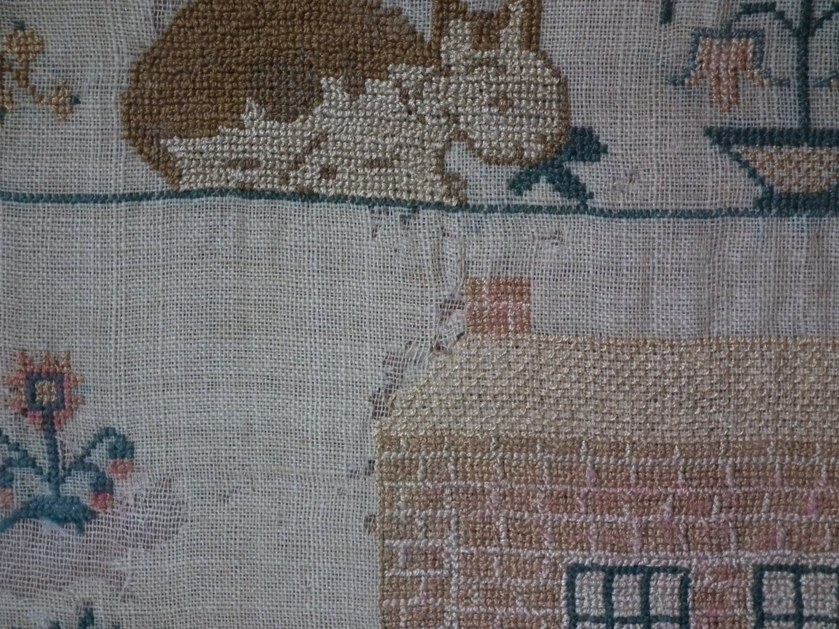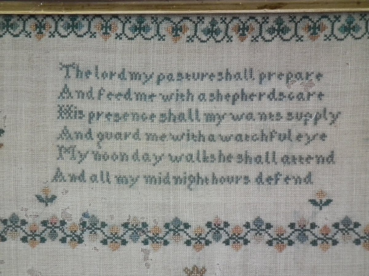 The sampler is finely worked in silk on linen ground, in a variety of stitches.