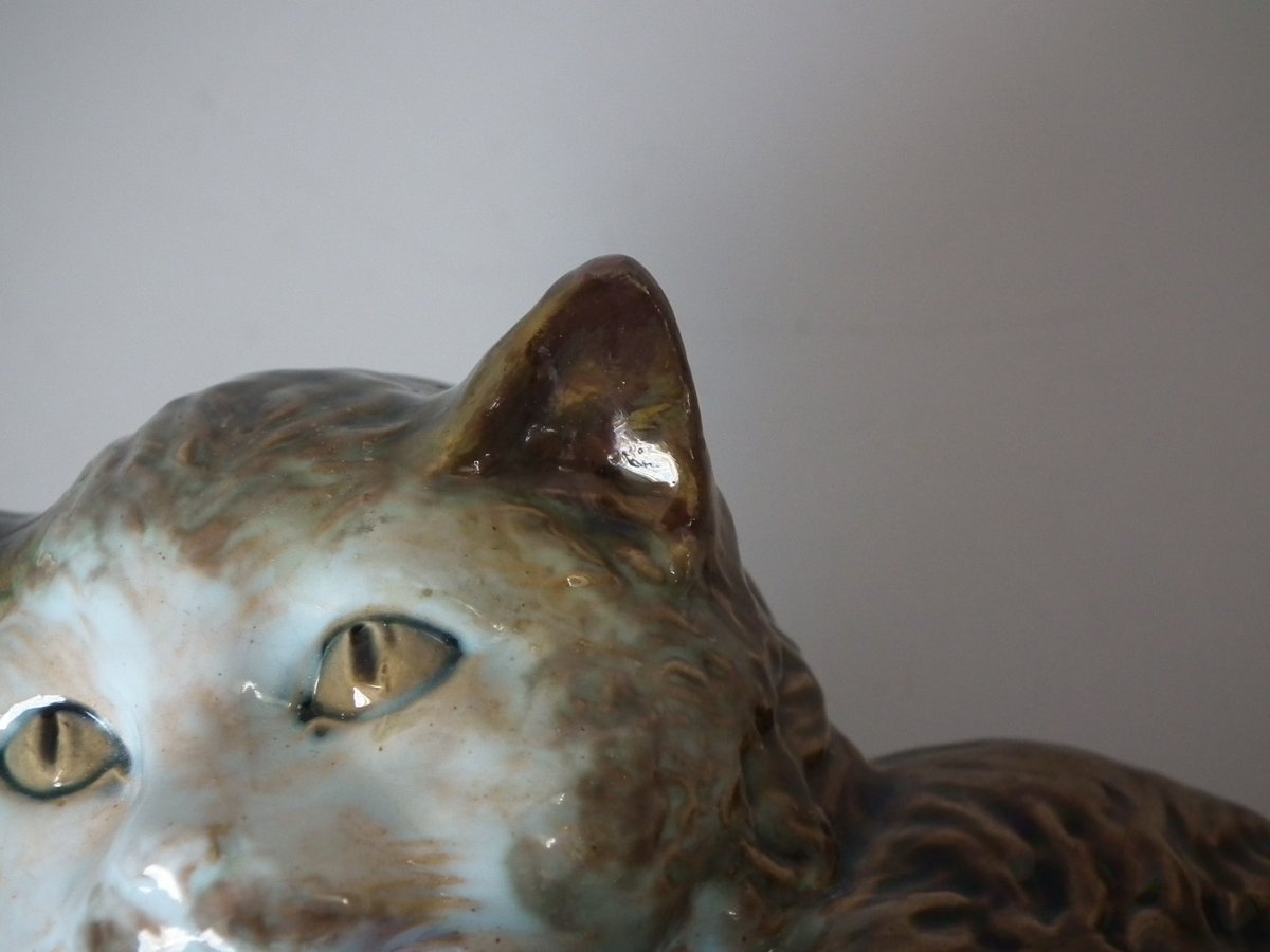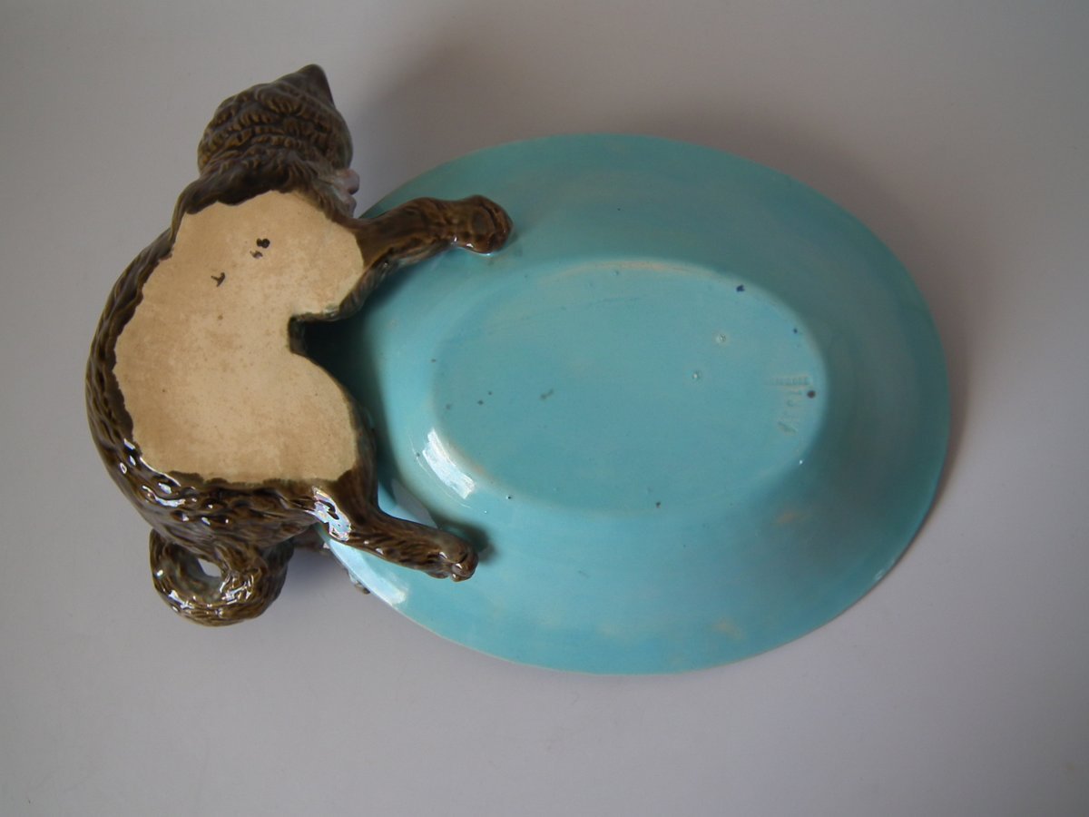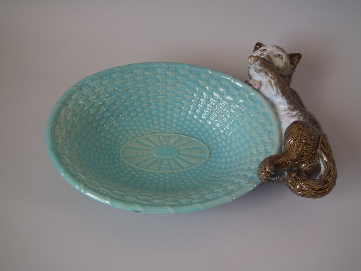 Victorian, circa 1875. 3.5ins high, 9.1ins wide, 8.7ins depth. Brownfield Majolica dish which features a basket with a cat to the rim.