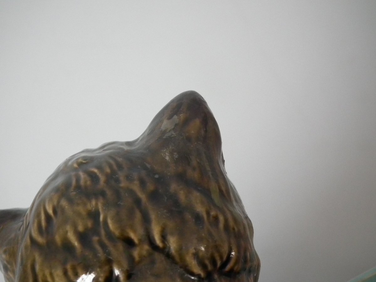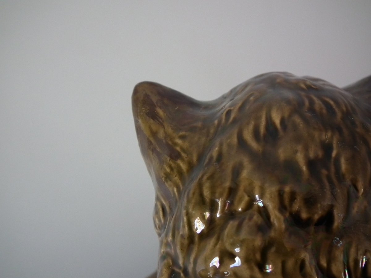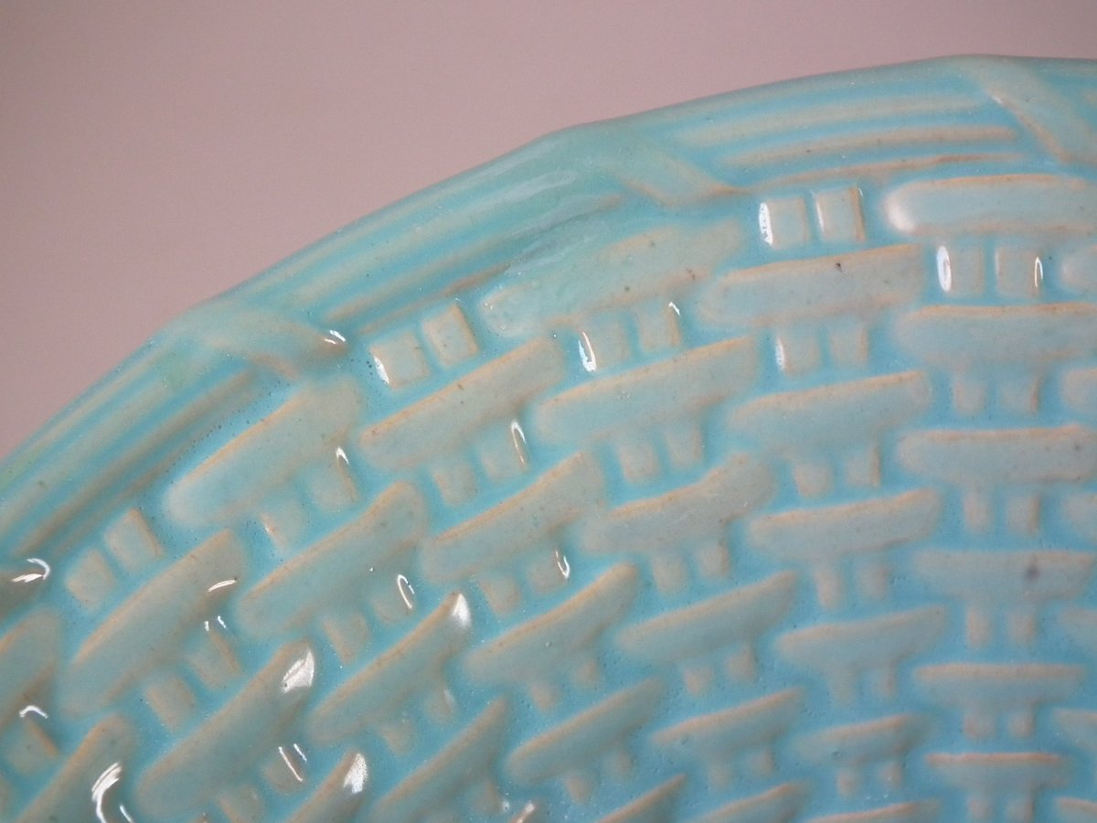 Victorian, circa 1875. 3.5ins high, 9.1ins wide, 8.7ins depth. Brownfield Majolica dish which features a basket with a cat to the rim.