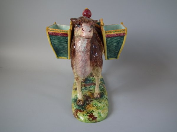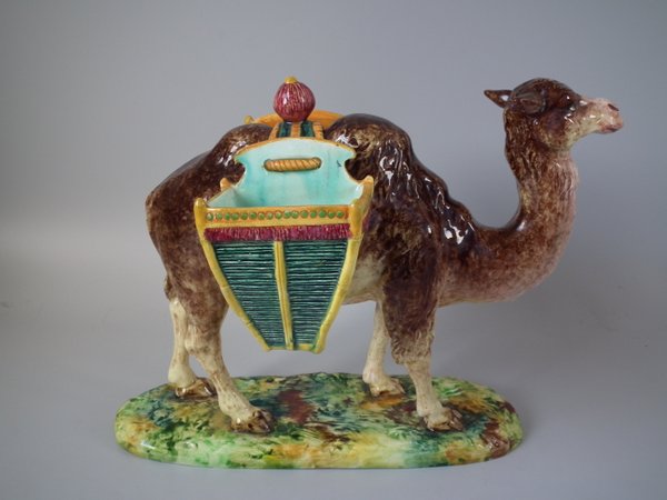 Victorian, circa 1900. 9.8ins high, 12.6ins wide, 7.9ins depth. Jerome Massier Majolica figural which features a camel