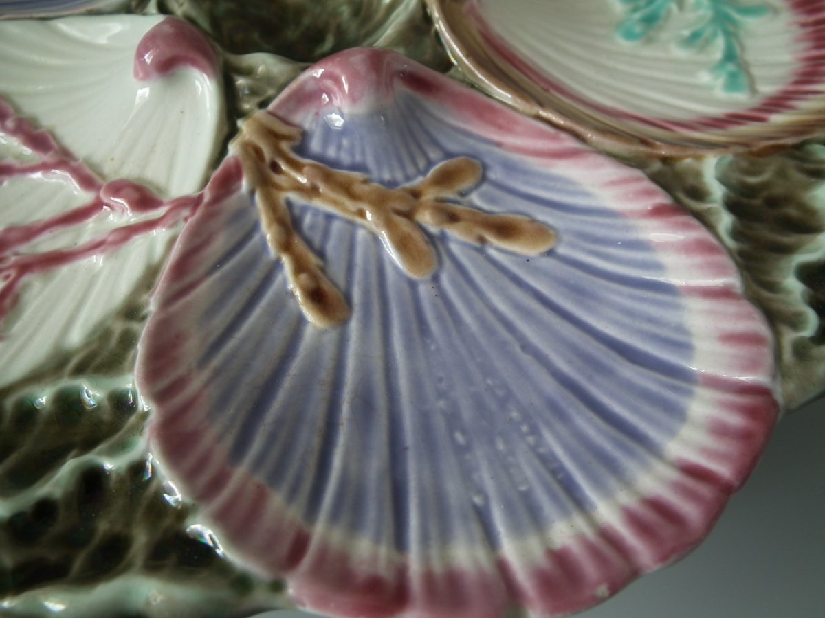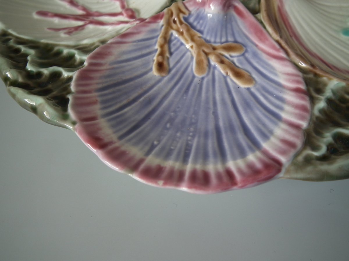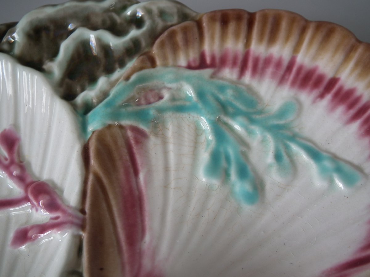 Victorian, circa 1880. 9.1ins high, 9.1ins wide, 0.8ins depth. Wedgwood Argenta Majolica oyster plate which features scallop shells, coral and wave edges.