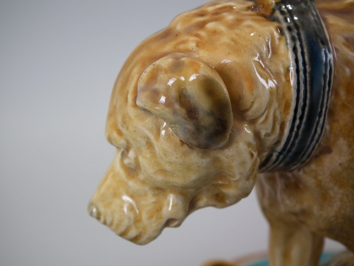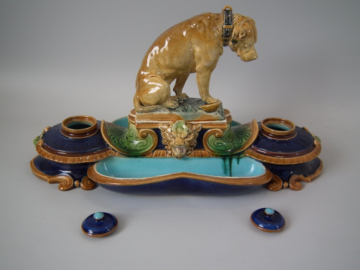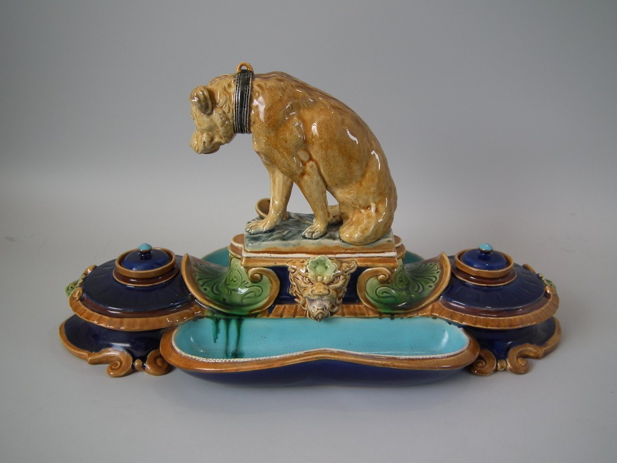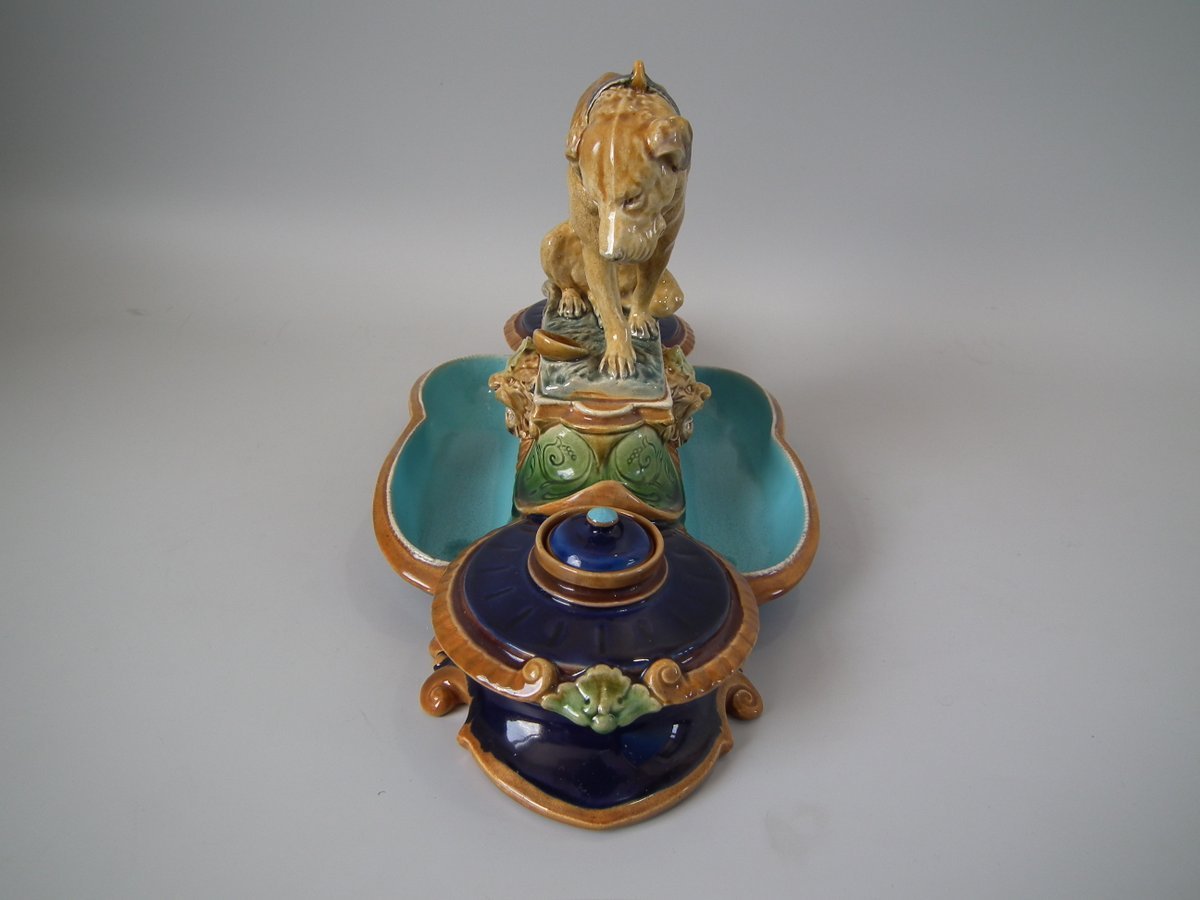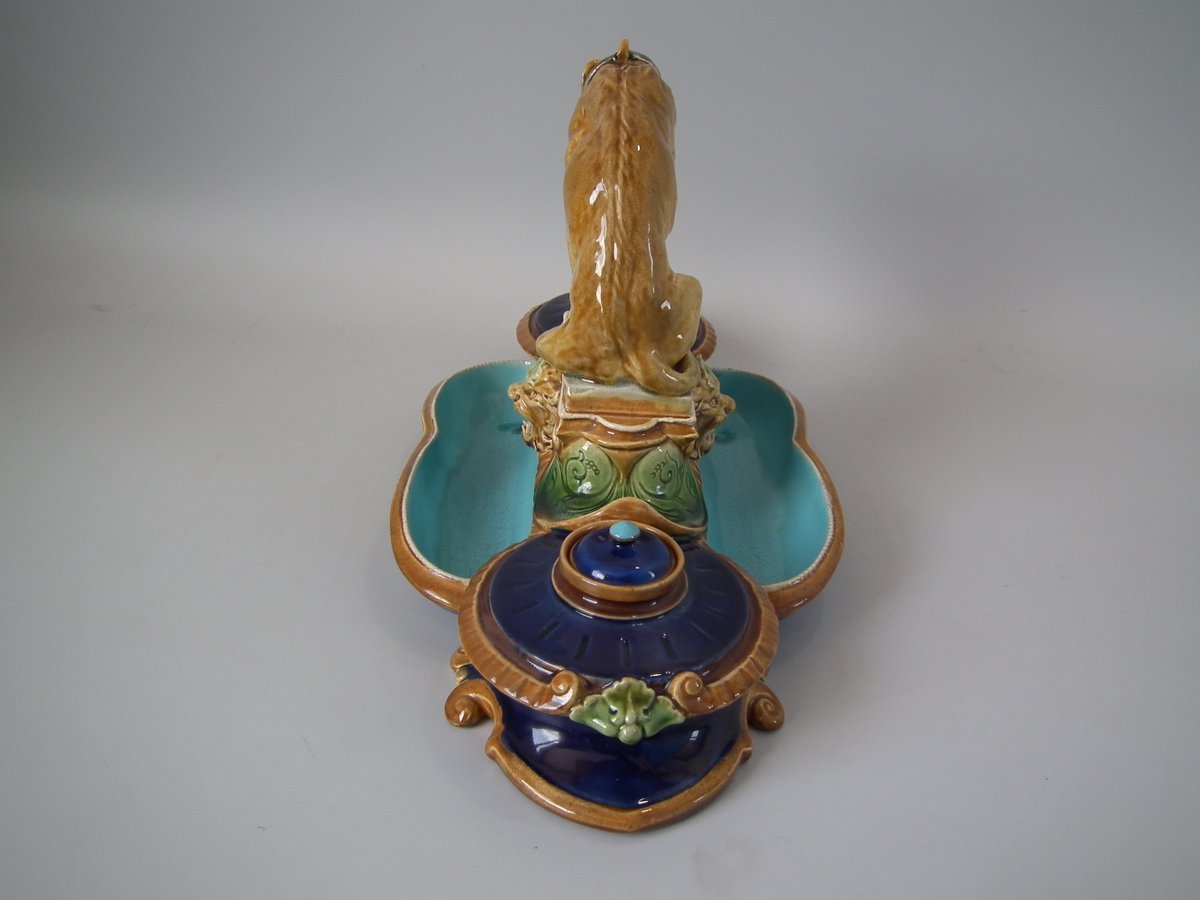 Victorian, circa 1876. 7.9ins high, 15.4ins wide, 7.1ins depth. Mintons Majolica desk stand which features a dog/hound sat on a plinth. Lidded inwells at either end and pen trays on both sides.