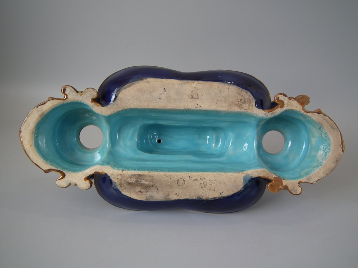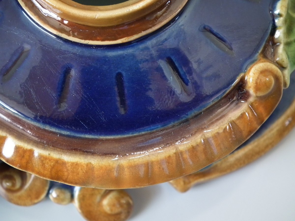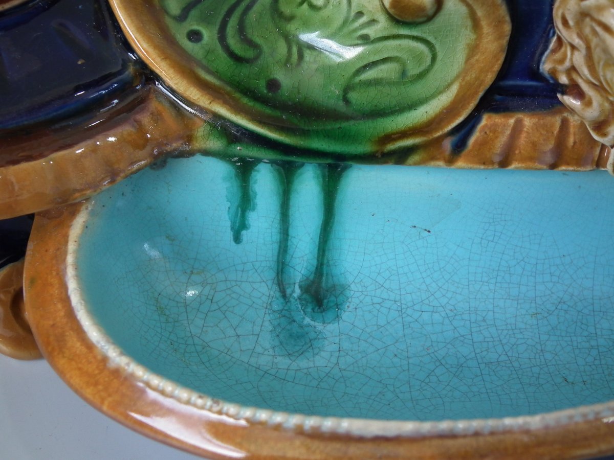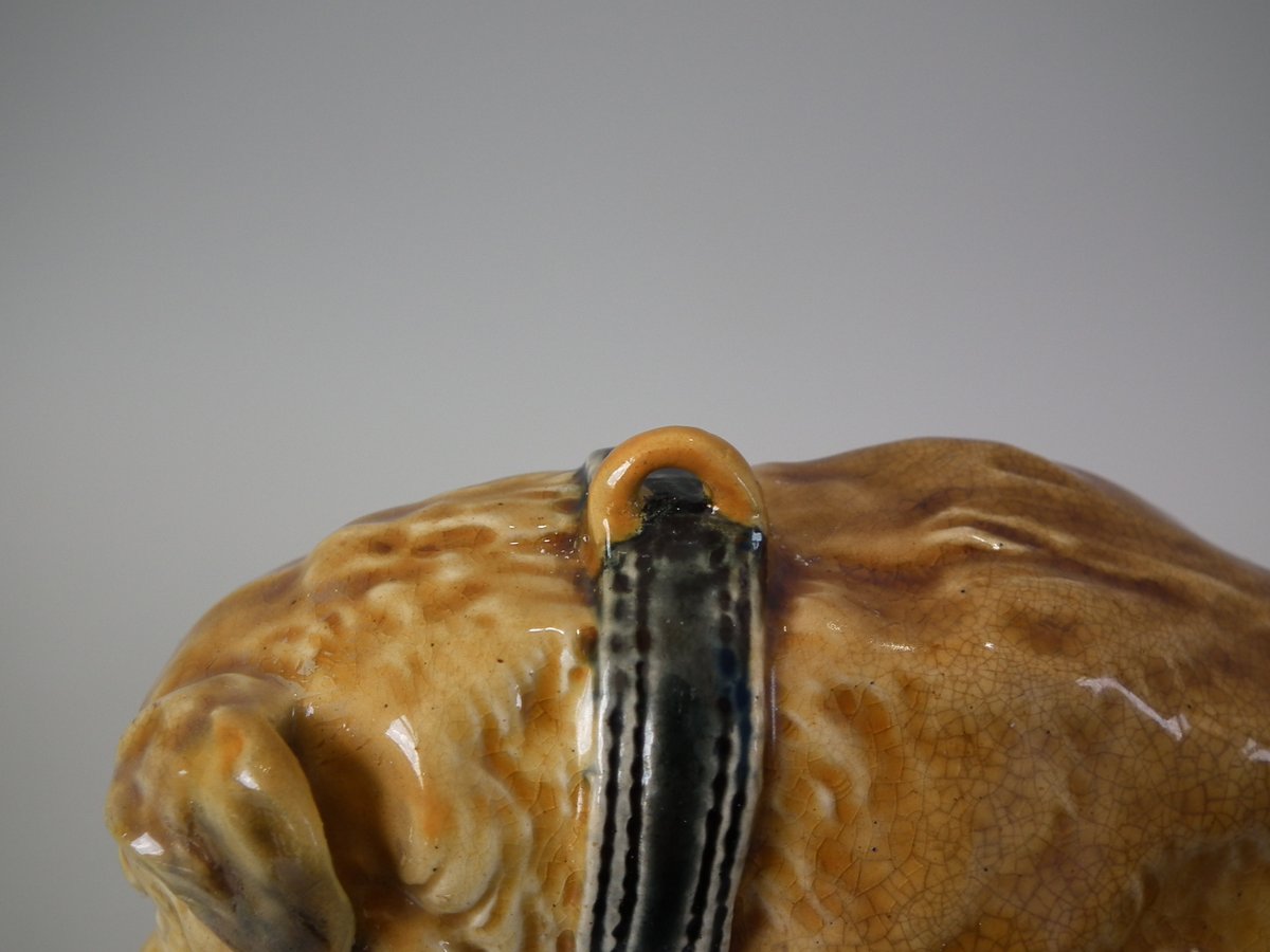 Victorian, circa 1876. 7.9ins high, 15.4ins wide, 7.1ins depth. Mintons Majolica desk stand which features a dog/hound sat on a plinth. Lidded inwells at either end and pen trays on both sides.
