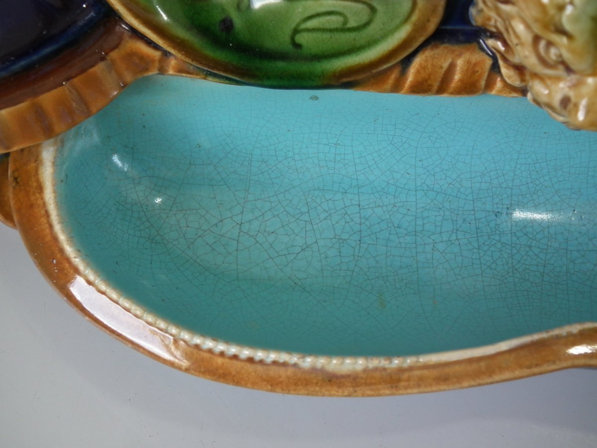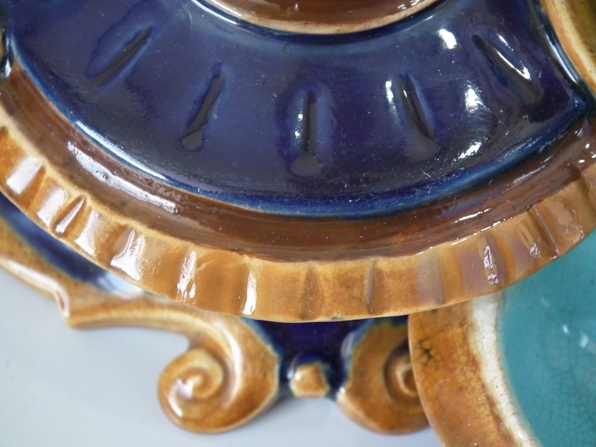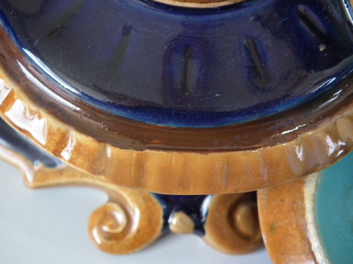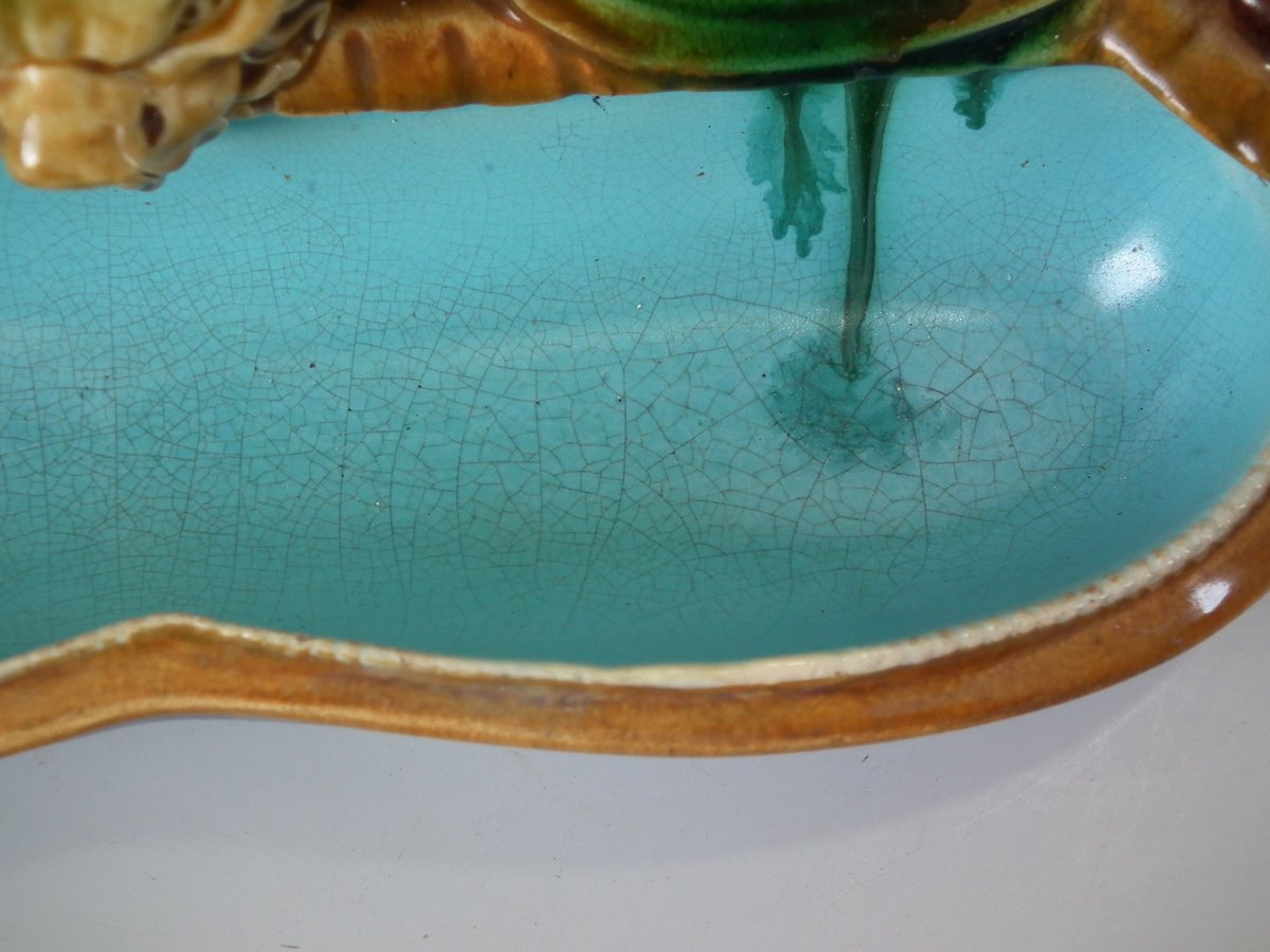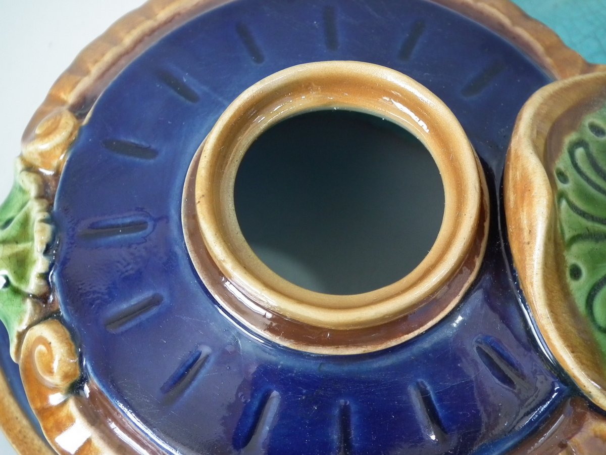 Victorian, circa 1876. 7.9ins high, 15.4ins wide, 7.1ins depth. Mintons Majolica desk stand which features a dog/hound sat on a plinth. Lidded inwells at either end and pen trays on both sides.