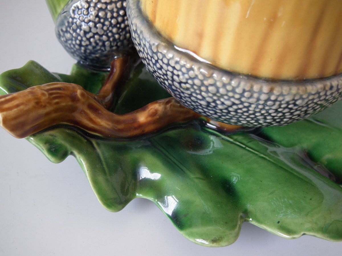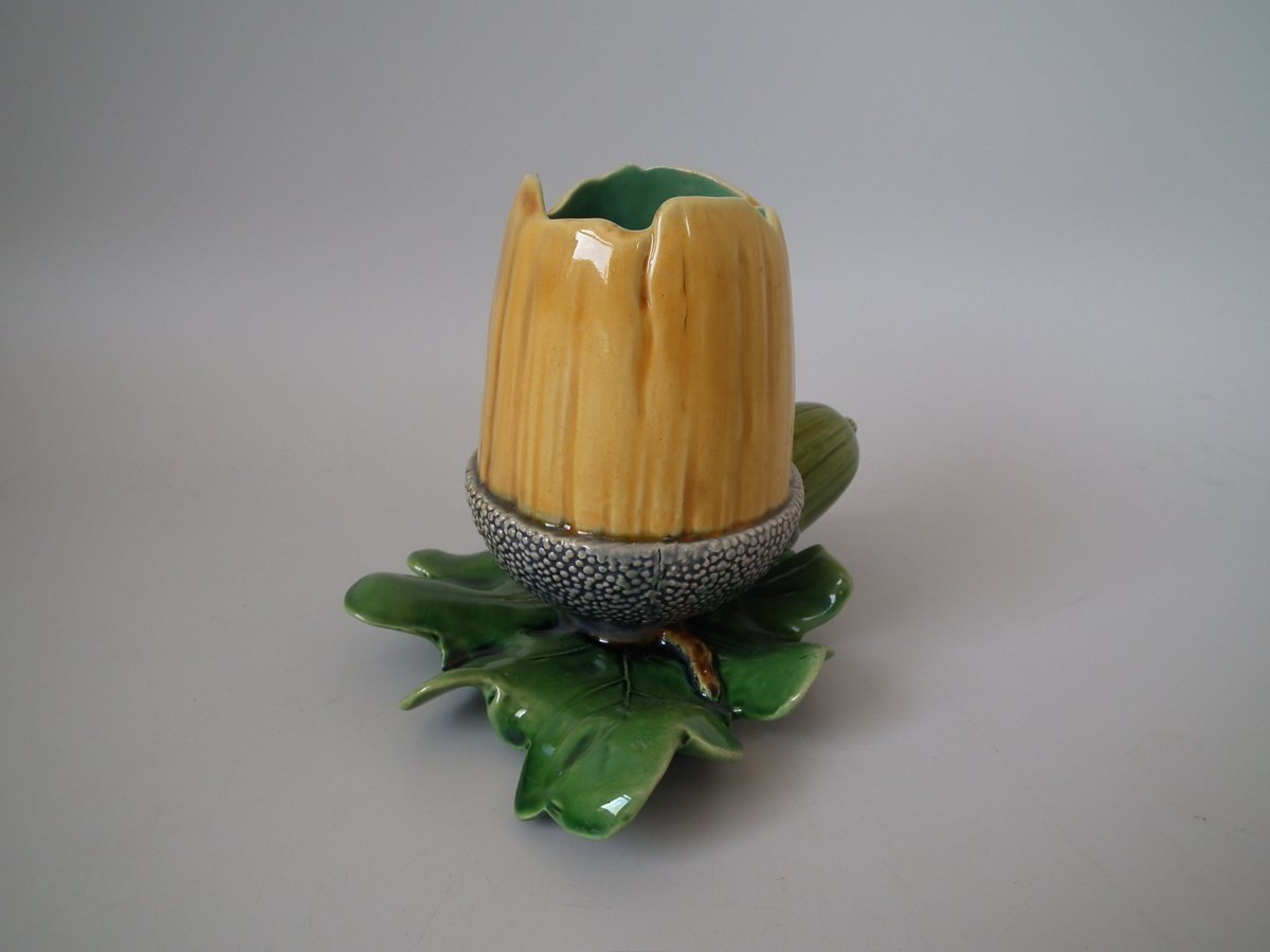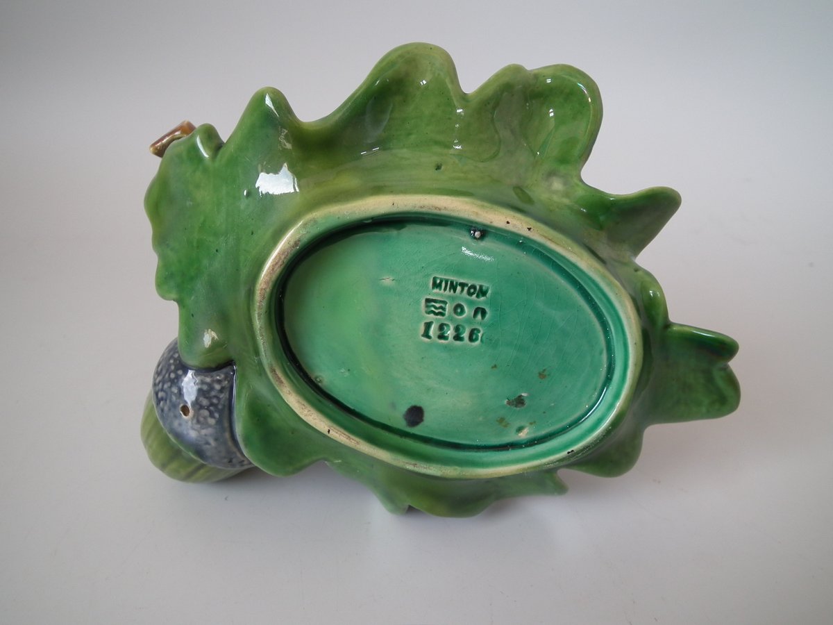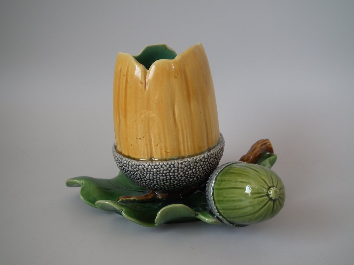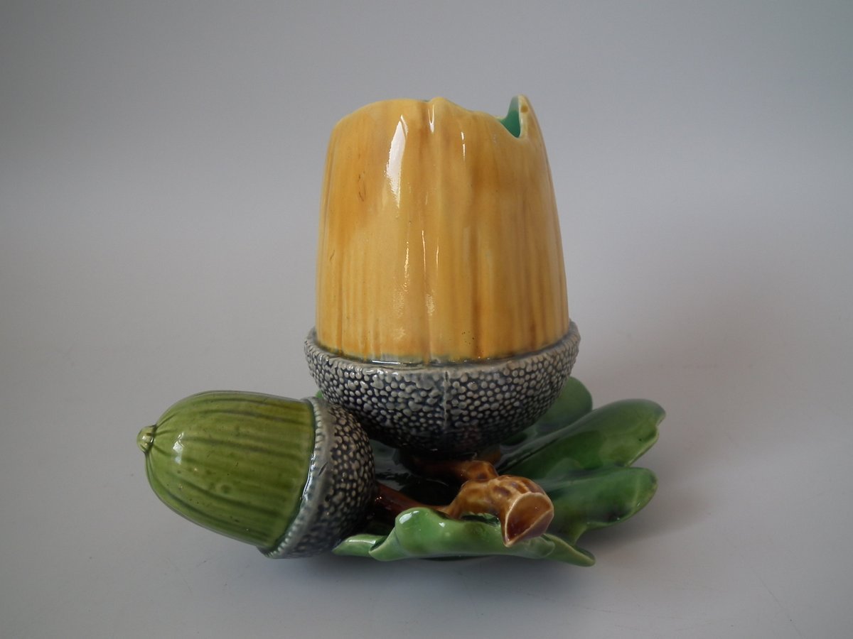 Victorian, circa 1865. 4.7ins high, 6.3ins wide, 6.7ins depth. Minton Majolica vase which features acorns & oak leaves.