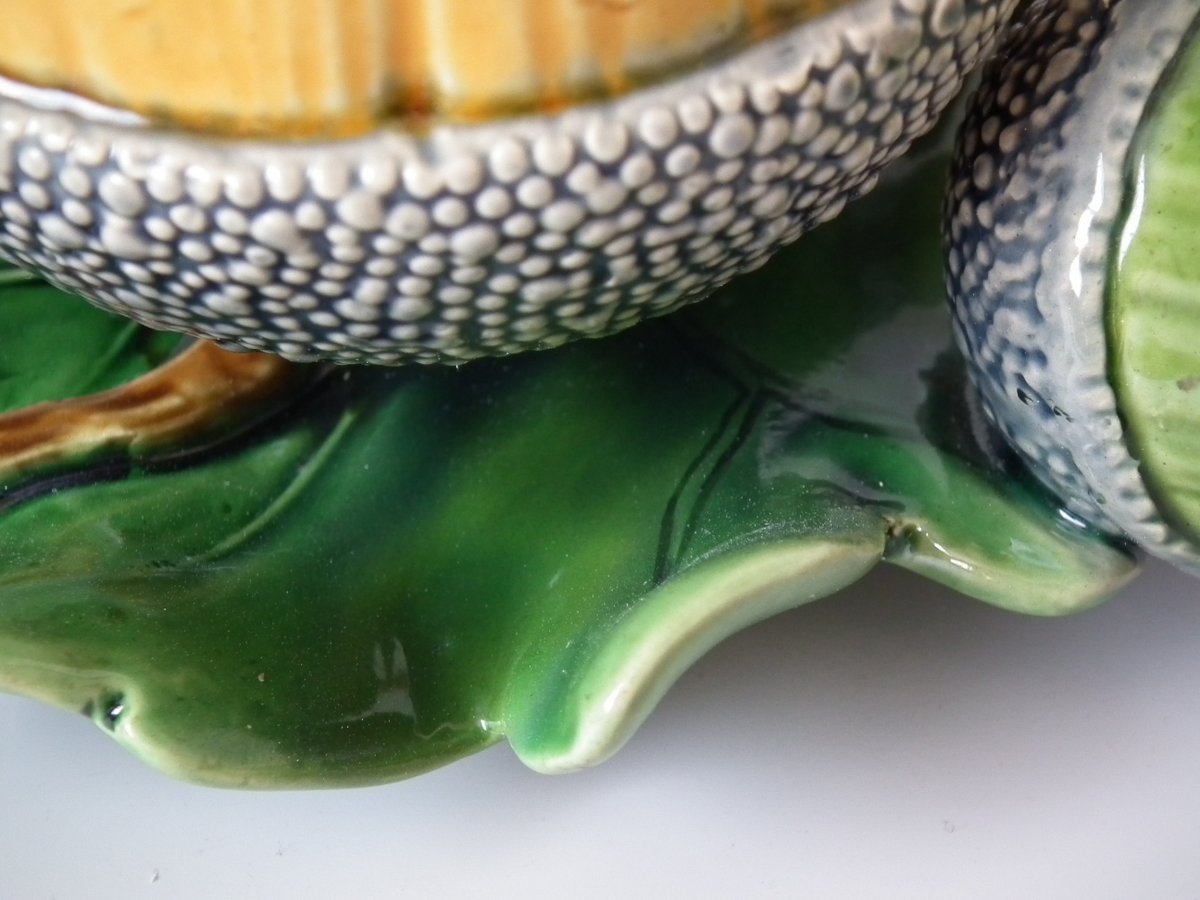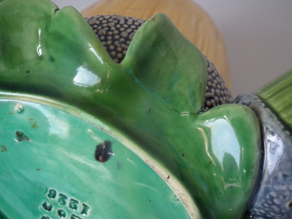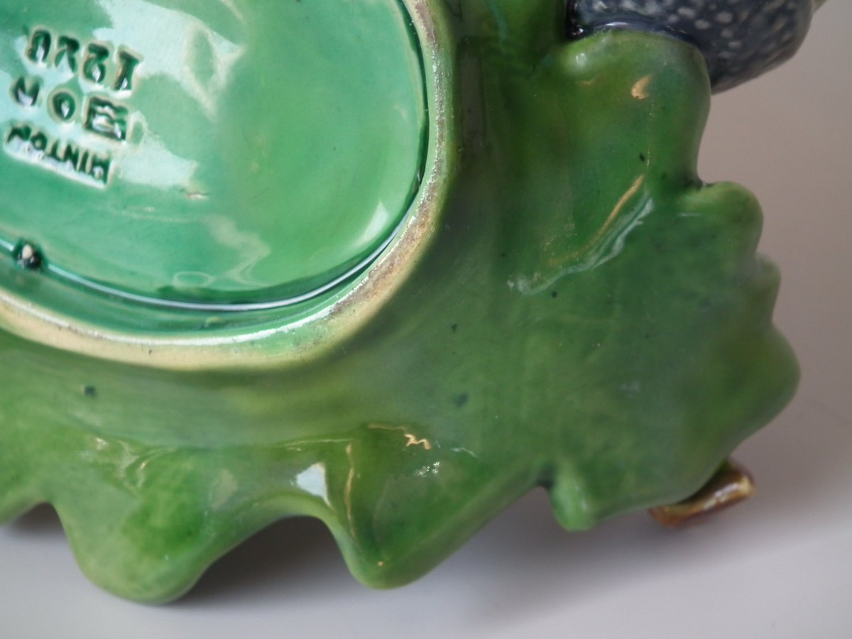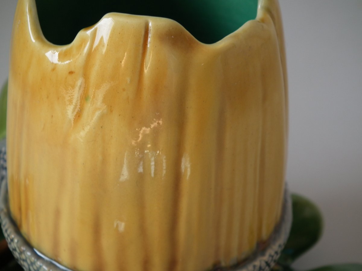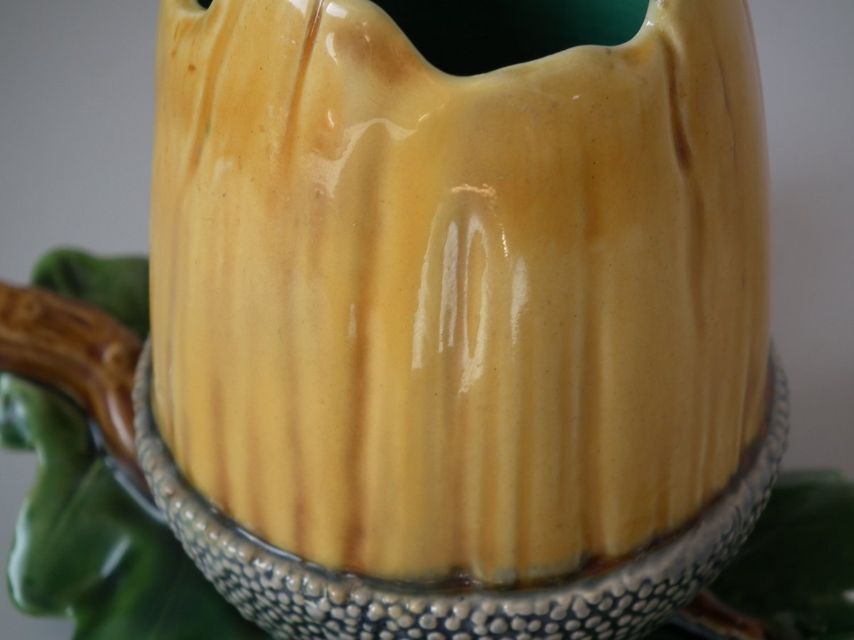 Victorian, circa 1865. 4.7ins high, 6.3ins wide, 6.7ins depth. Minton Majolica vase which features acorns & oak leaves.