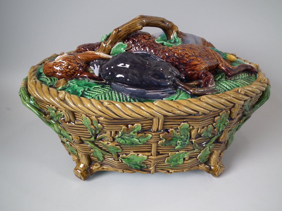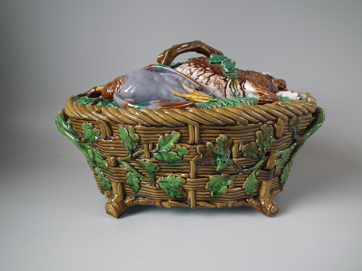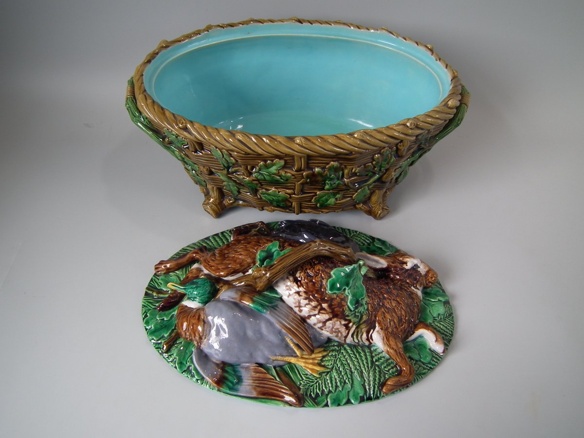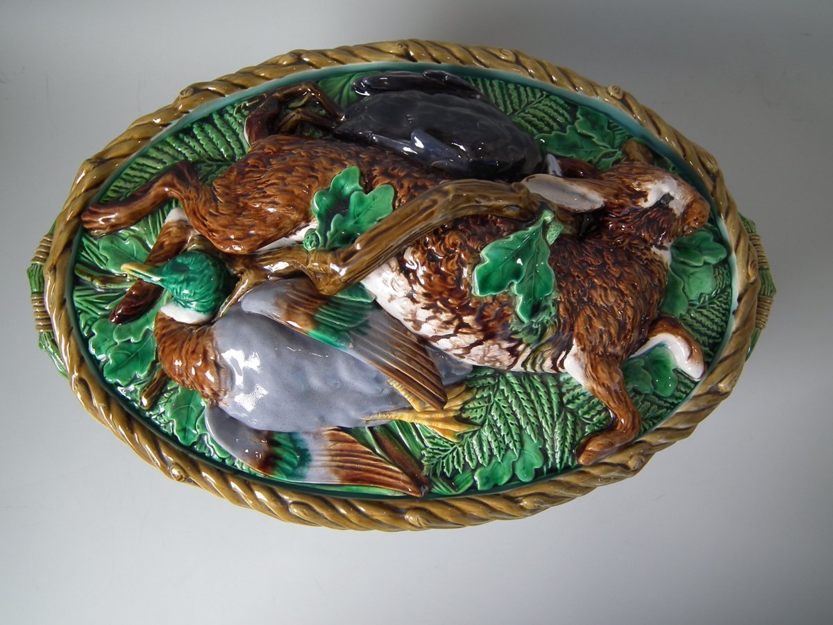 Victorian, circa 1860. 9.8ins high, 16.1ins wide, 10.2ins depth. Minton Majolica game pie dish which features a hare, mallard and blackbird on a bed of fern and oak leaves.