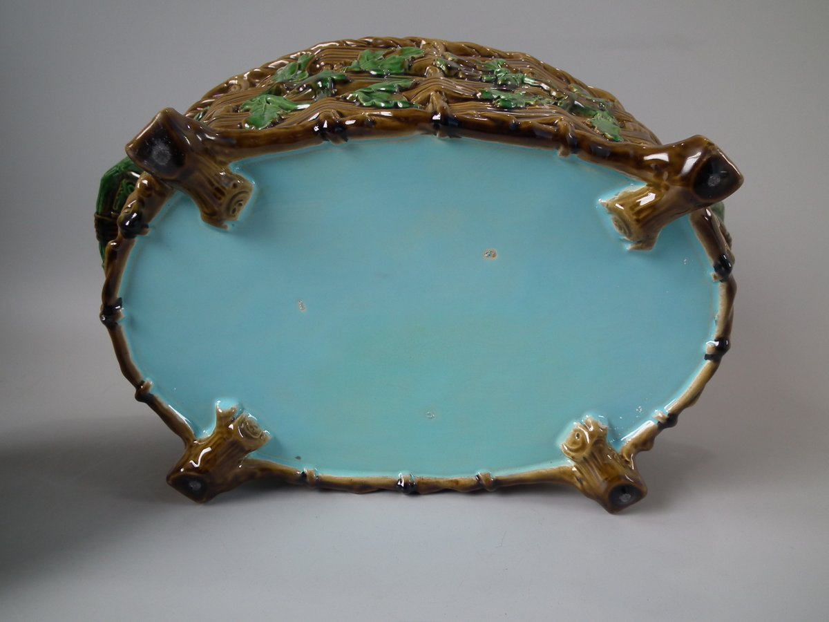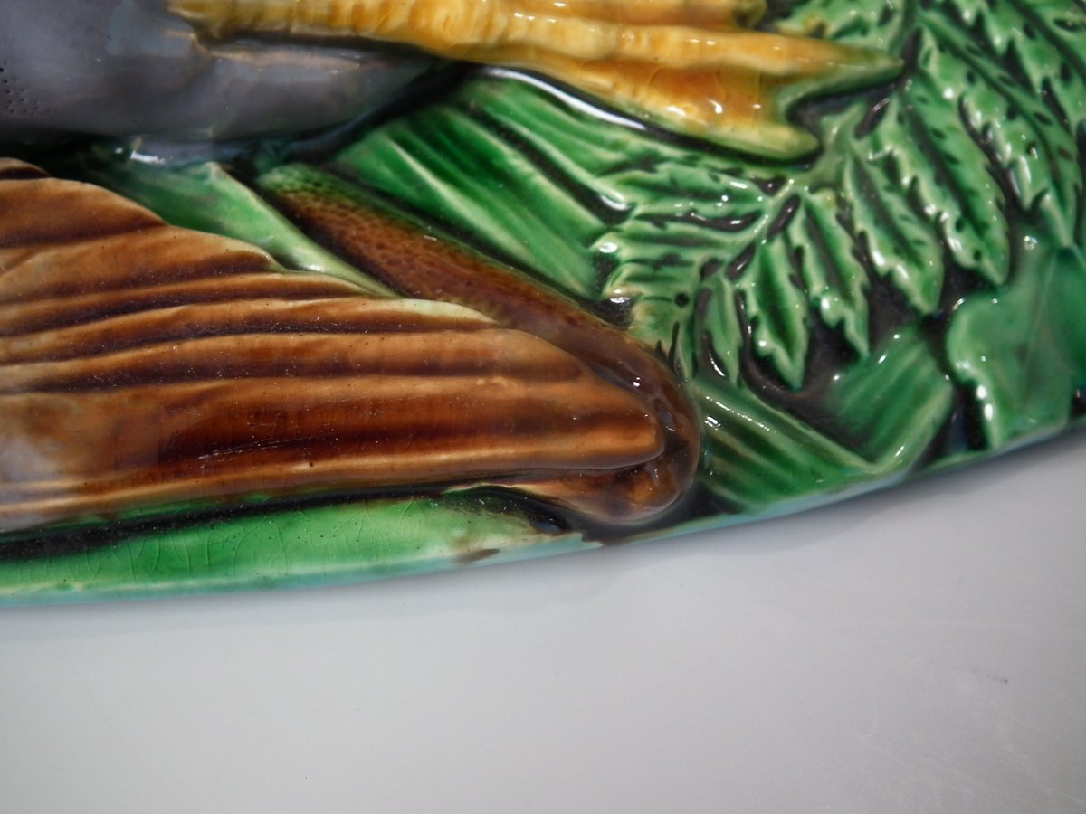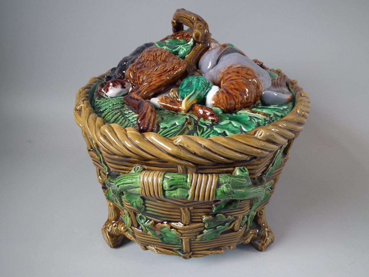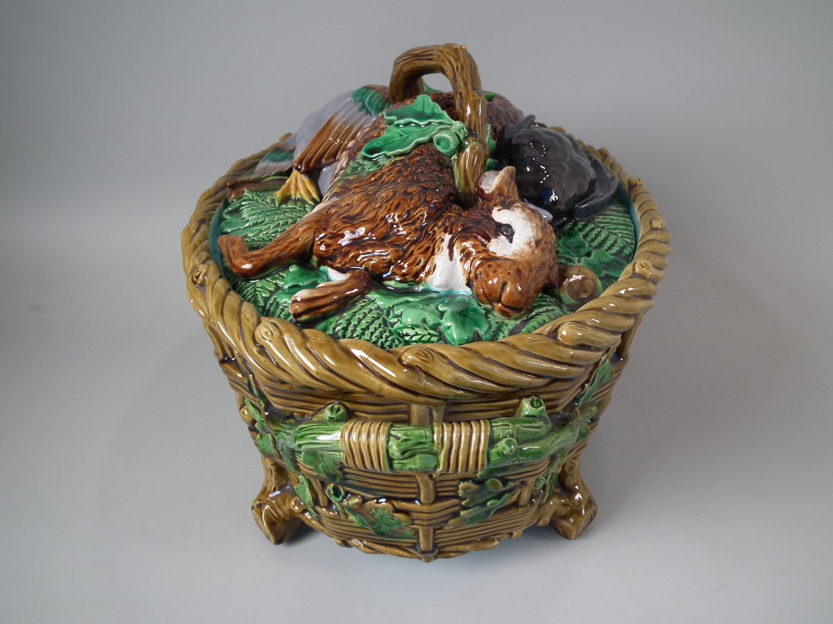 Victorian, circa 1860. 9.8ins high, 16.1ins wide, 10.2ins depth. Minton Majolica game pie dish which features a hare, mallard and blackbird on a bed of fern and oak leaves.