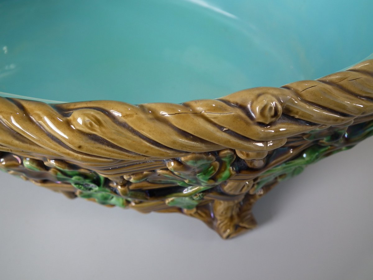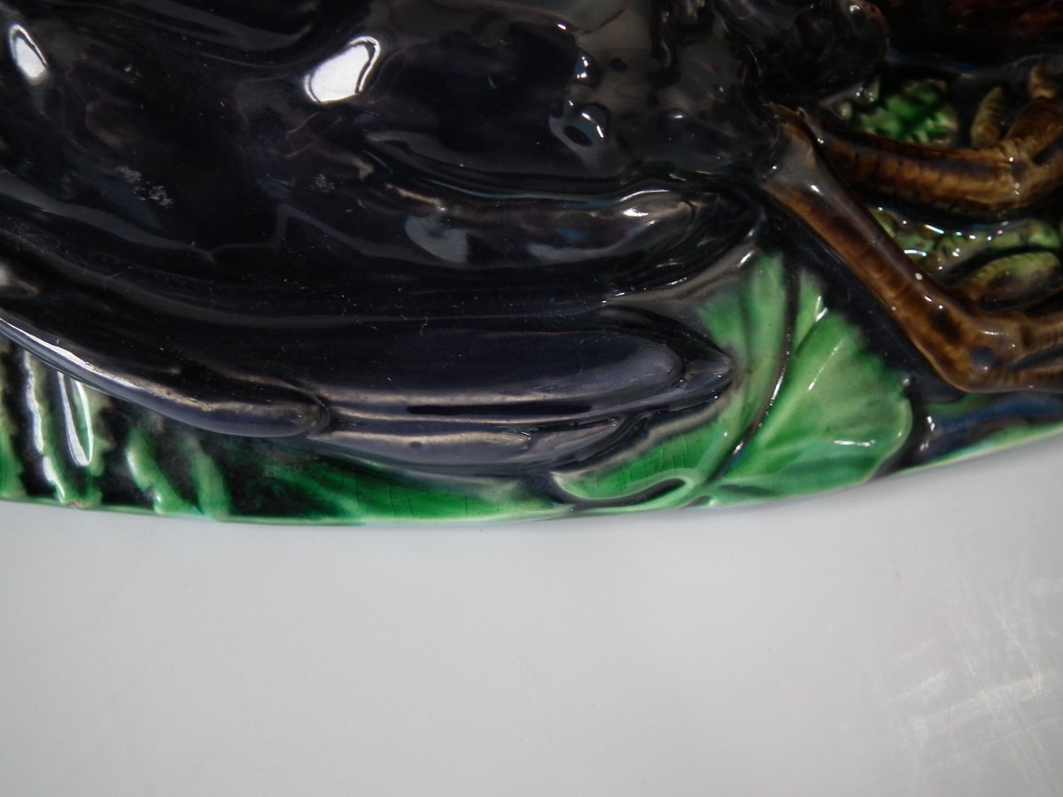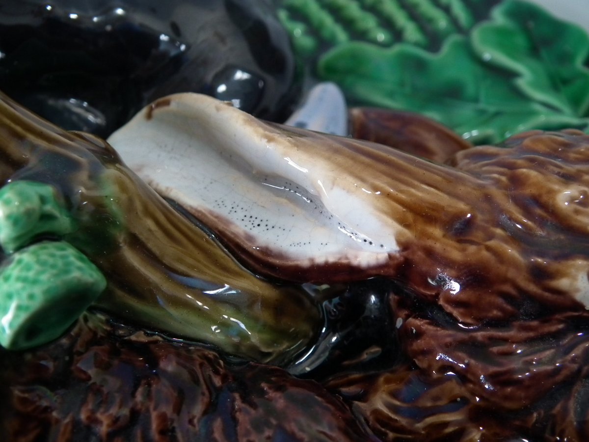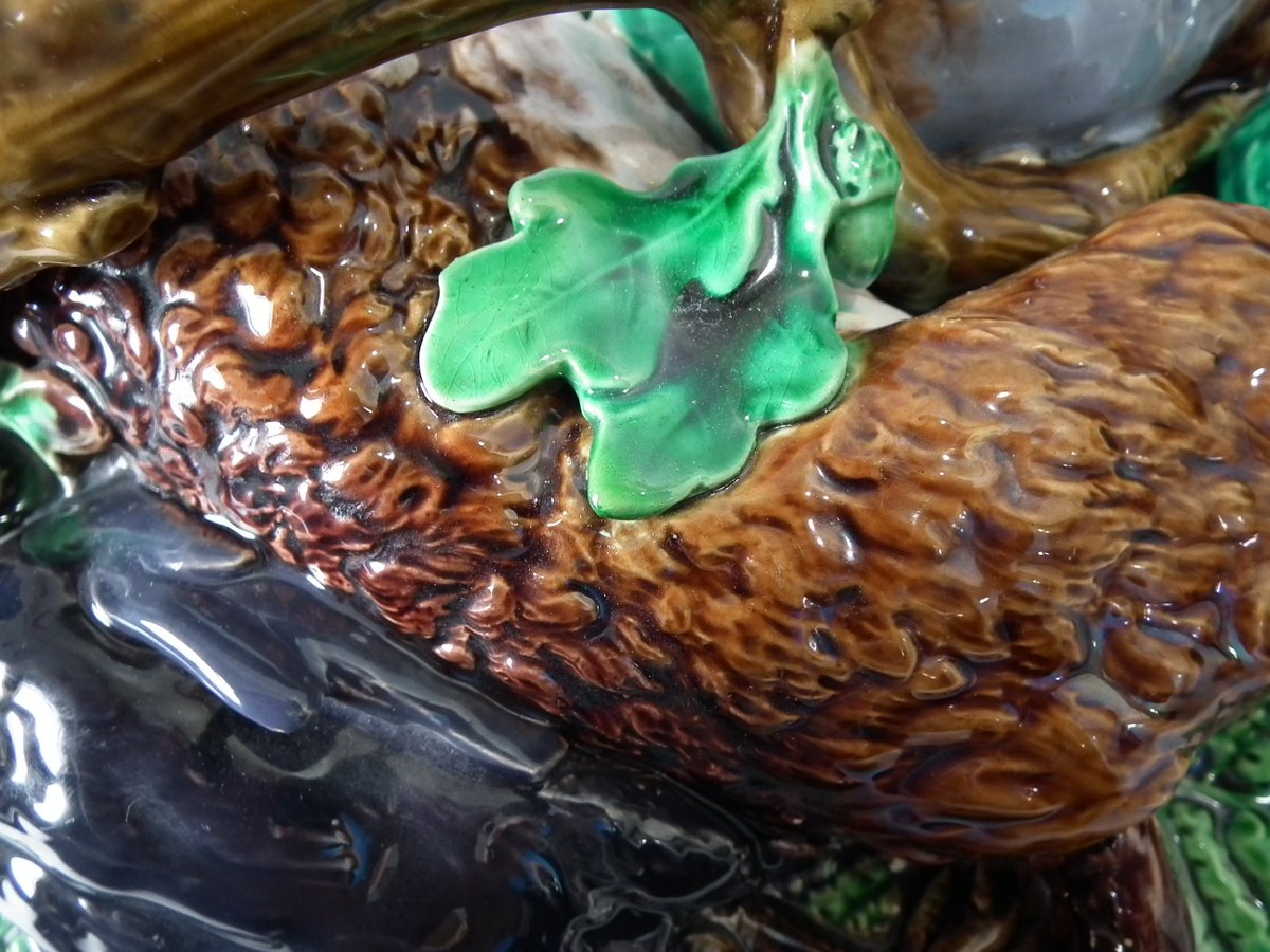 Victorian, circa 1860. 9.8ins high, 16.1ins wide, 10.2ins depth. Minton Majolica game pie dish which features a hare, mallard and blackbird on a bed of fern and oak leaves.