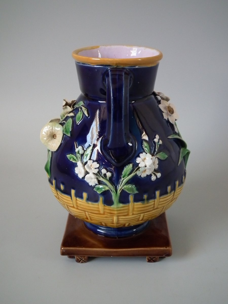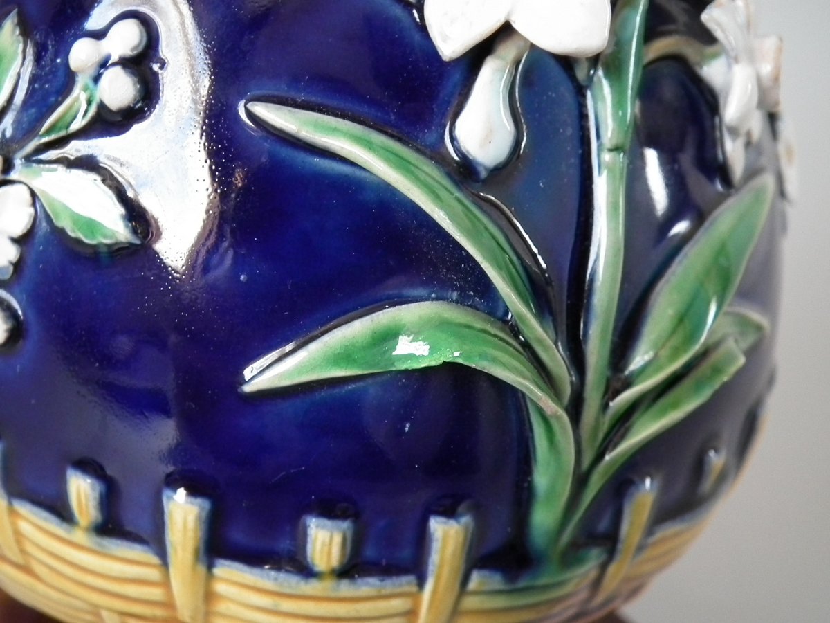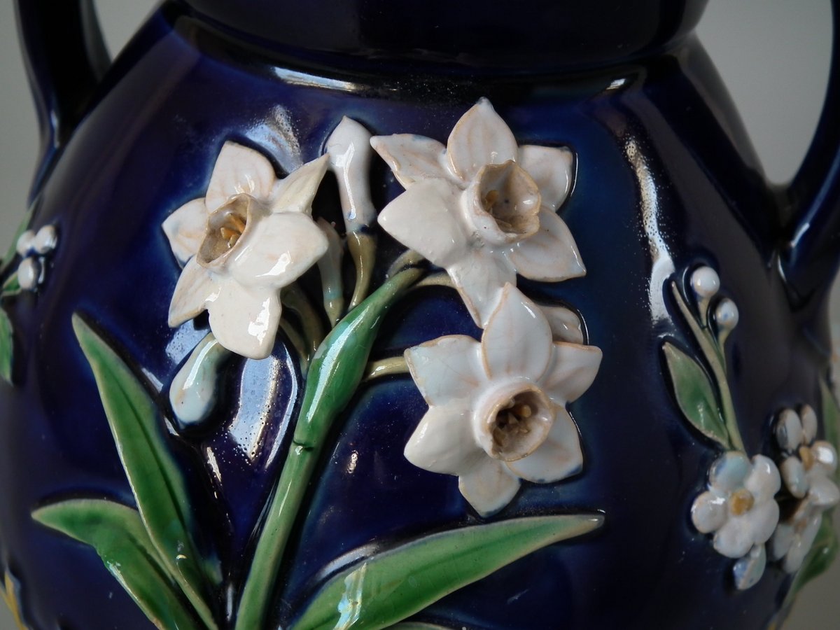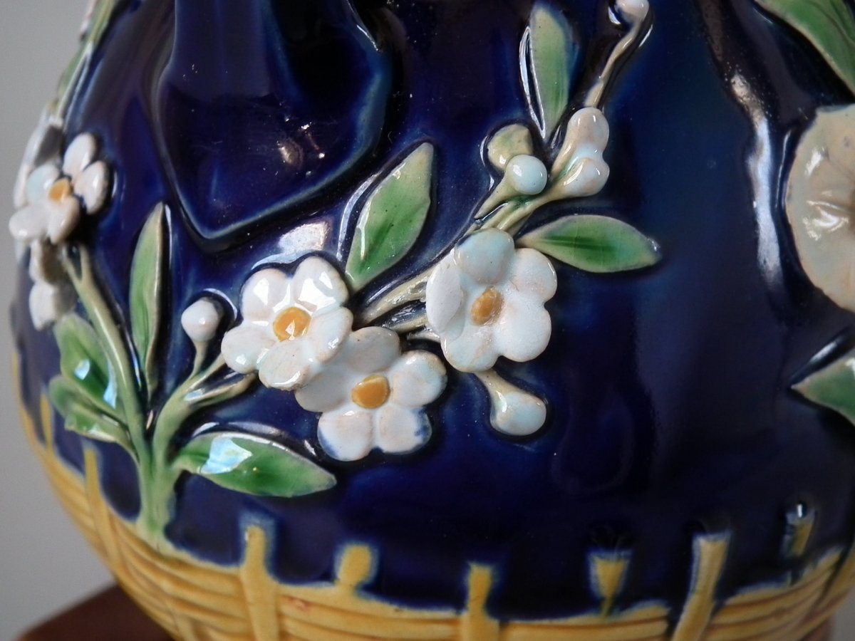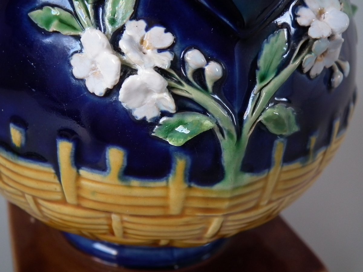 Victorian, circa 1869. 6.7ins high, 4.7ins wide, 4.7ins depth. Minton Majolica vase which features flowers (daffodils and another white flower)