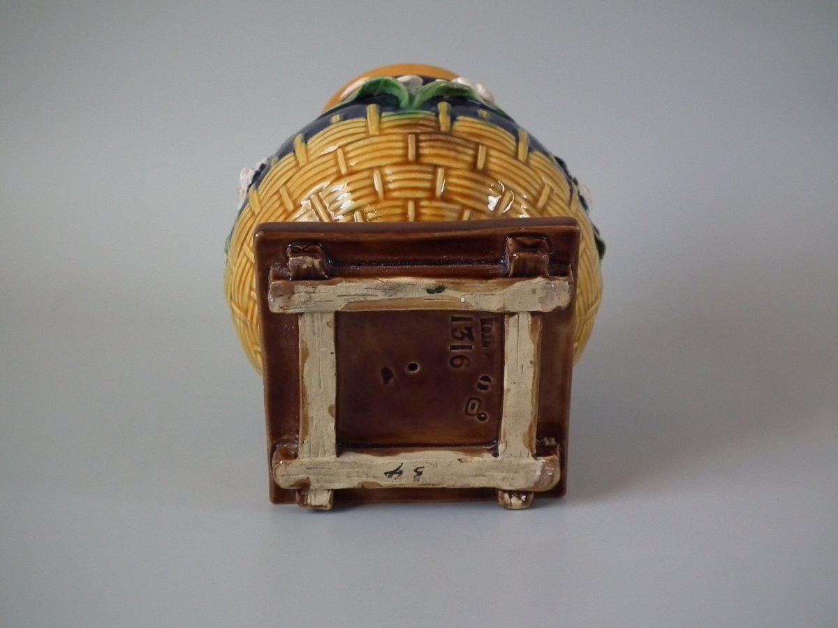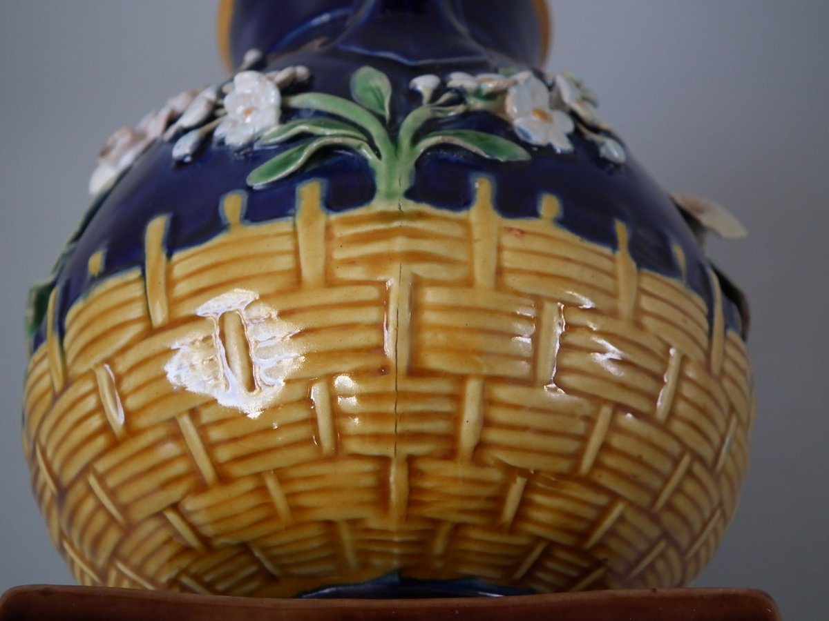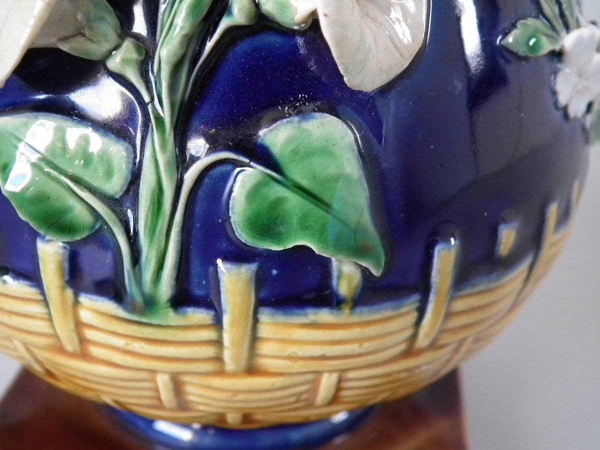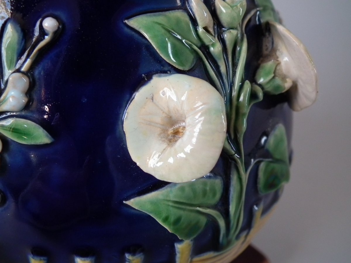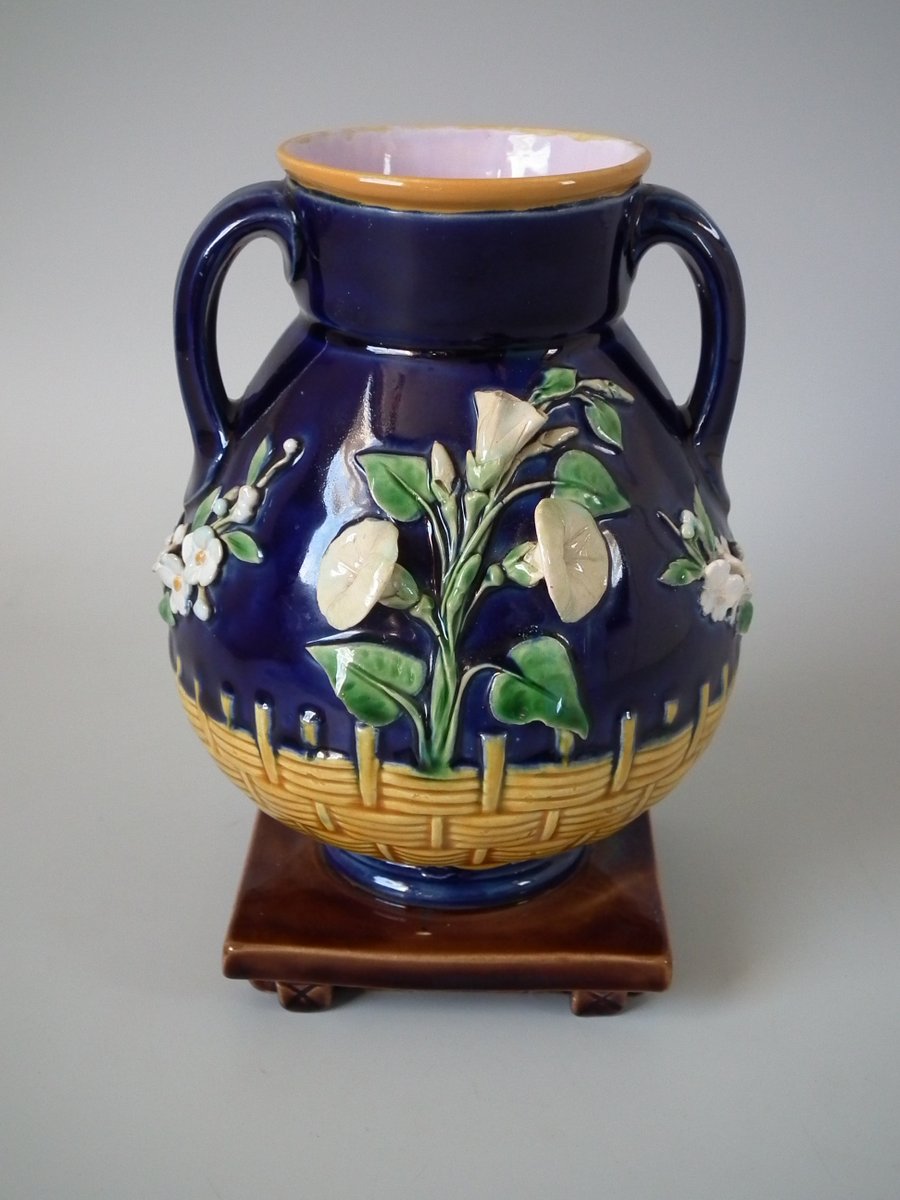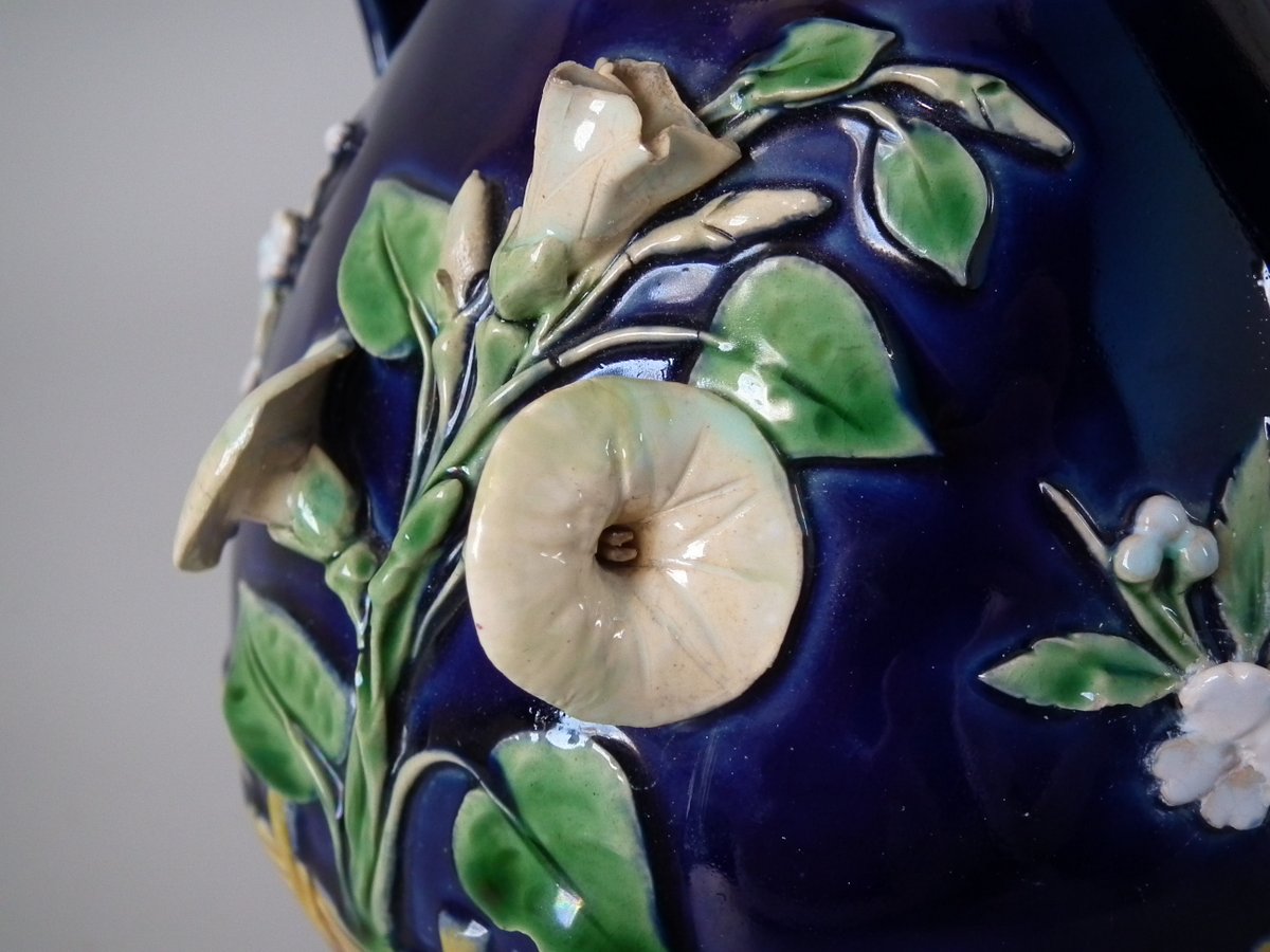 Victorian, circa 1869. 6.7ins high, 4.7ins wide, 4.7ins depth. Minton Majolica vase which features flowers (daffodils and another white flower)