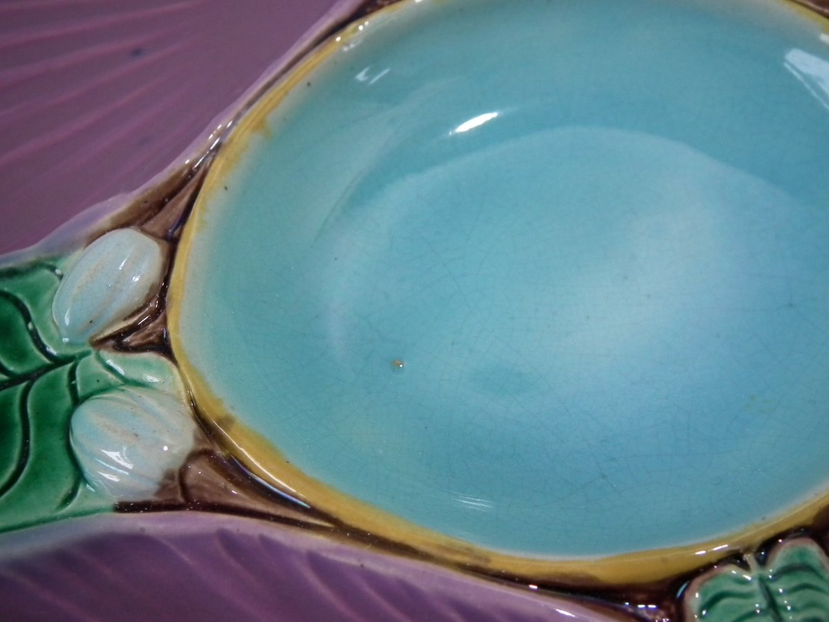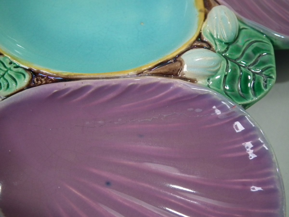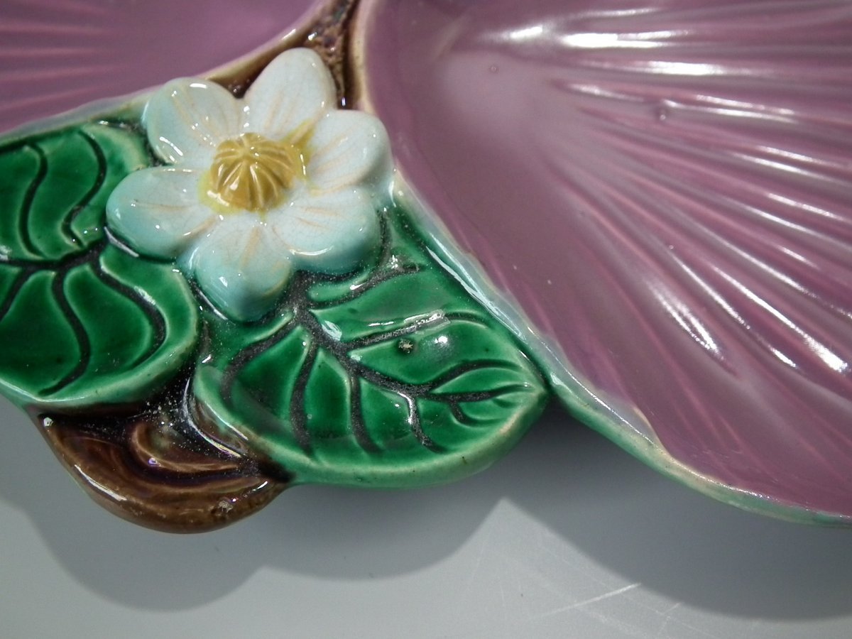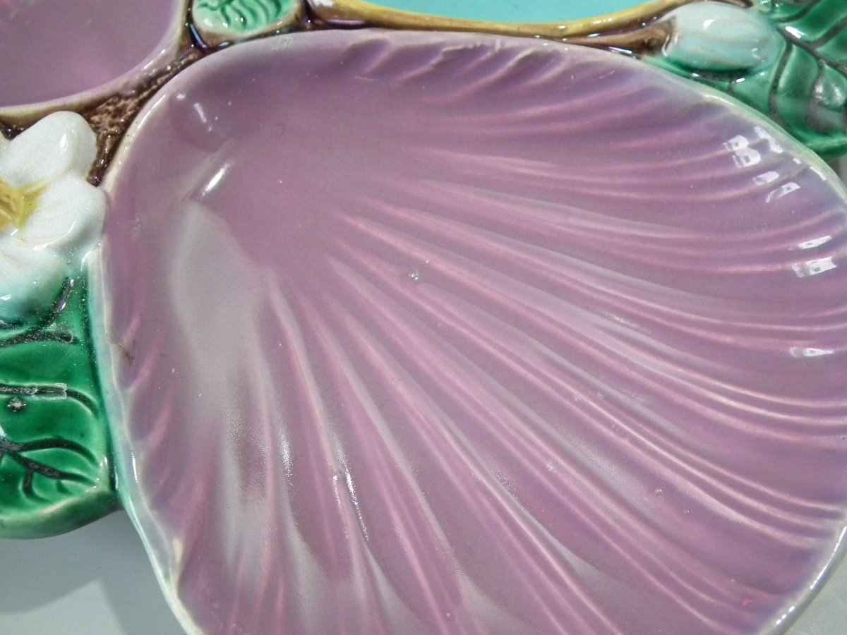 Victorian, circa 1880. 7.1ins high, 9.3ins wide, 0.8ins depth. Holdcroft Majolica oyster plate which features scalloped shells and pond lilies.