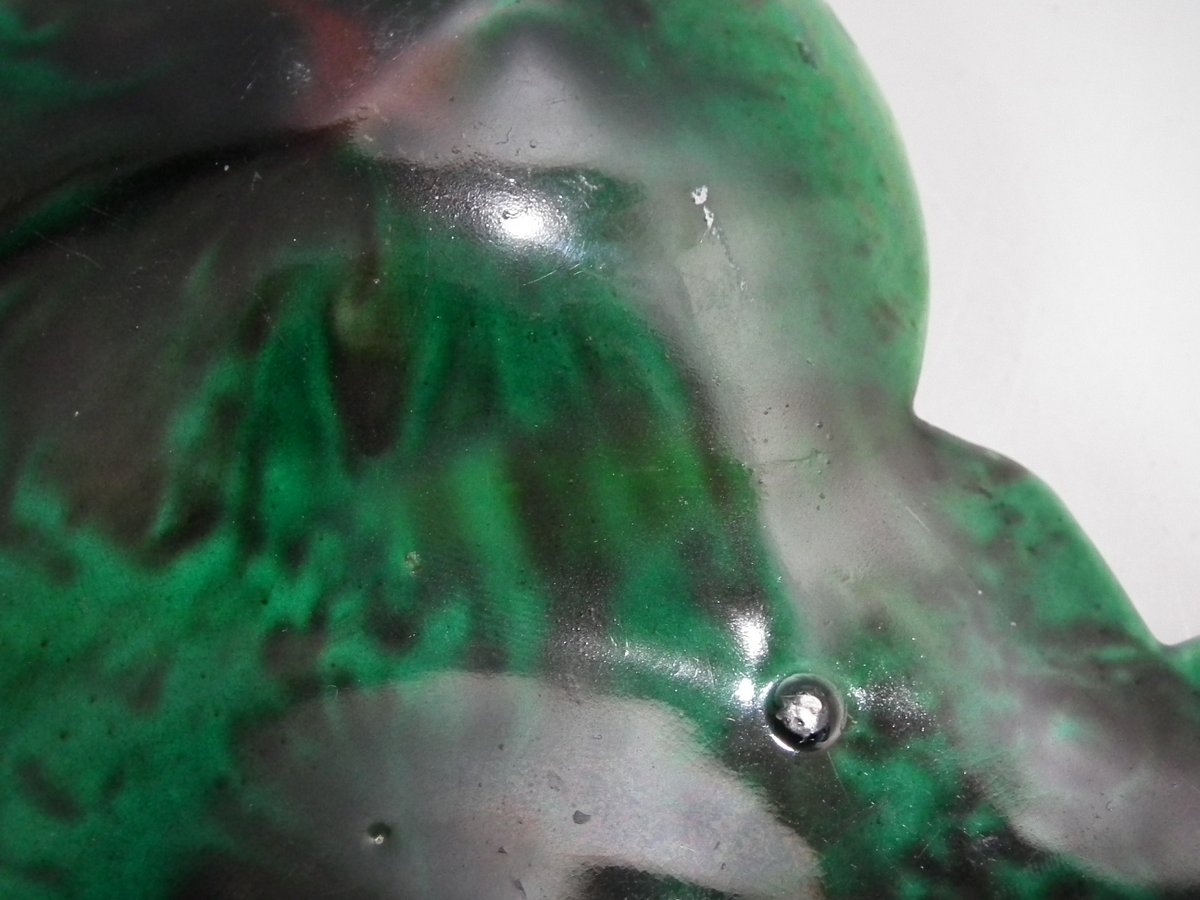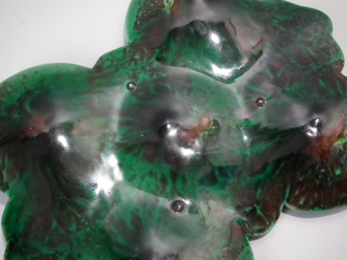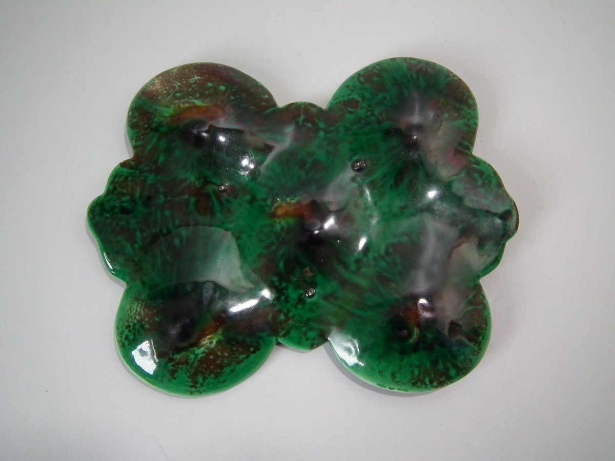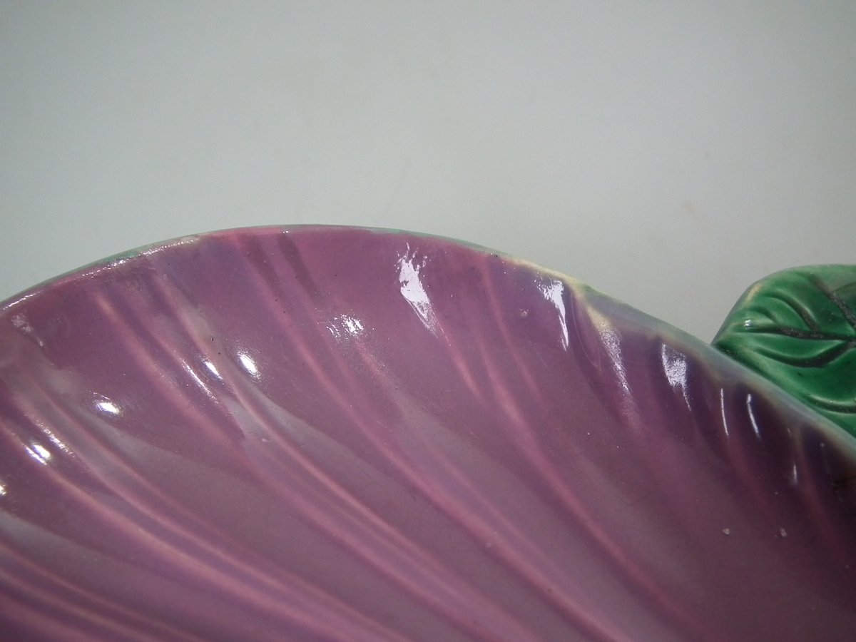 Victorian, circa 1880. 7.1ins high, 9.3ins wide, 0.8ins depth. Holdcroft Majolica oyster plate which features scalloped shells and pond lilies.