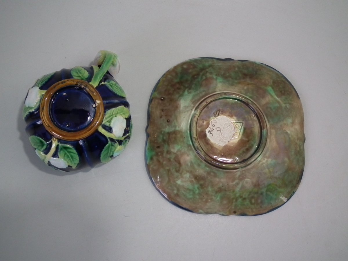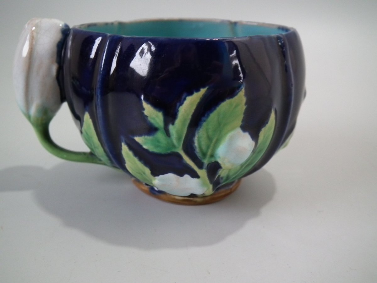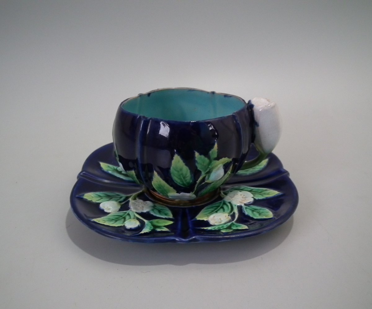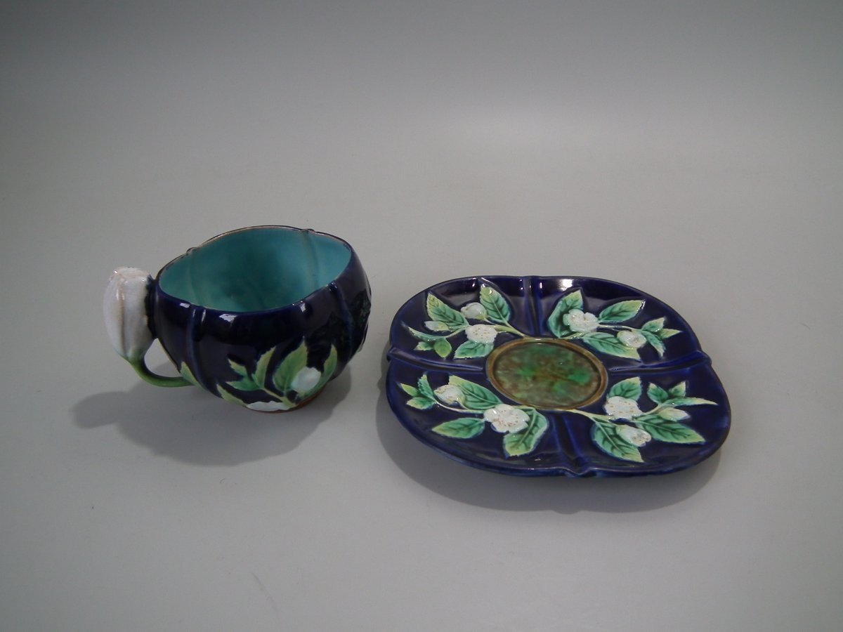 Victorian, circa 1873. 2.8ins high, 5.3ins wide, 5.3ins depth. George Jones Majolica cup & saucer which features white blossom (this cup forms part of the Monkey tea set).